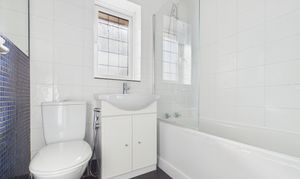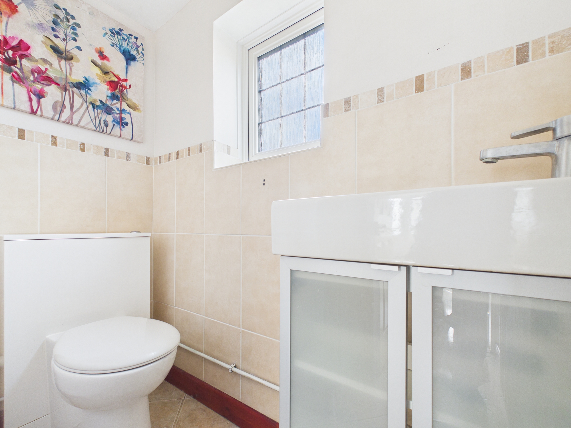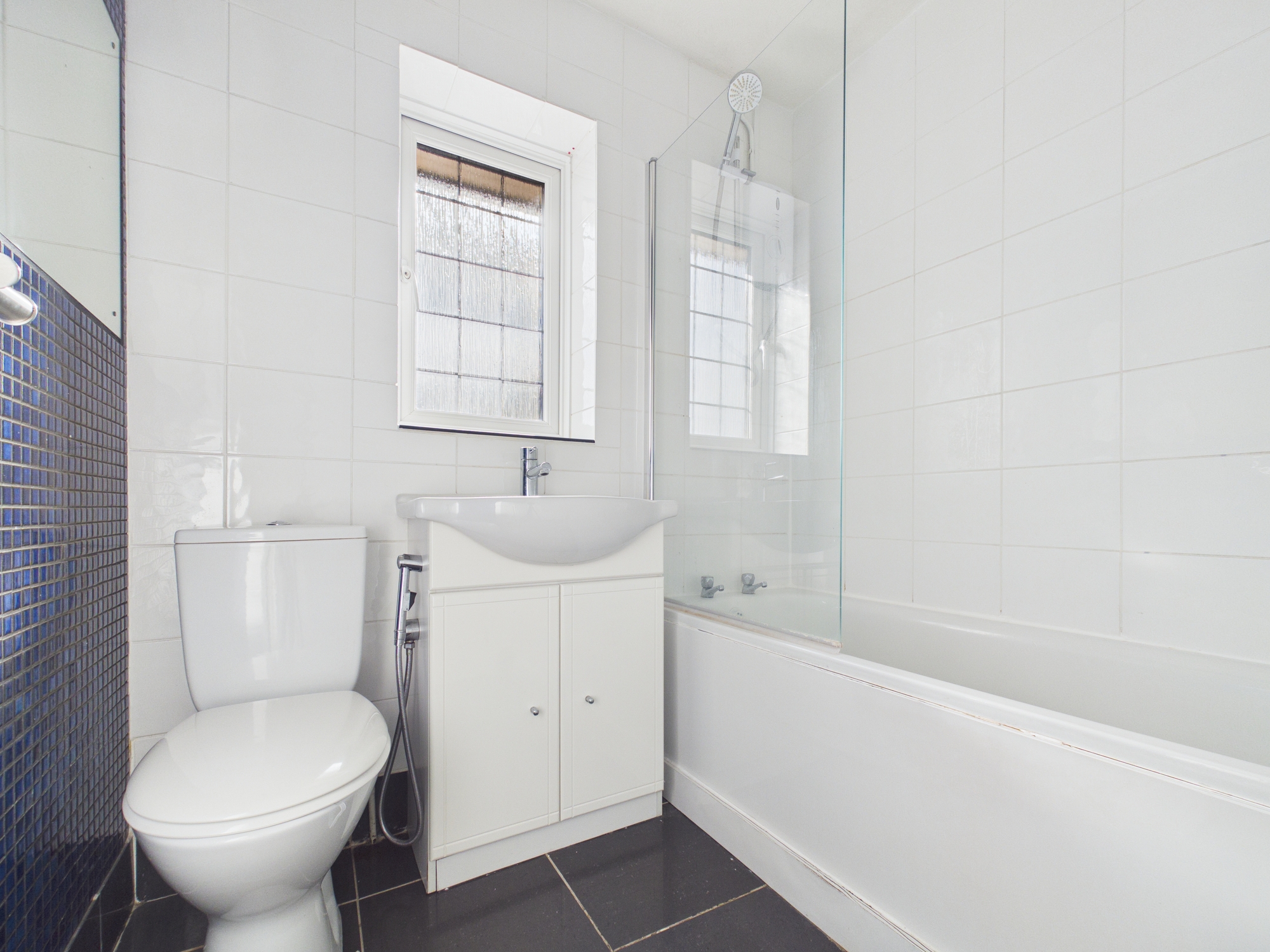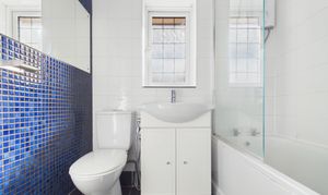 The contemporary bathroom is fitted with a three-piece suite comprising panelled bath with electric shower over, WC with low level cistern and wash hand basin inset within vanity unit and an obscure window to front elevation.