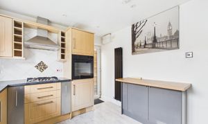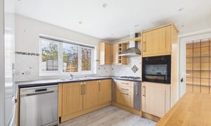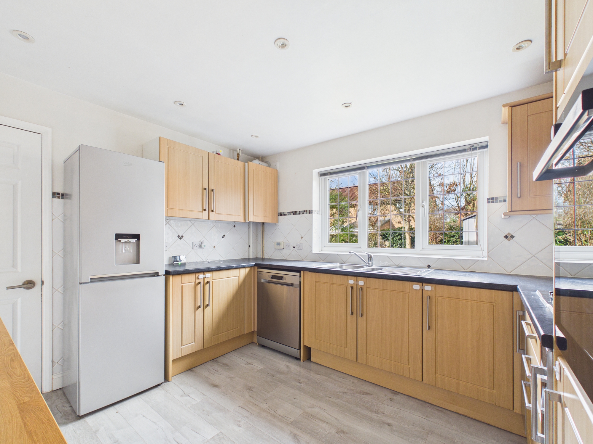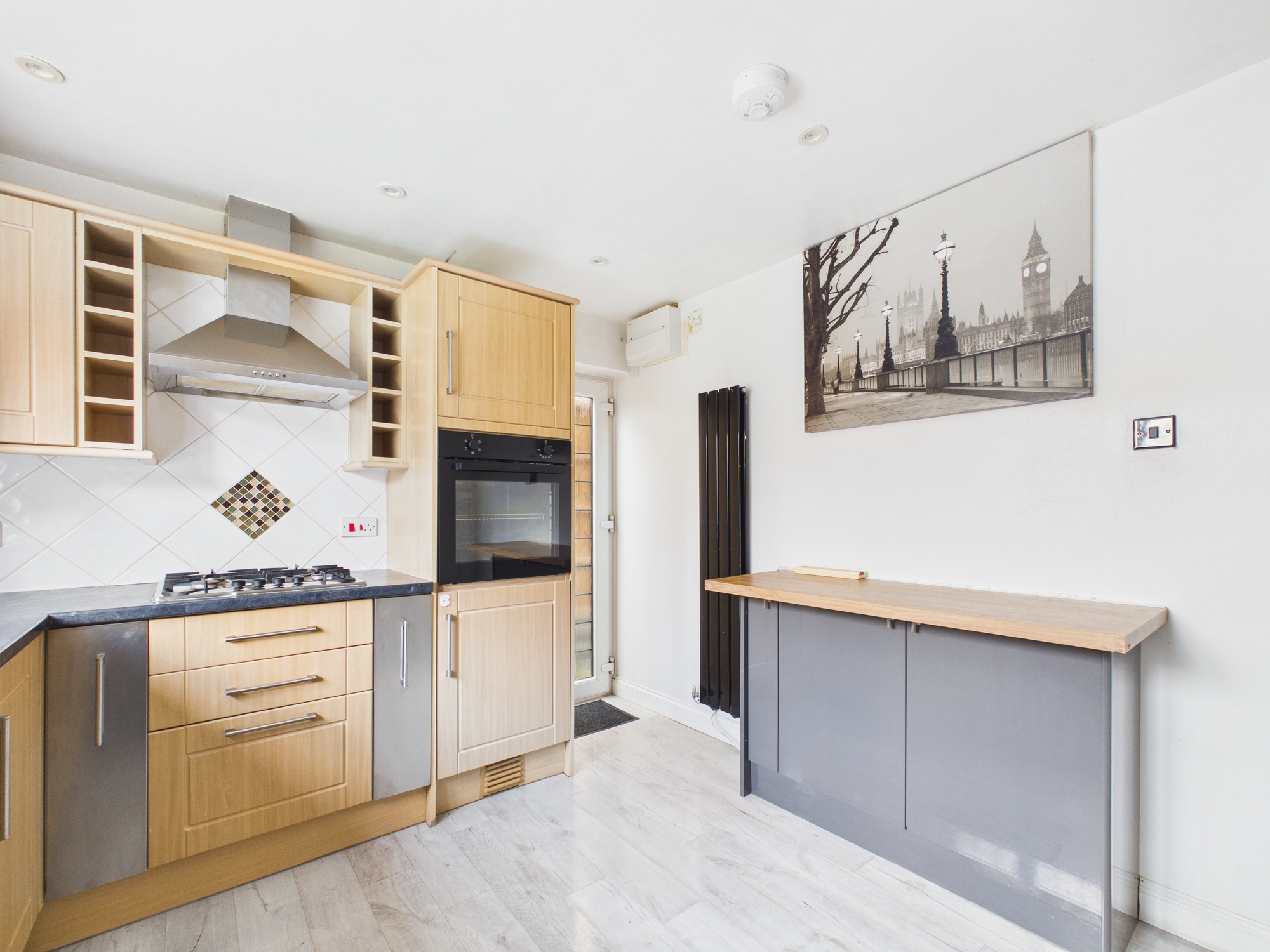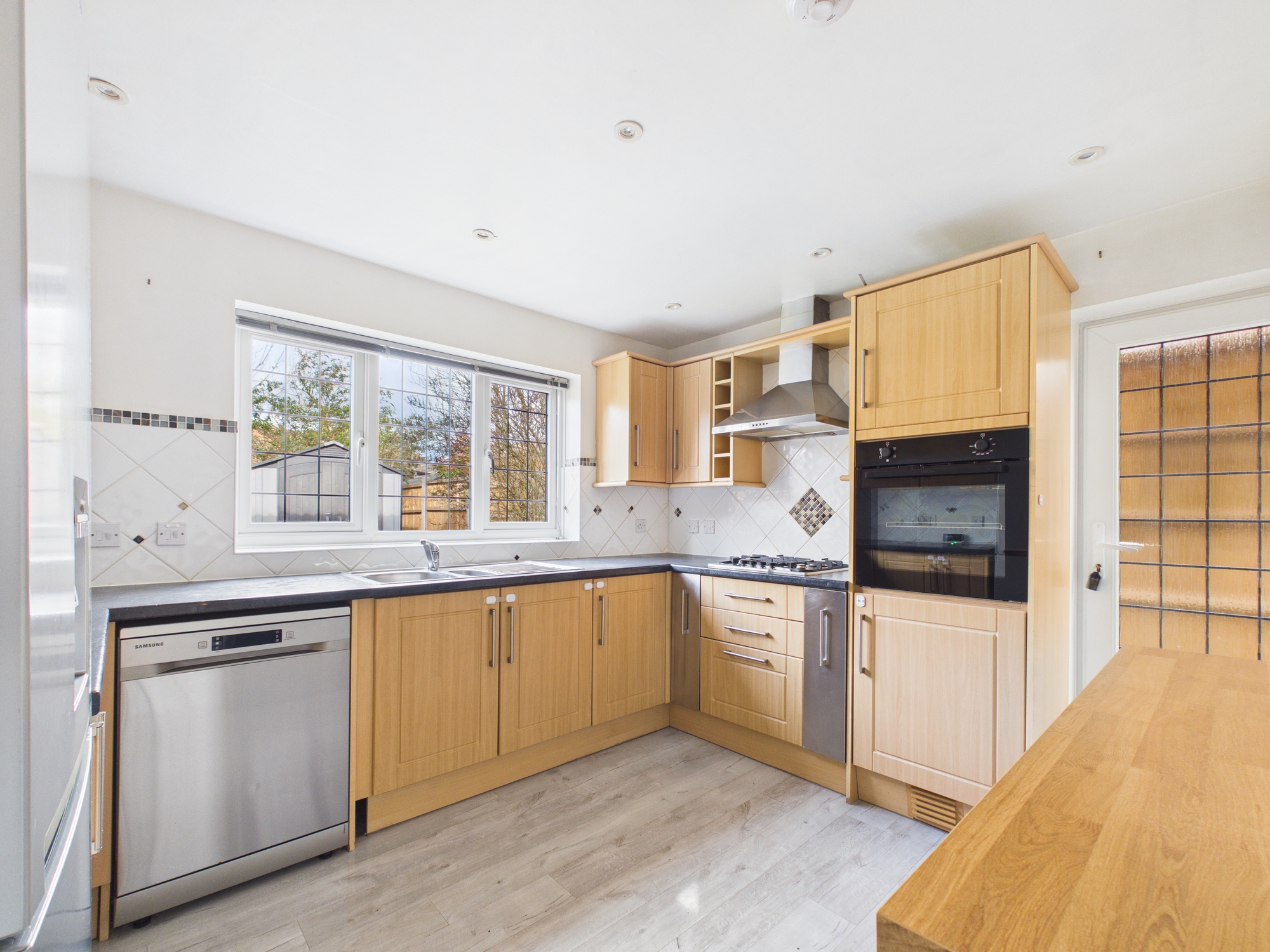 With a window overlooking the rear garden and a door to the side, the kitchen is fitted with a range of cupboard units, worktop space and integral appliances including an electric oven, four ring gas hob with extractor over, one and a half bowl sink with a drainer, space for a fridge / freezer and plumbing for a dishwasher.