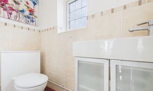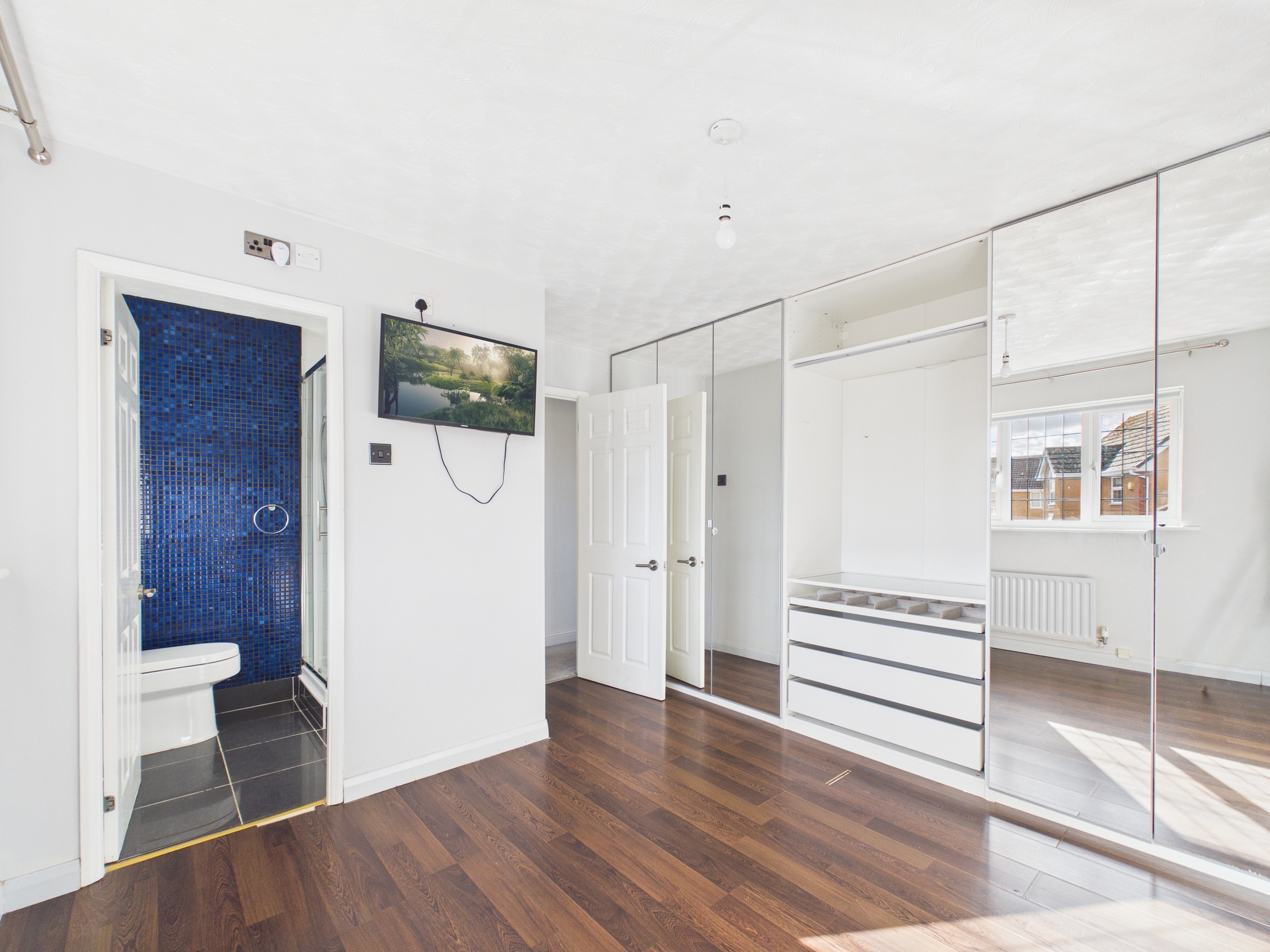 The en-suite is fitted with a three piece suite comprising shower enclosure, WC with low level cistern and wash hand basin inset within vanity unit and an obscure window to front elevation.