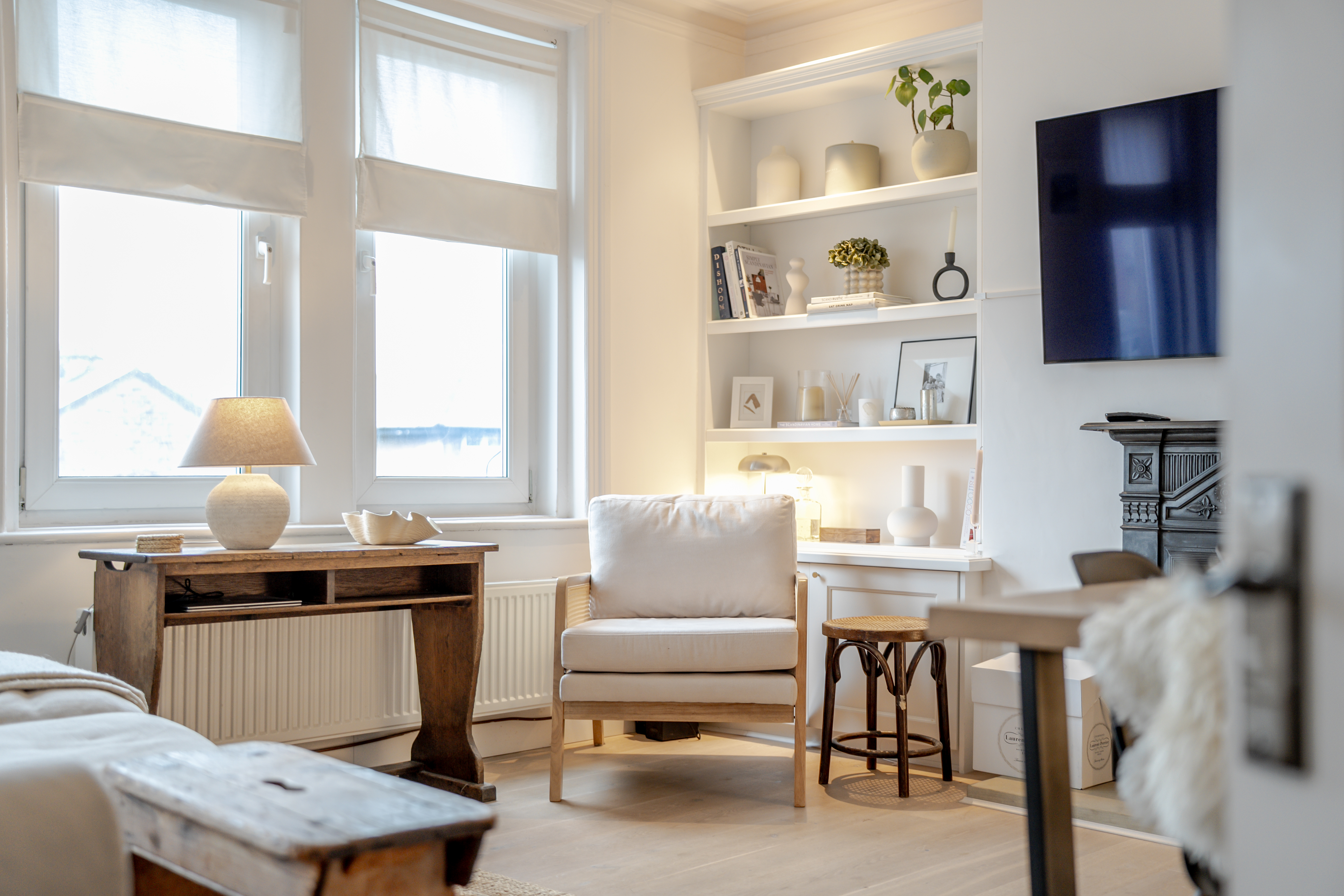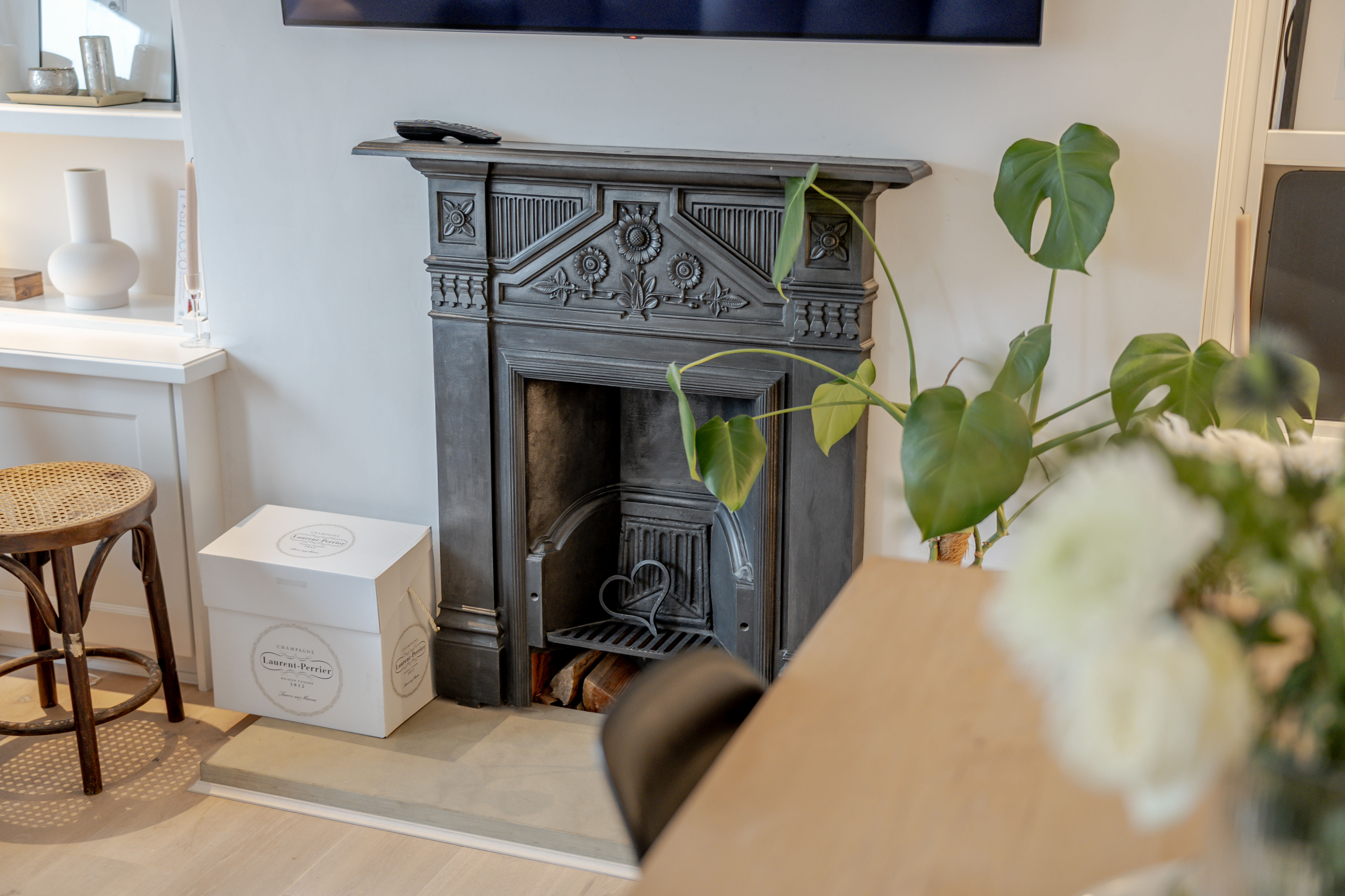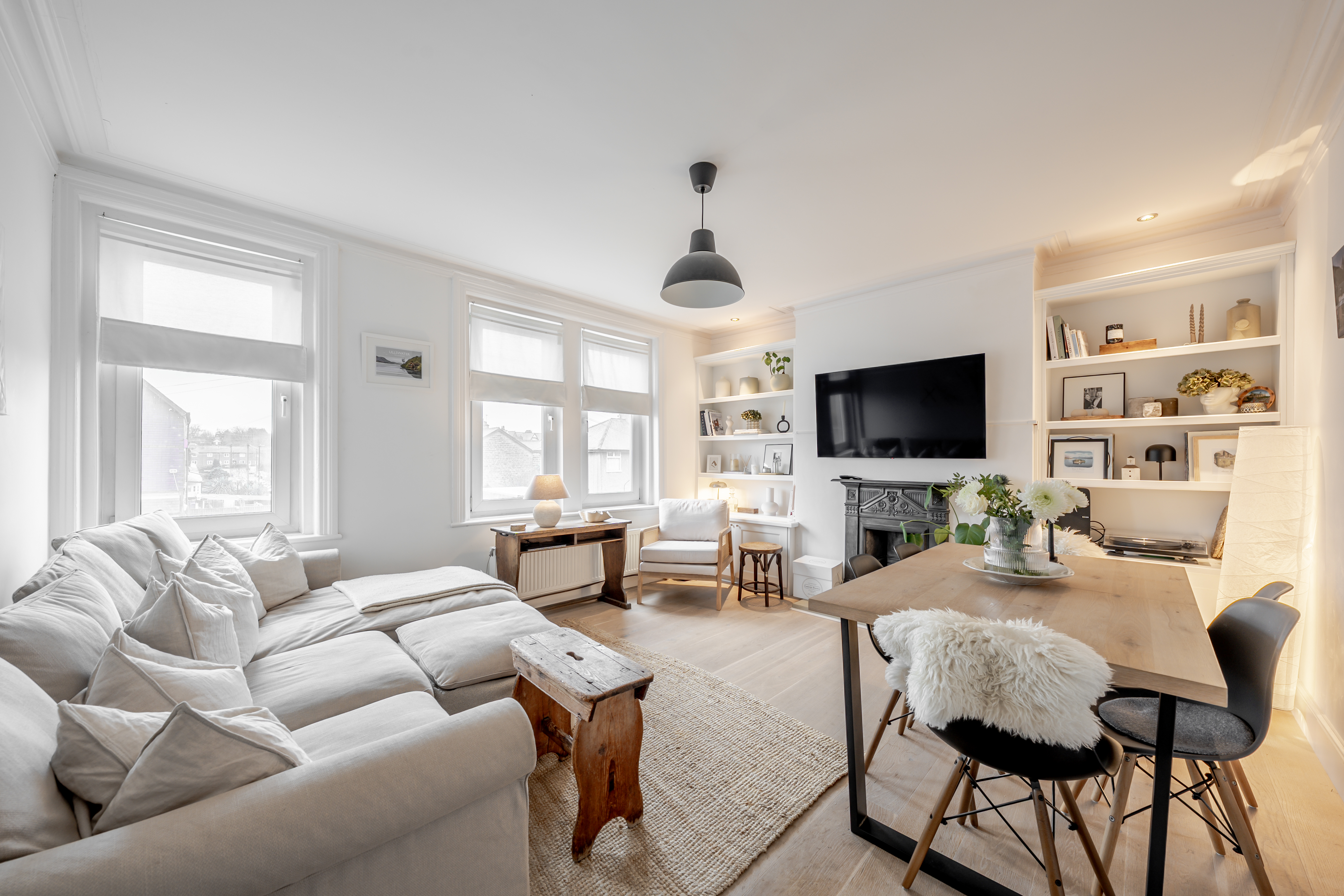 The apartment is accessed via a secure communal entrance. The main level features a modern fitted kitchen with integrated appliances and ceiling spotlights, along with a spacious and airy living room boasting elegant ceiling cornicing, additional spotlights, a feature fireplace, and attractive wood flooring. A contemporary bathroom with stylish tiling and an over-bath shower completes this floor.
