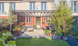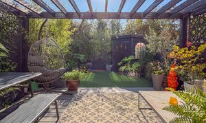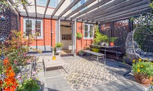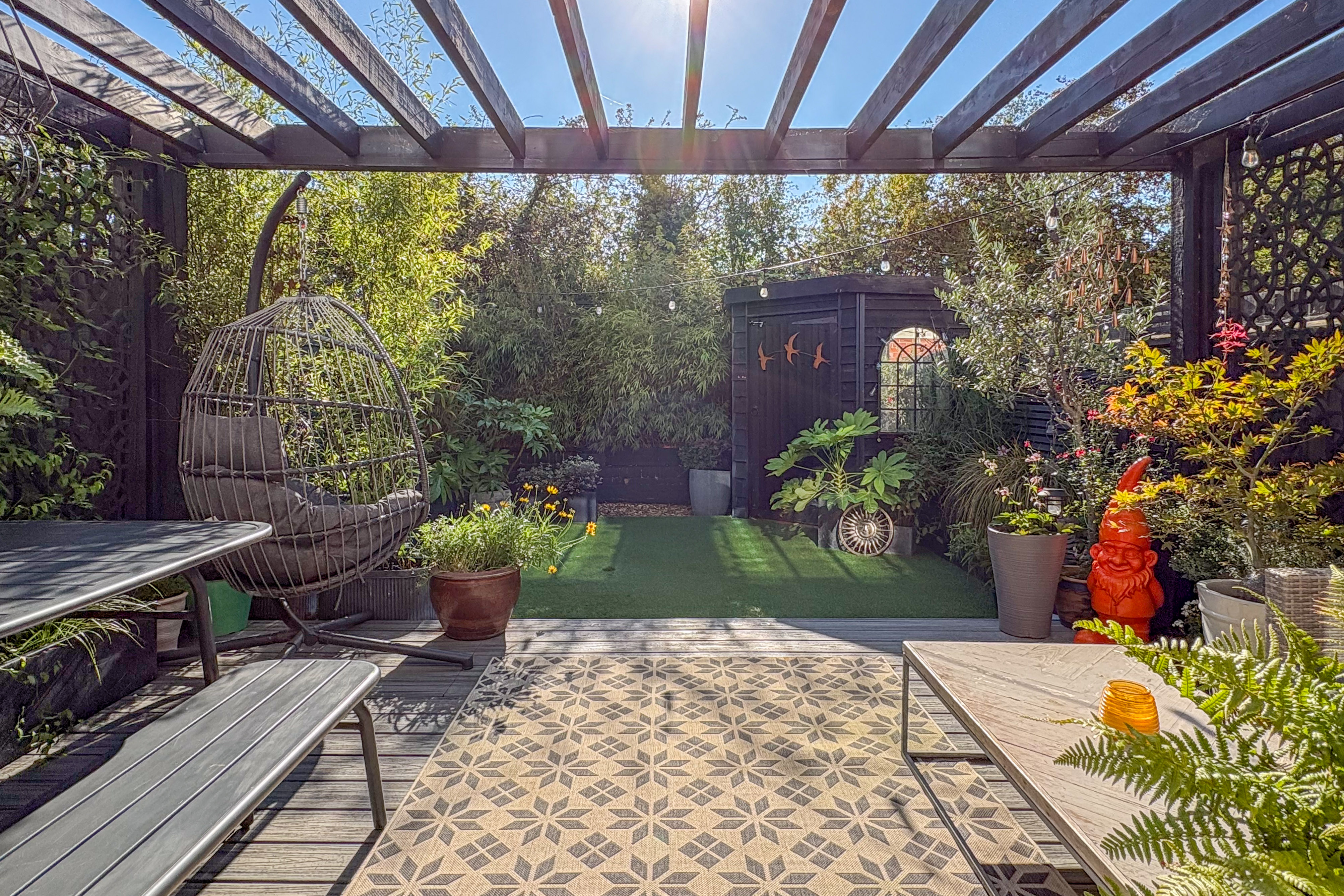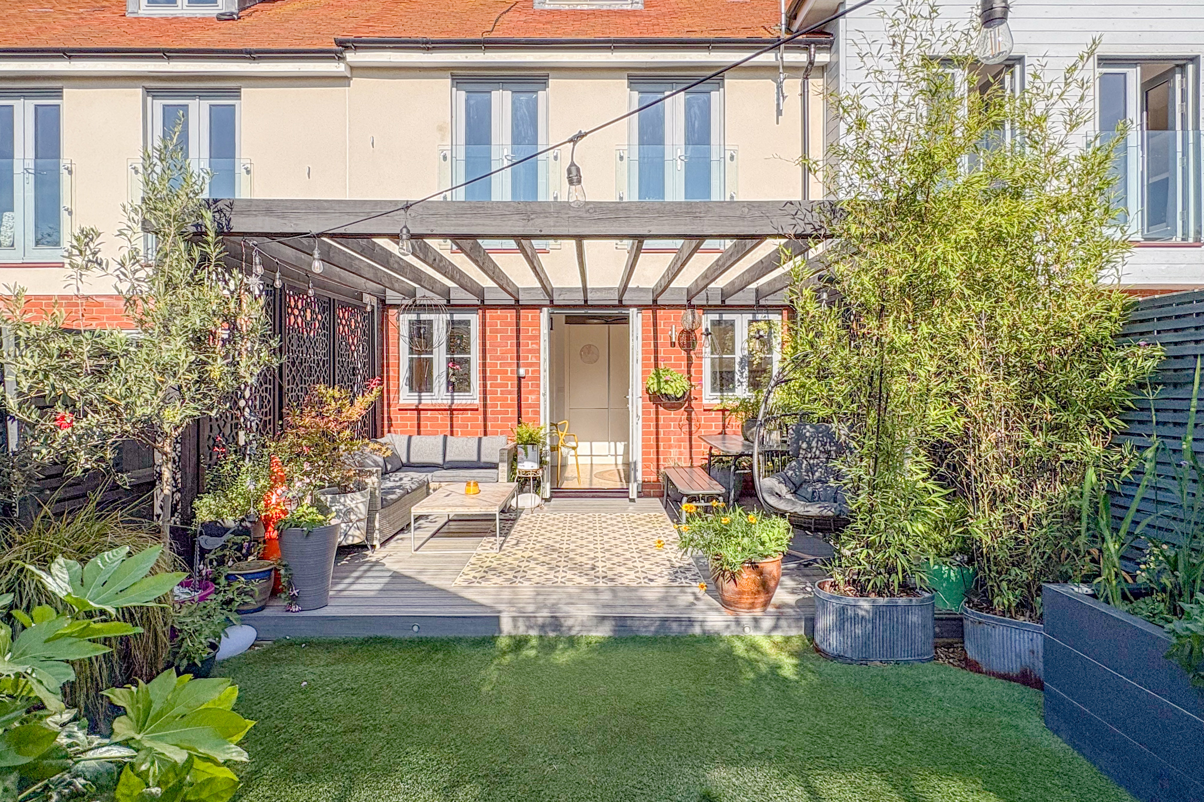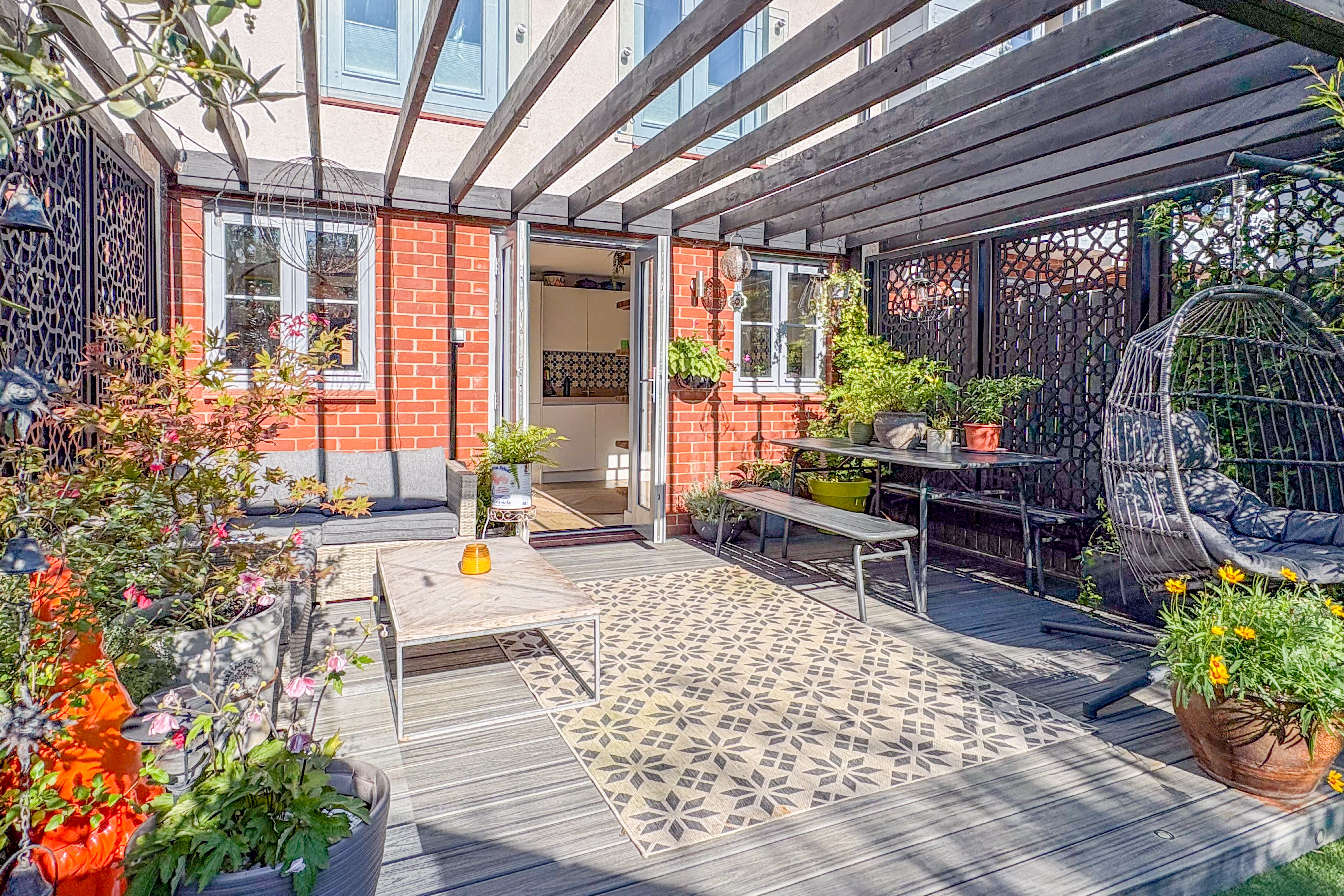 Set over three beautifully presented floors, the home combines contemporary design with a versatile layout. The ground floor opens into a welcoming hallway with bold feature décor, a cloakroom, and a dedicated study created from a partial garage conversion—ideal as a home office, hobby space, or playroom. The remaining garage space offers excellent storage. Amtico flooring and underfloor heating run throughout the ground floor, adding both style and comfort. At the rear, the bright kitchen/dining room is fitted with sleek cabinetry, integrated appliances, and vibrant patterned splashbacks. French doors open to a landscaped garden with a pergola-covered entertaining area and decorative screening, creating a private and sociable retreat.