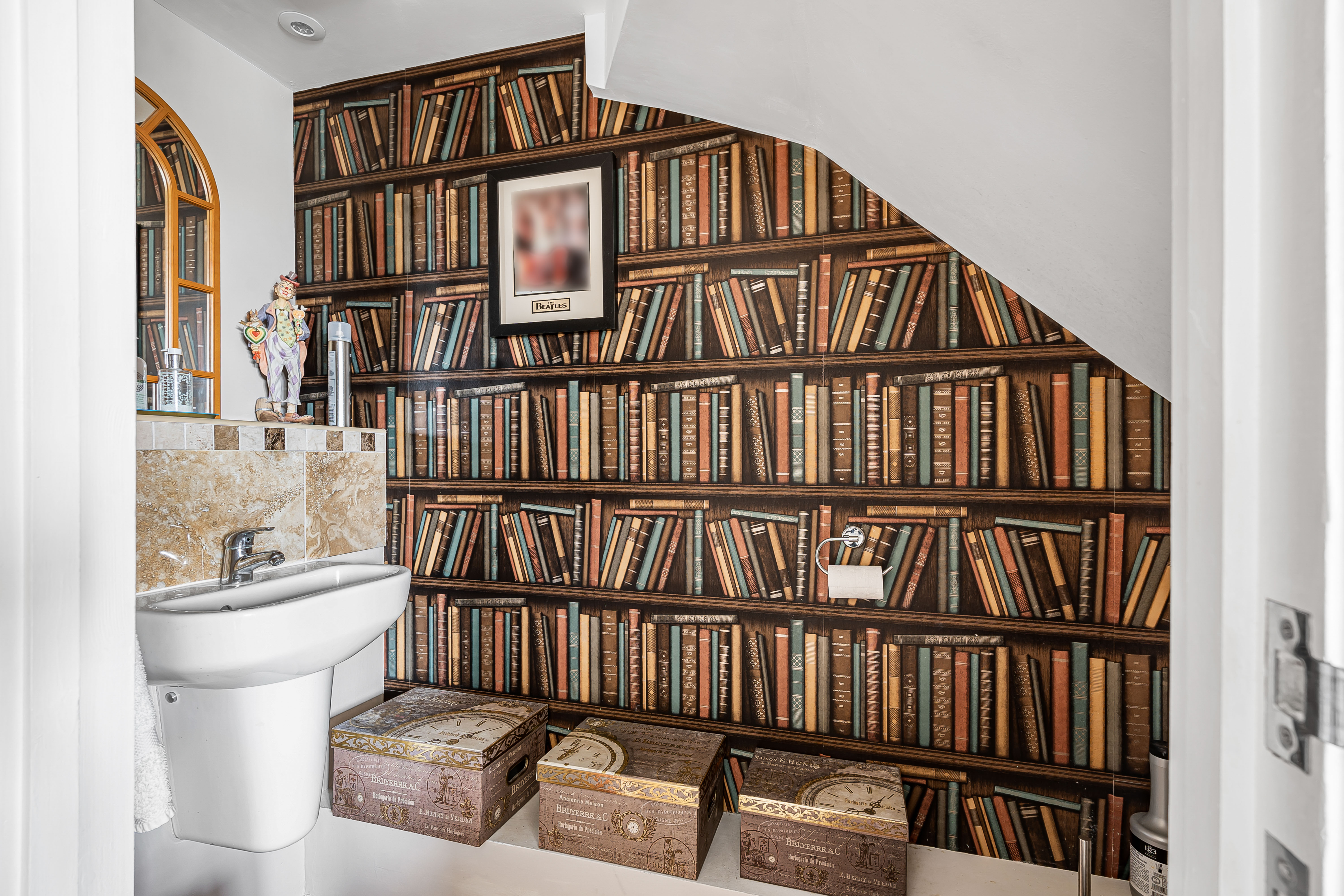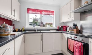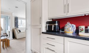 Modern kitchen with a range of floor and wall units, worktop over, integrated washing machine, fridge/freezer, electric oven and hob with extractor over and handy downstairs cloakroom.