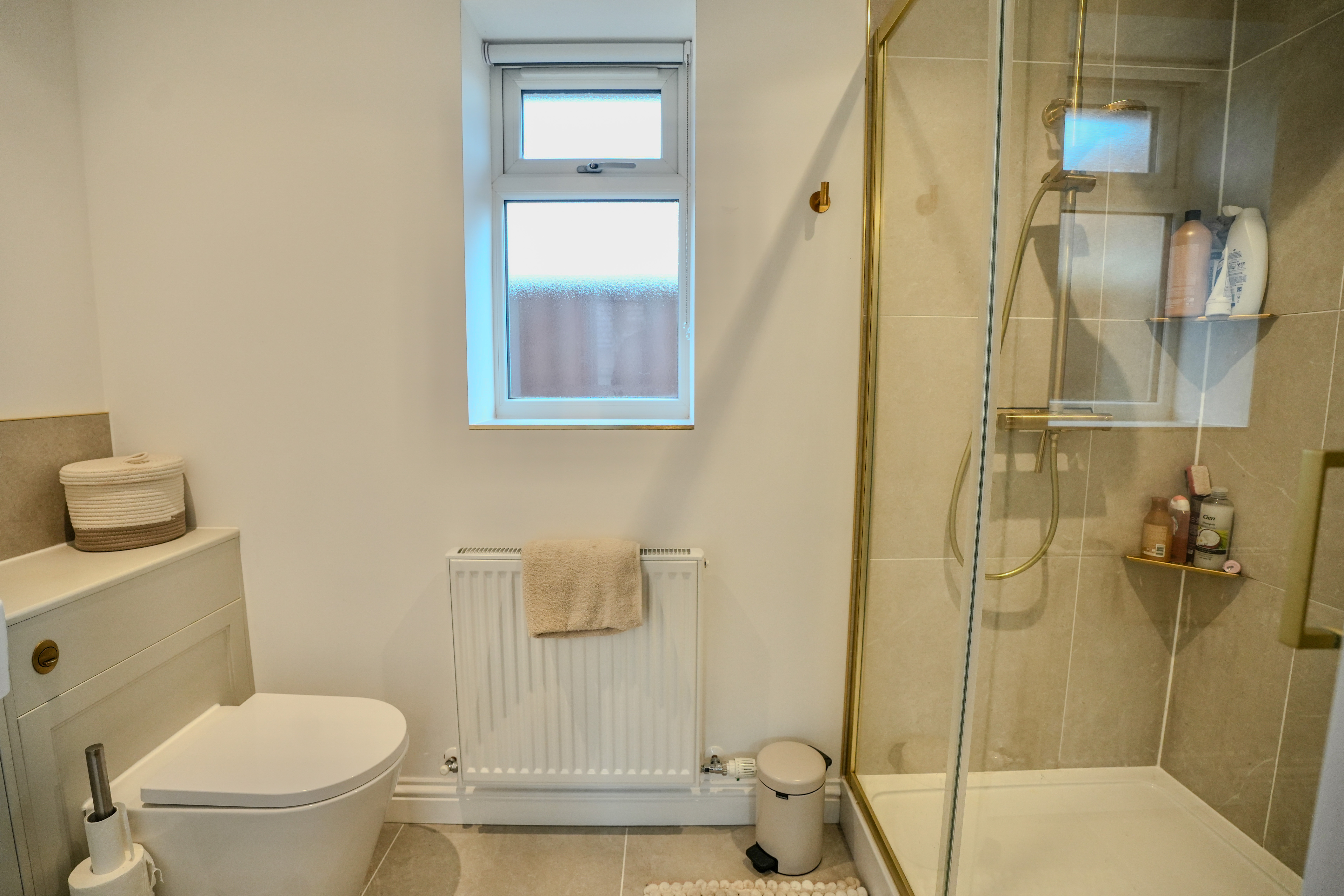 uPVC obscure double glazed window to the side aspect, tiled flooring, wall mounted radiator, inset ceiling downlighters, extractor fan, fitted bathroom unit incorporating a vanity wash hand basin with cupboard below and concealed cistern WC, tiled splashbacks and shower enclosure with tiled surround.