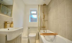 uPVC obscure double glazed window to the side aspect, tiled flooring, inset ceiling downlighters, extractor fan, wall mounted heated towel rail, vanity wash hand basin with tiled splashback and cupboard below, concealed cistern WC, panel-enclosed bath with glazed shower screen over and tiled surround.