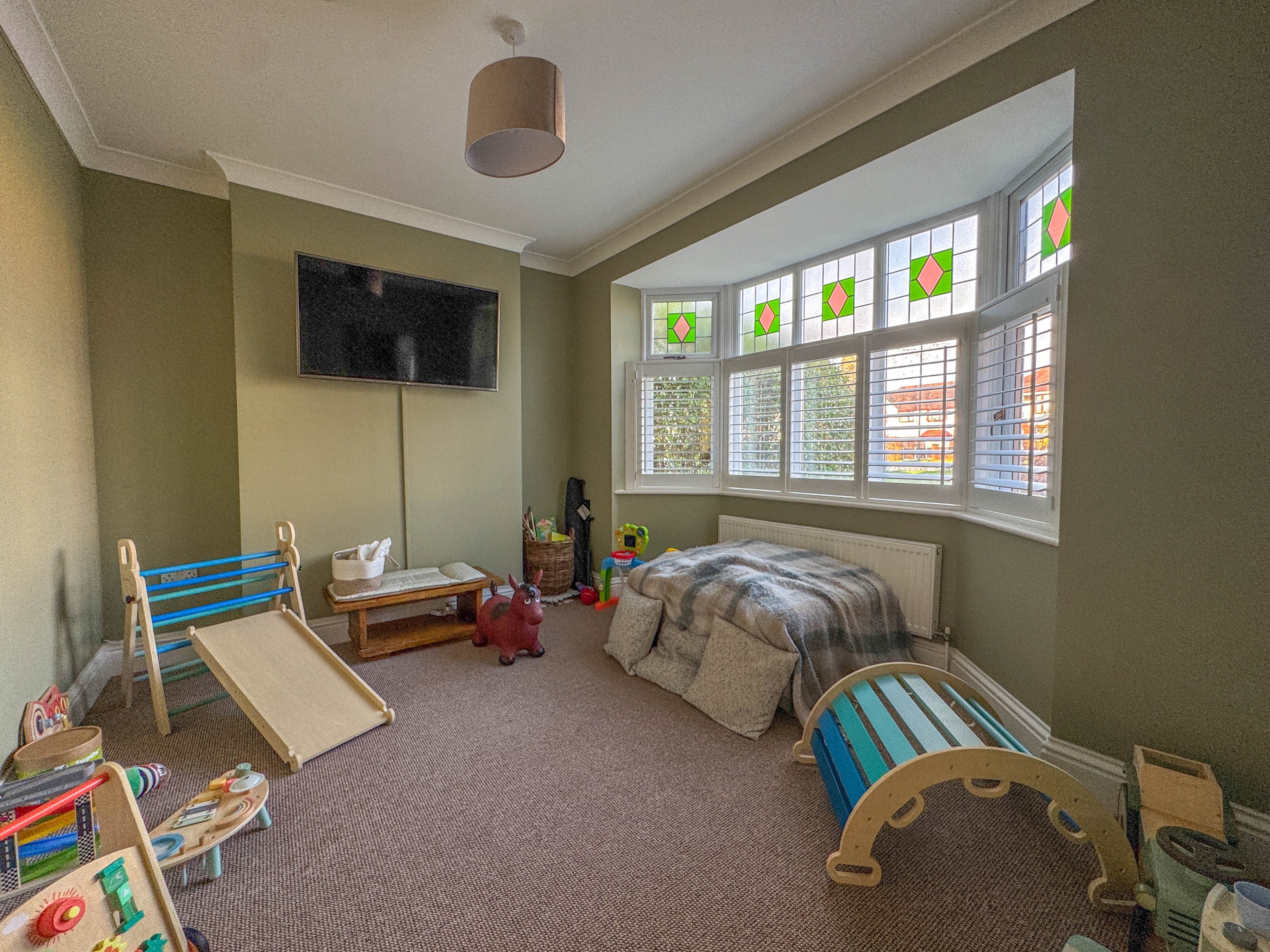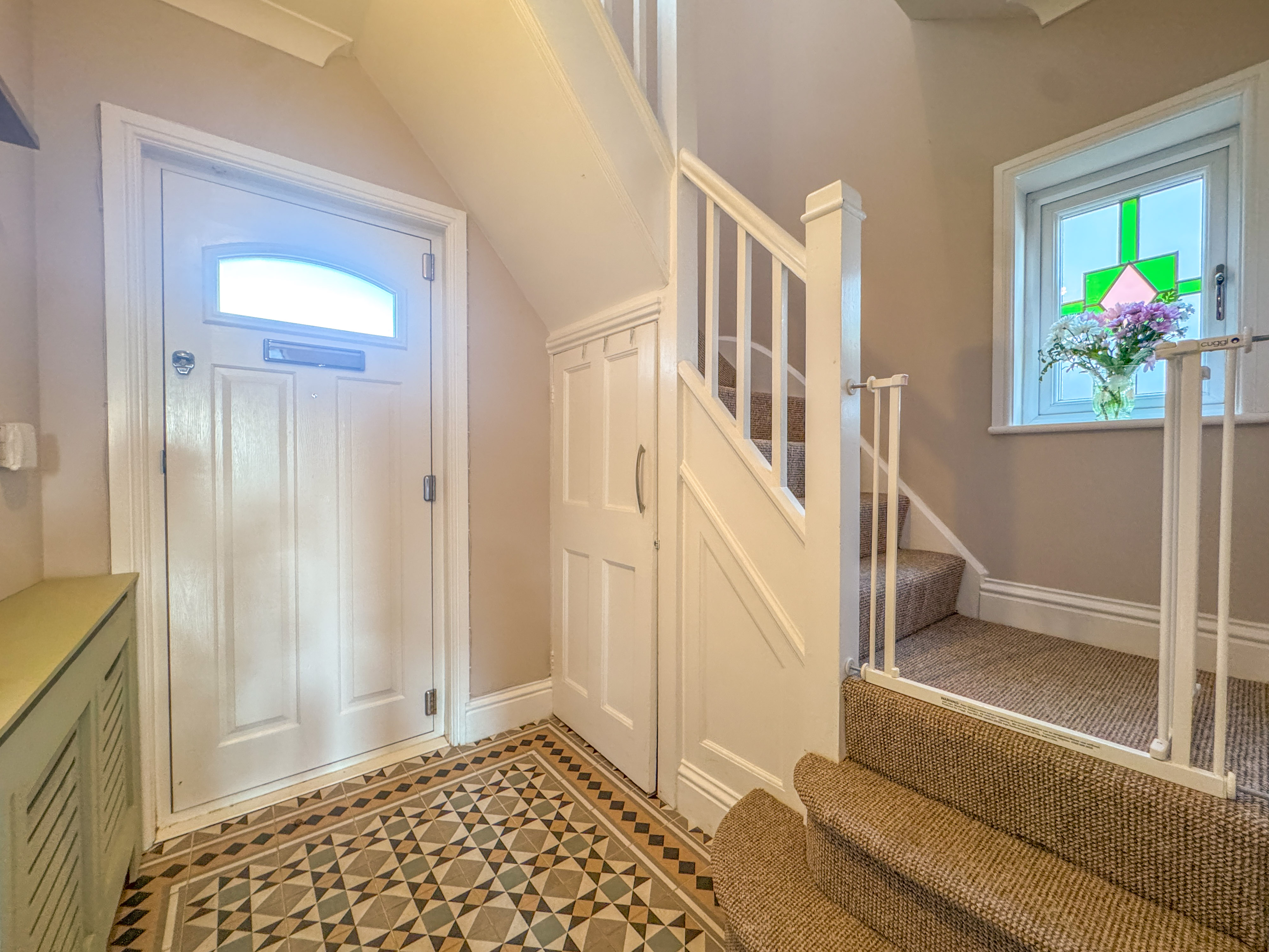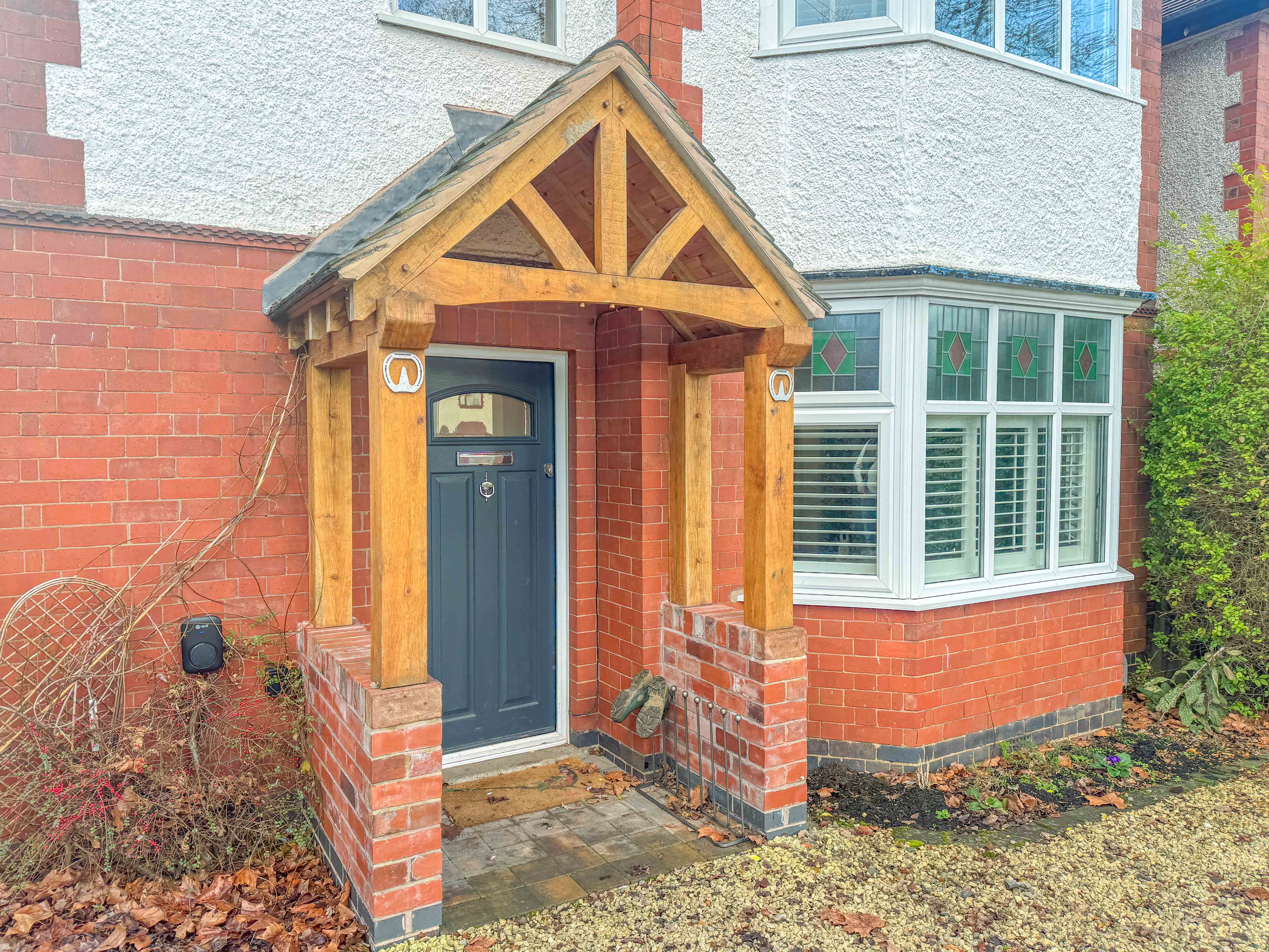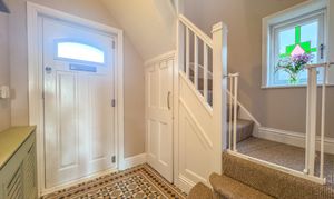 Set back from the road and approached via a generous driveway, the property boasts kerb appeal with its decorative oak porch and well-maintained frontage. Once inside, a warm welcome awaits via the spacious entrance hallway, complete with original Minton tiled flooring, setting the tone for the quality and attention to detail throughout.