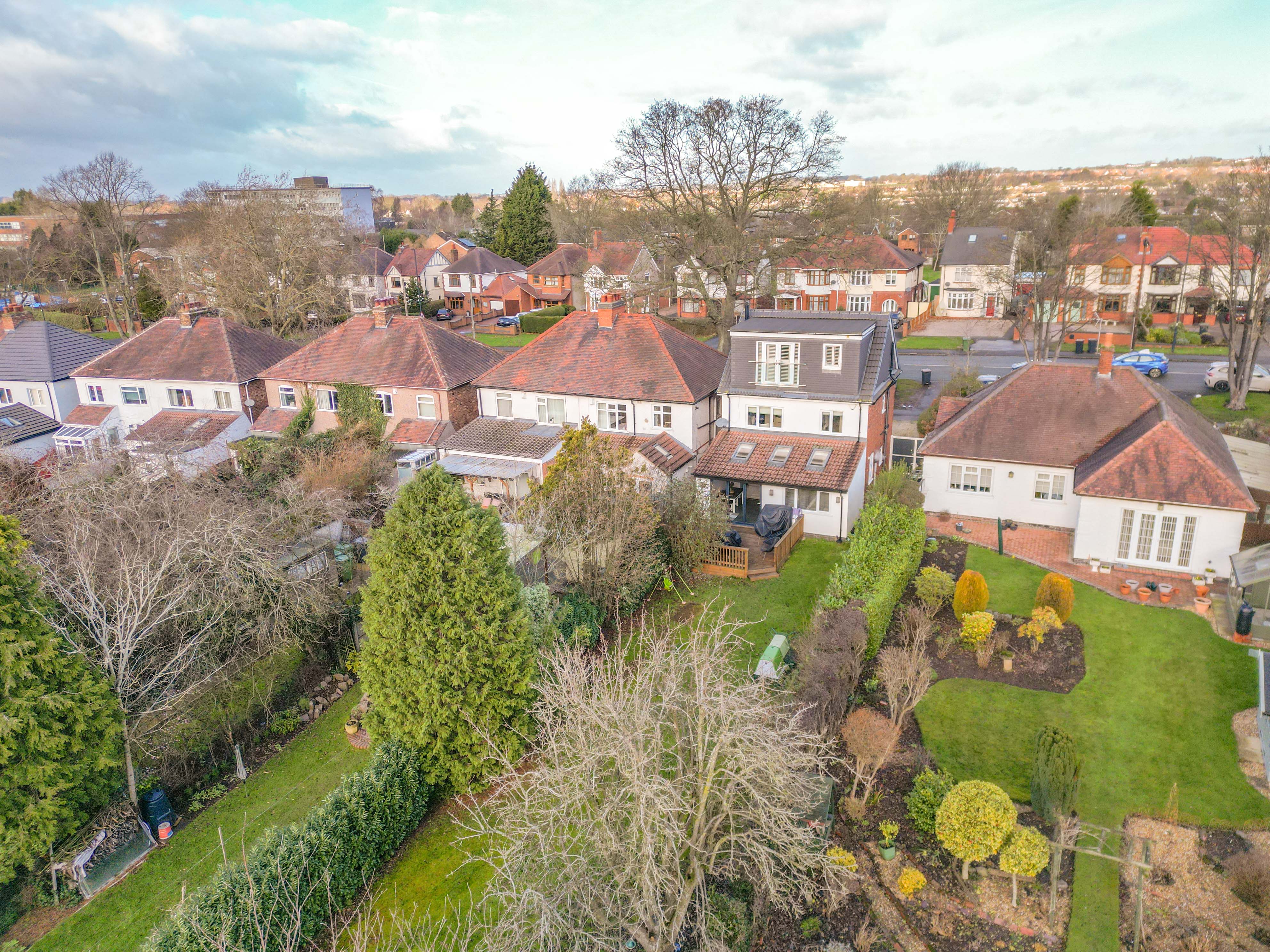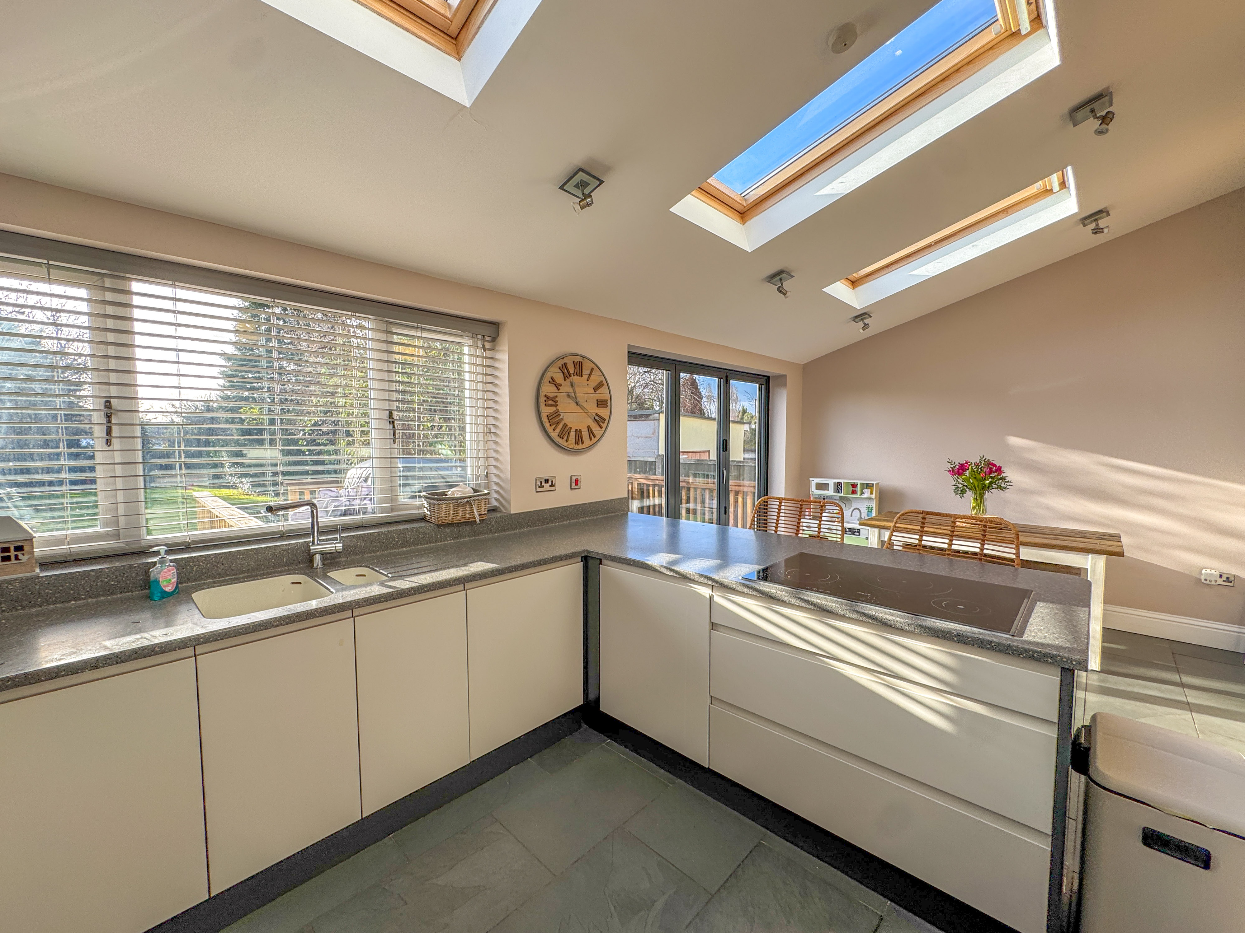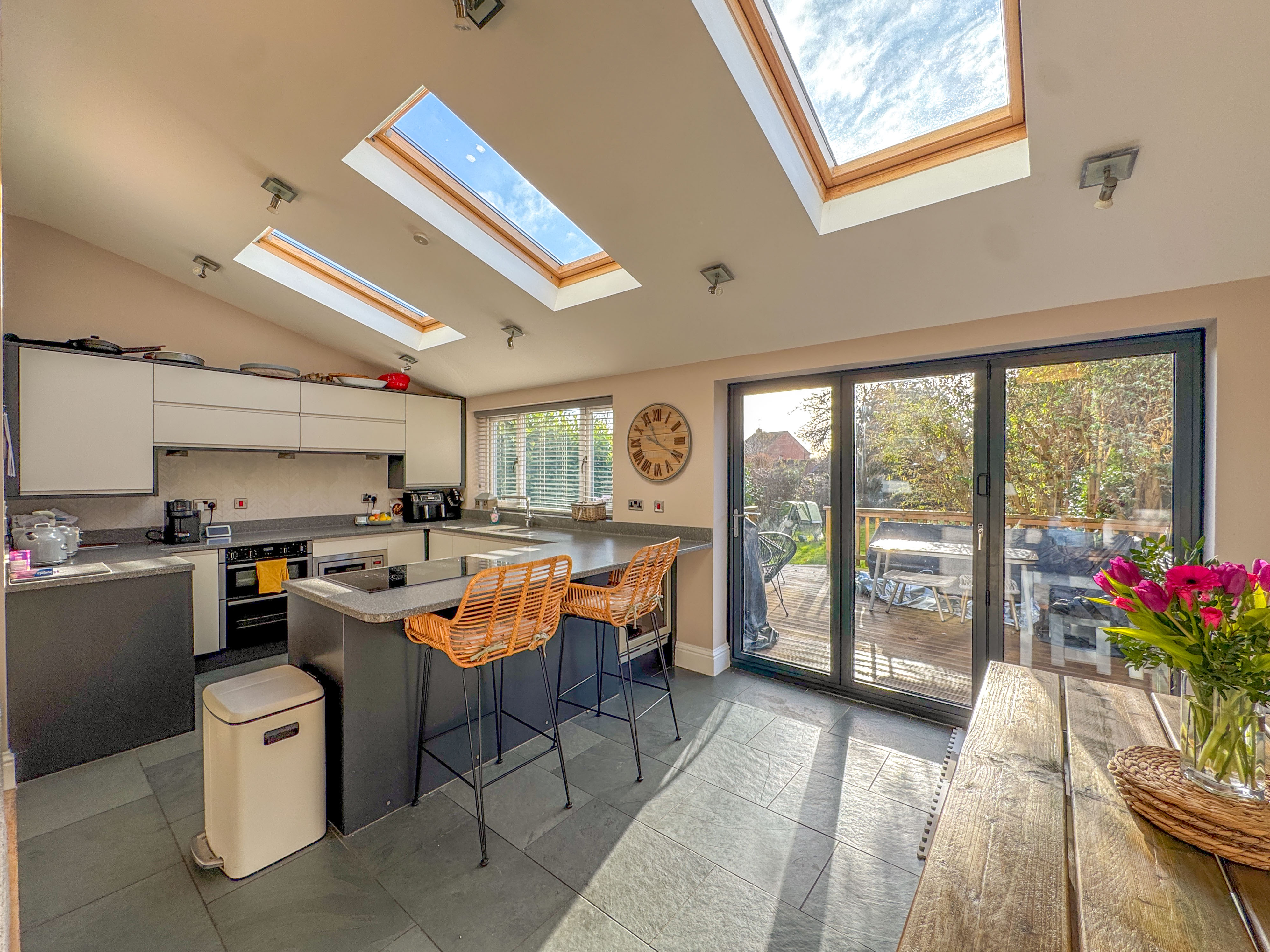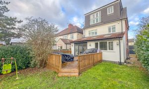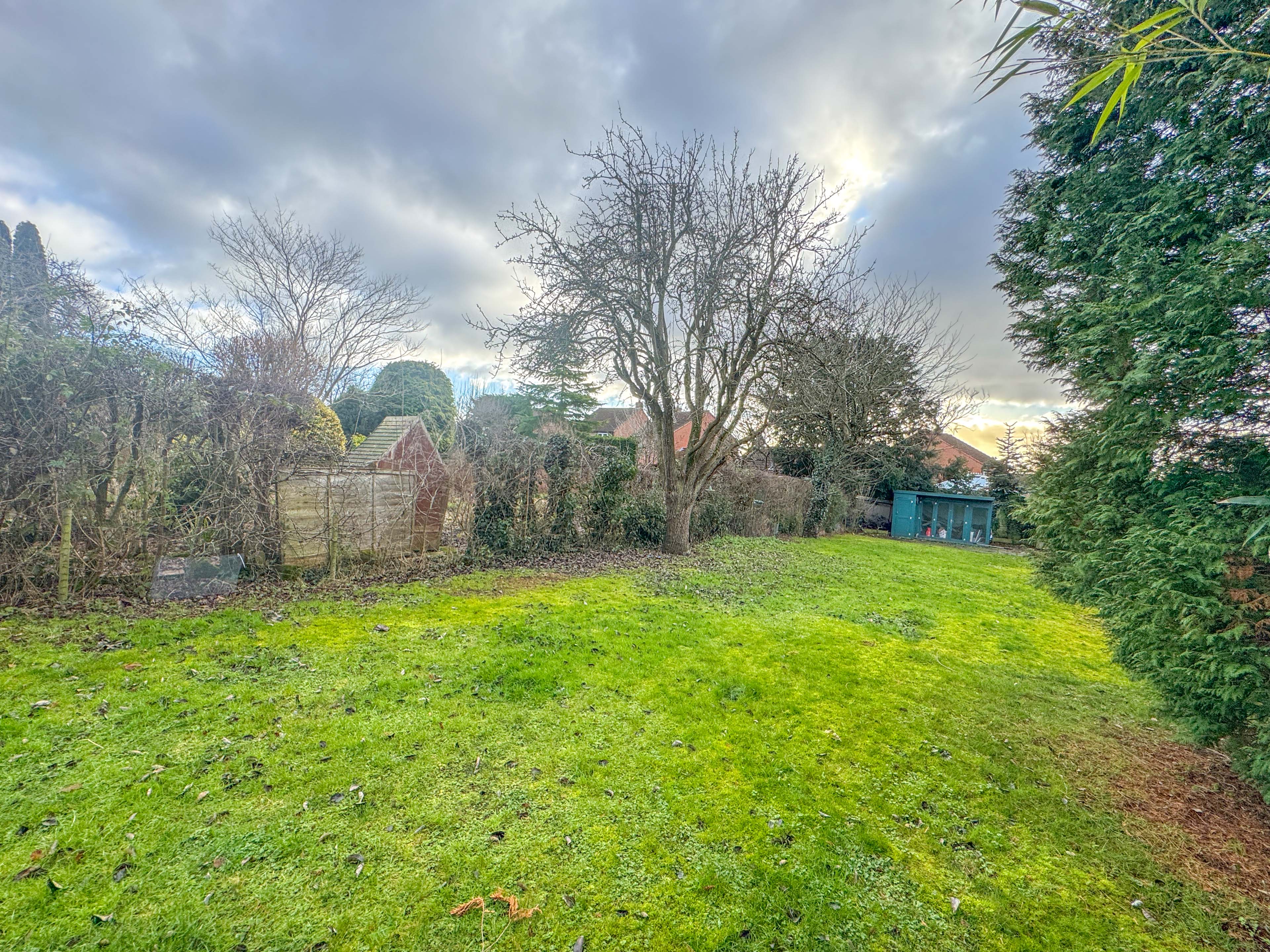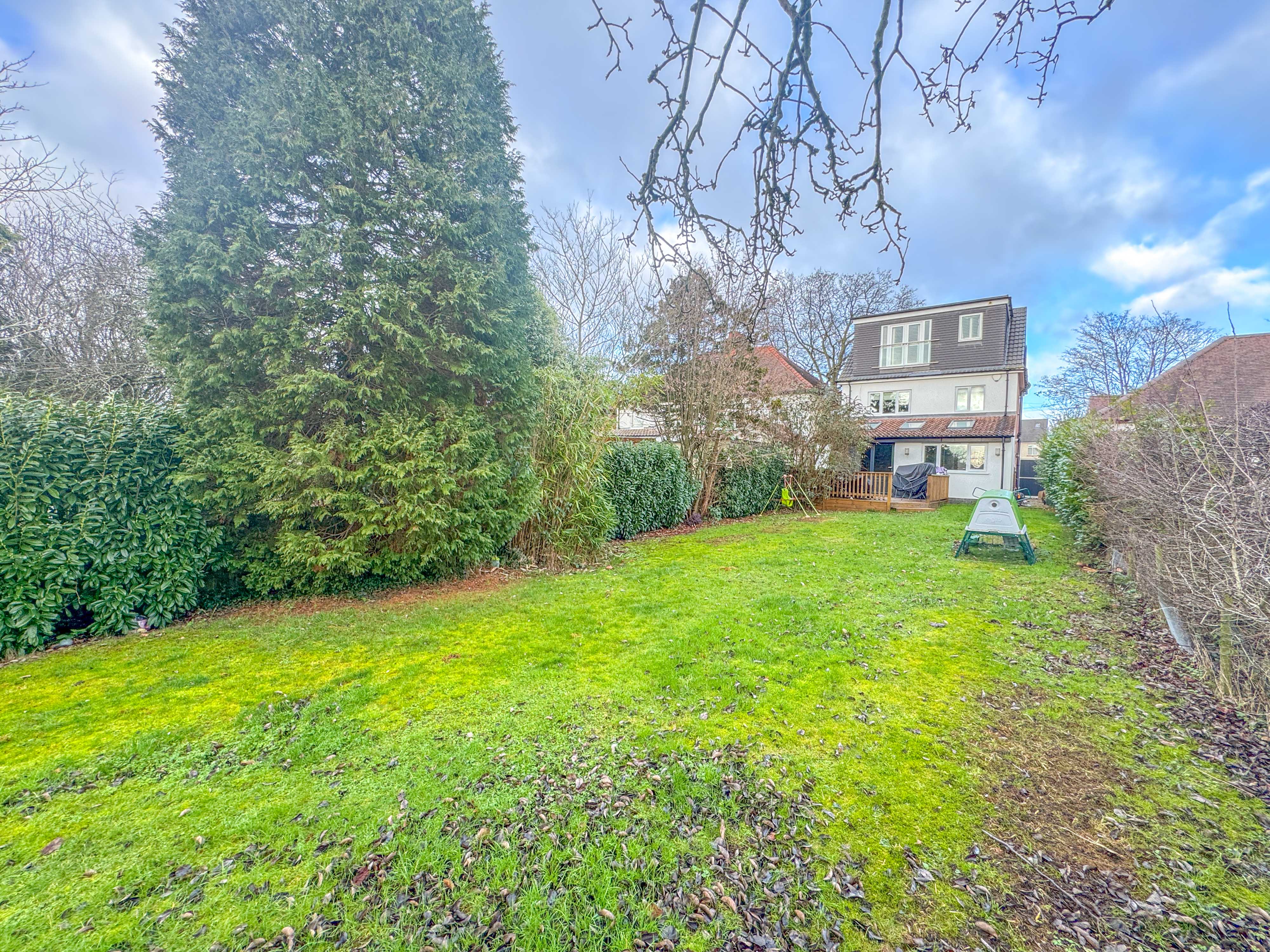 Externally, the home continues to impress. A driveway provides off-road parking for multiple vehicles, with useful side access and storage. To the rear, the large South-facing garden is mainly laid to lawn and framed by mature shrubs and trees, offering privacy and space. A raised decking area provides the perfect spot for summer entertaining, complemented by a summer house, ideal for storage or a quiet retreat.