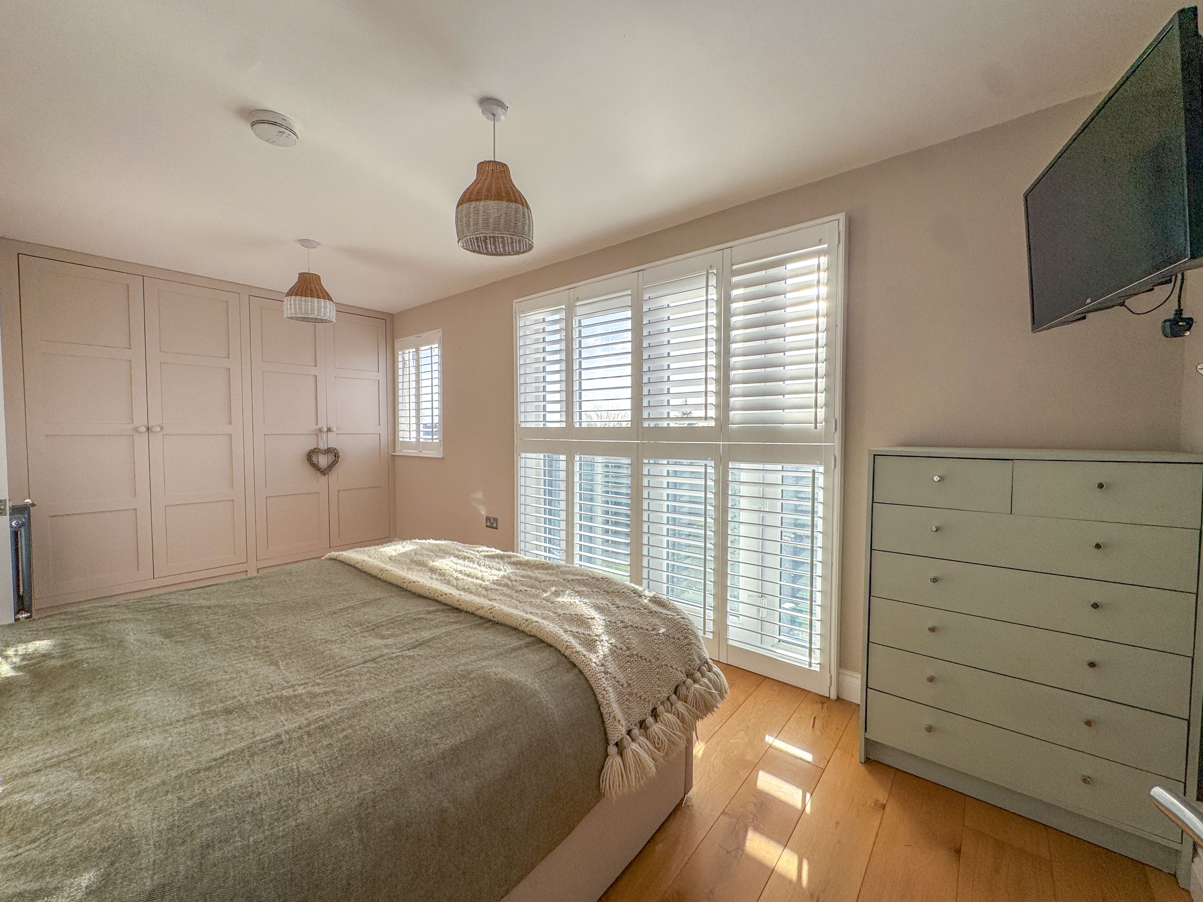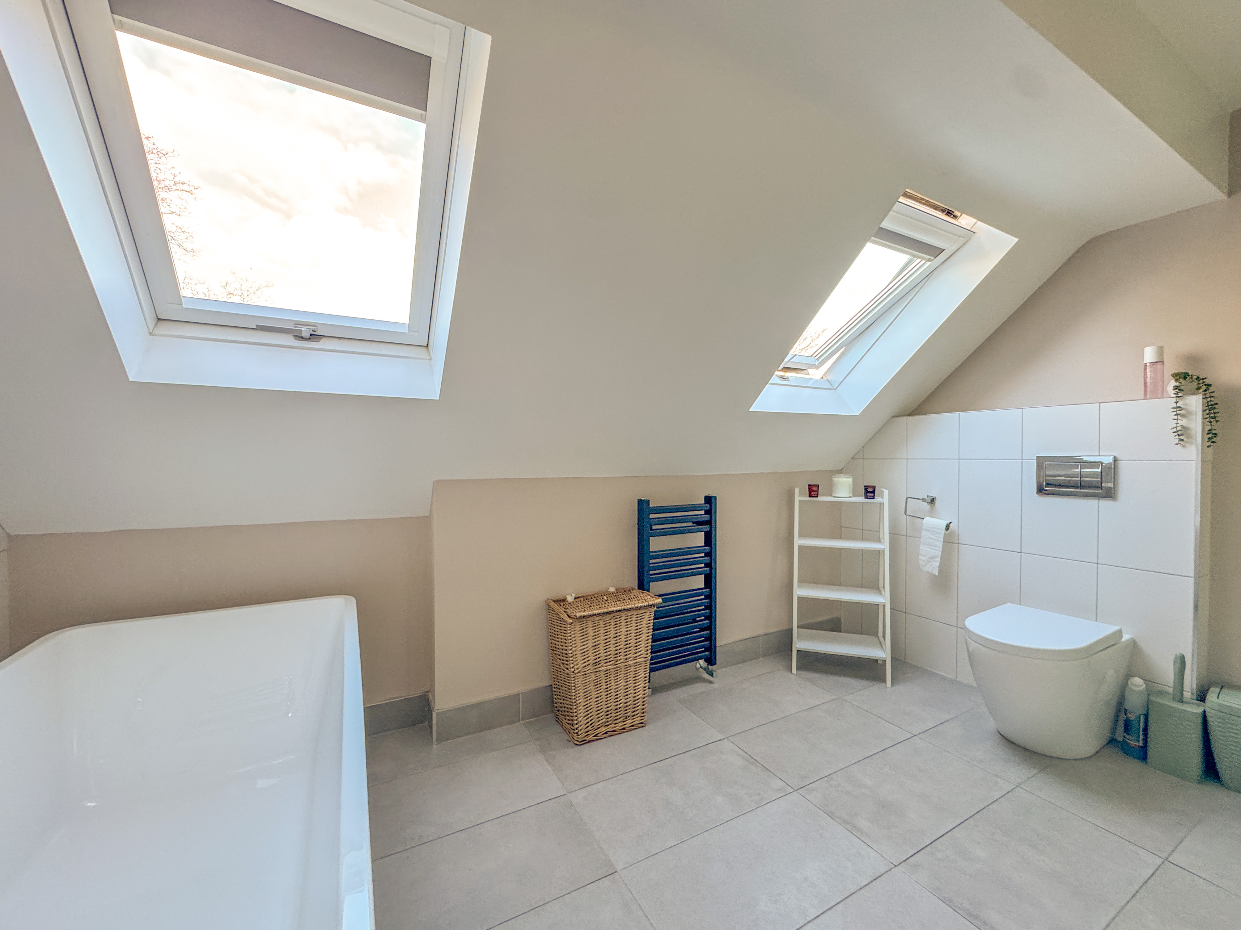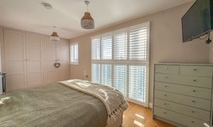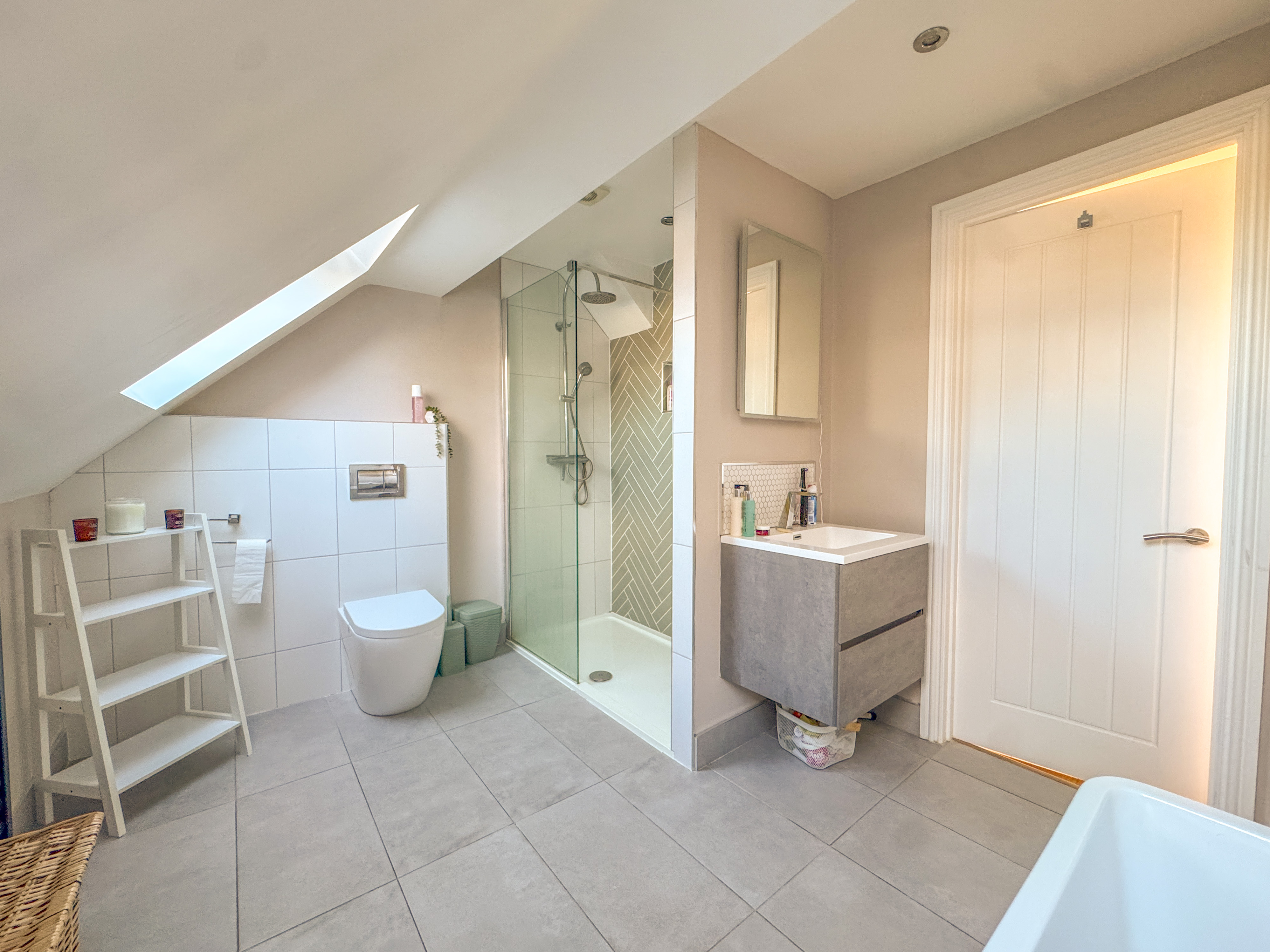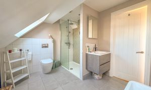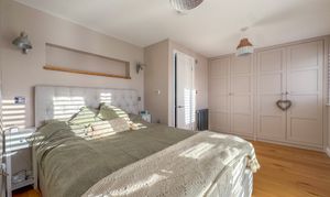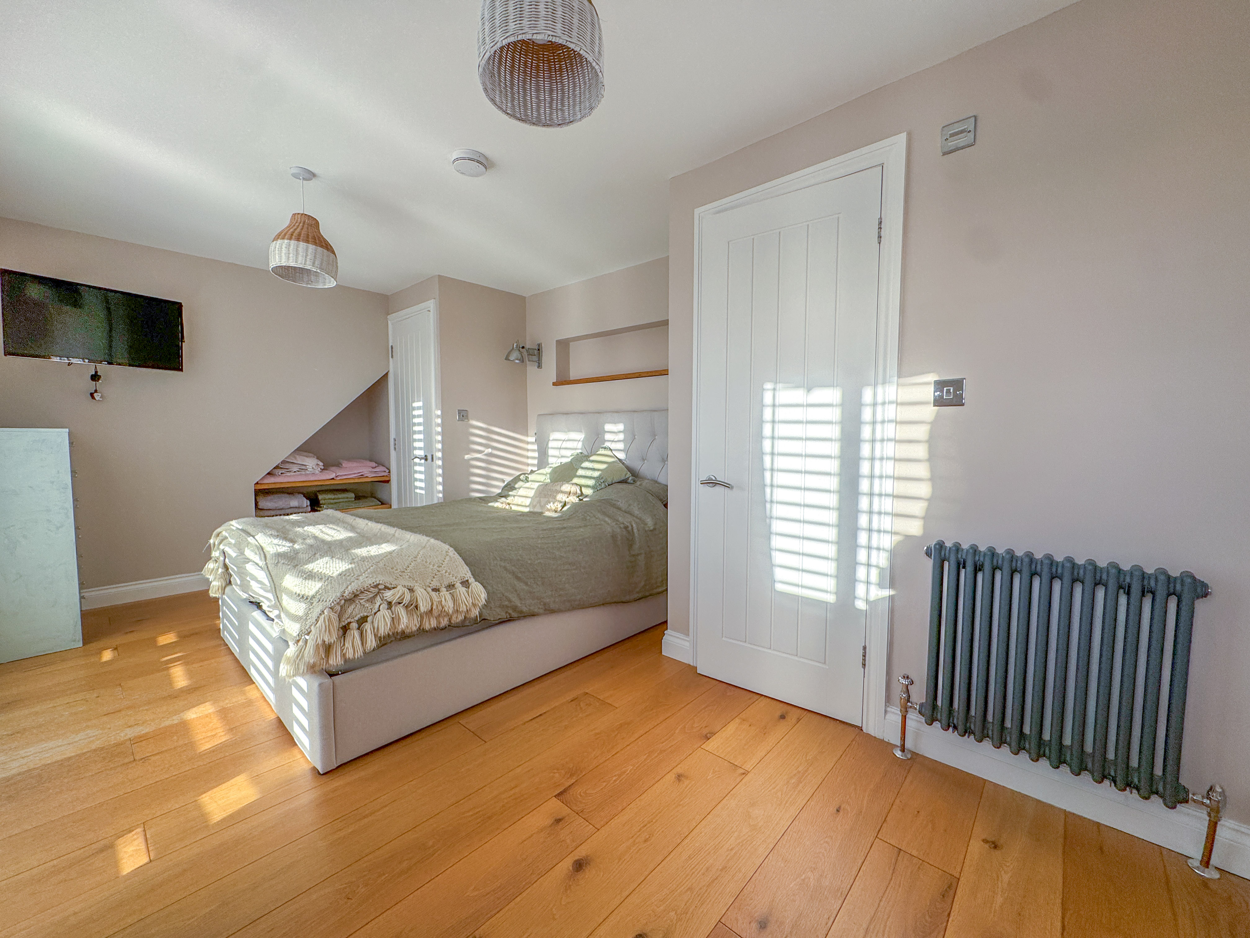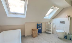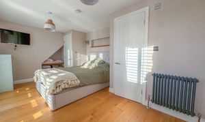The entire top floor is dedicated to an impressive principal suite, offering a luxurious retreat. This double bedroom features built-in wardrobes, a stunning Juliet balcony with far-reaching views, and a contemporary en-suite complete with freestanding bathtub, a double walk-in shower, and two skylights, creating a bright and serene sanctuary.