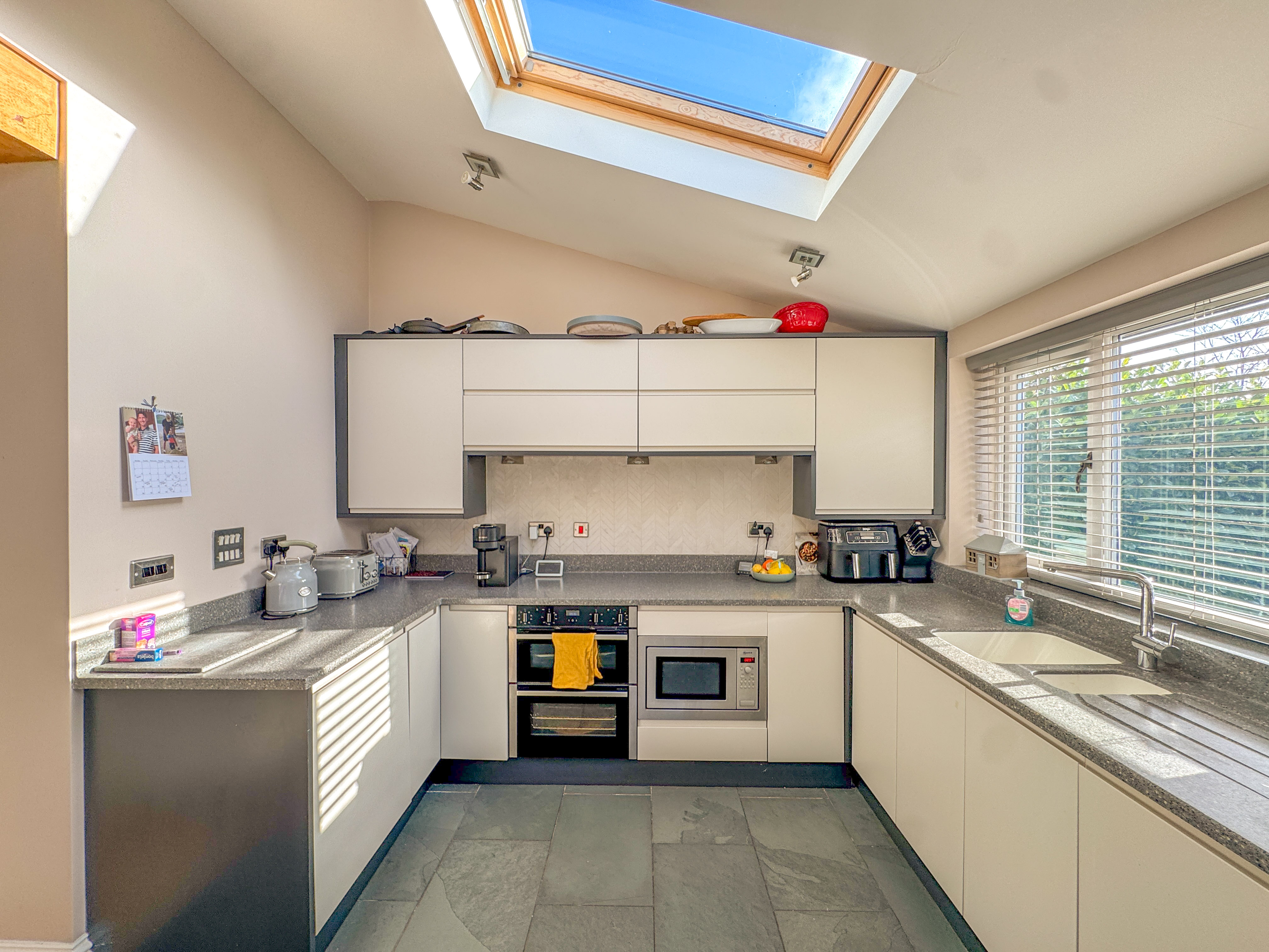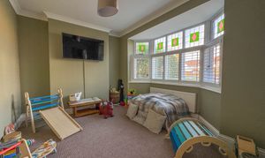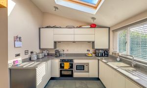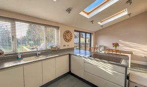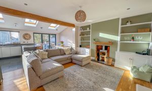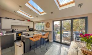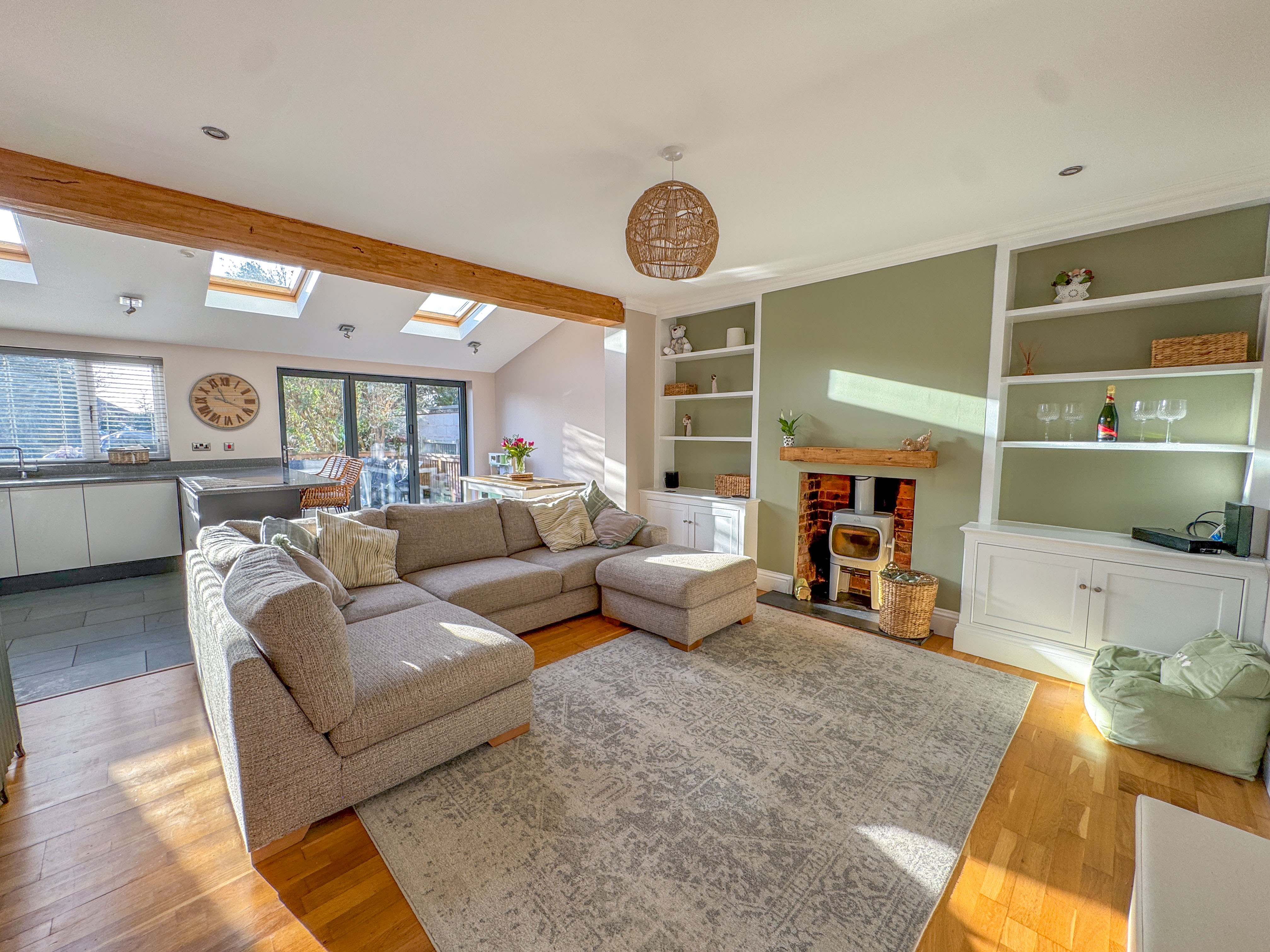 To the front of the home, a cosy snug/playroom features a traditional bay window, ideal for a quiet retreat, study, or children's space. To the rear, the property truly comes to life with a spectacular open-plan kitchen, dining and living area, perfectly designed for modern family life and entertaining. This extended space is flooded with natural light from three Velux skylights and bi-fold doors that open directly onto the South-facing rear garden. The sleek, contemporary kitchen features a range of fitted units, an extended breakfast bar with seating, and high-end integrated appliances, including a double oven, Neff microwave, dishwasher, fridge and freezer. A log burner adds warmth and ambience, making this space a joy all year round.