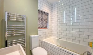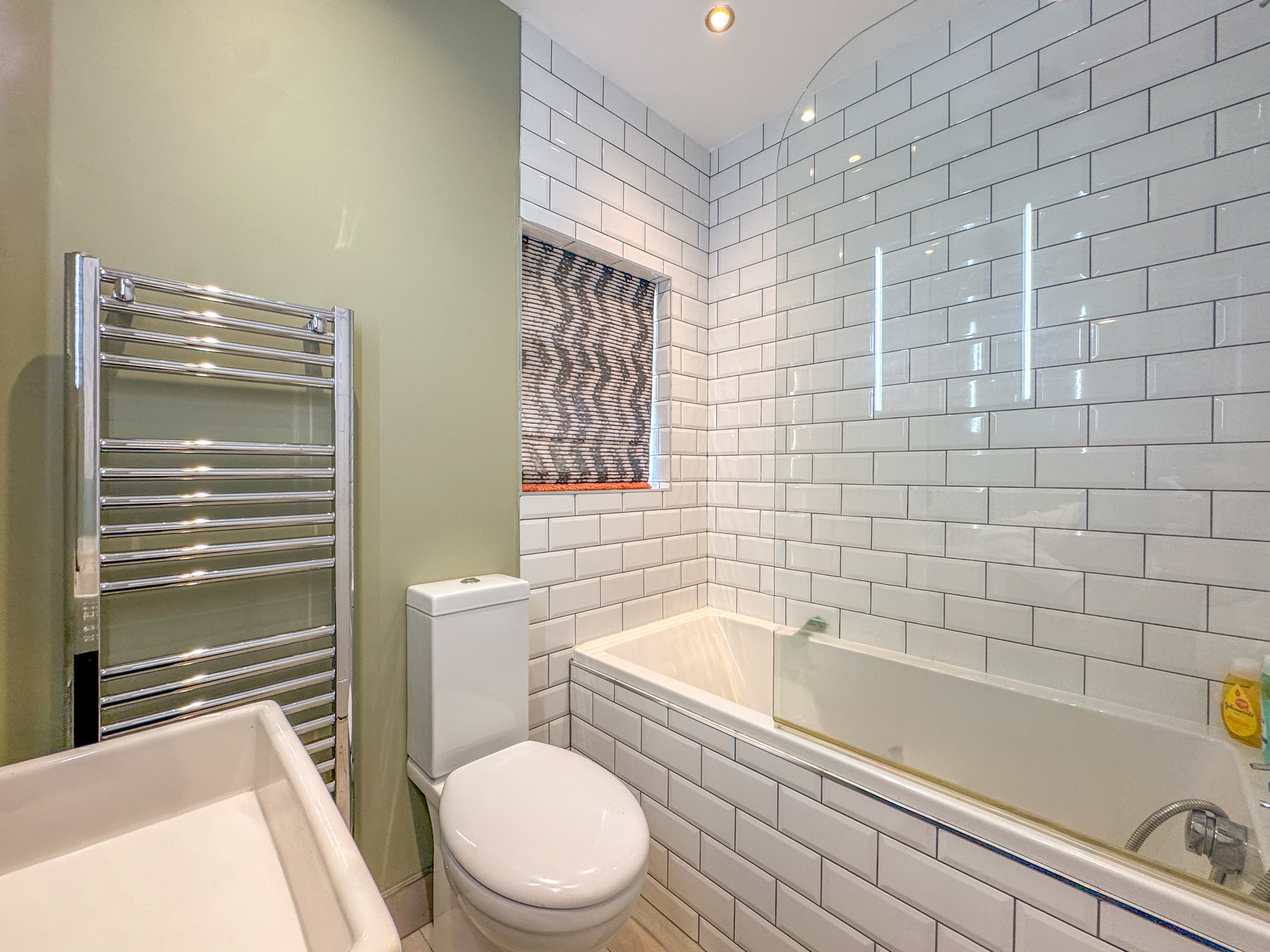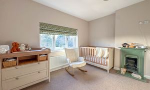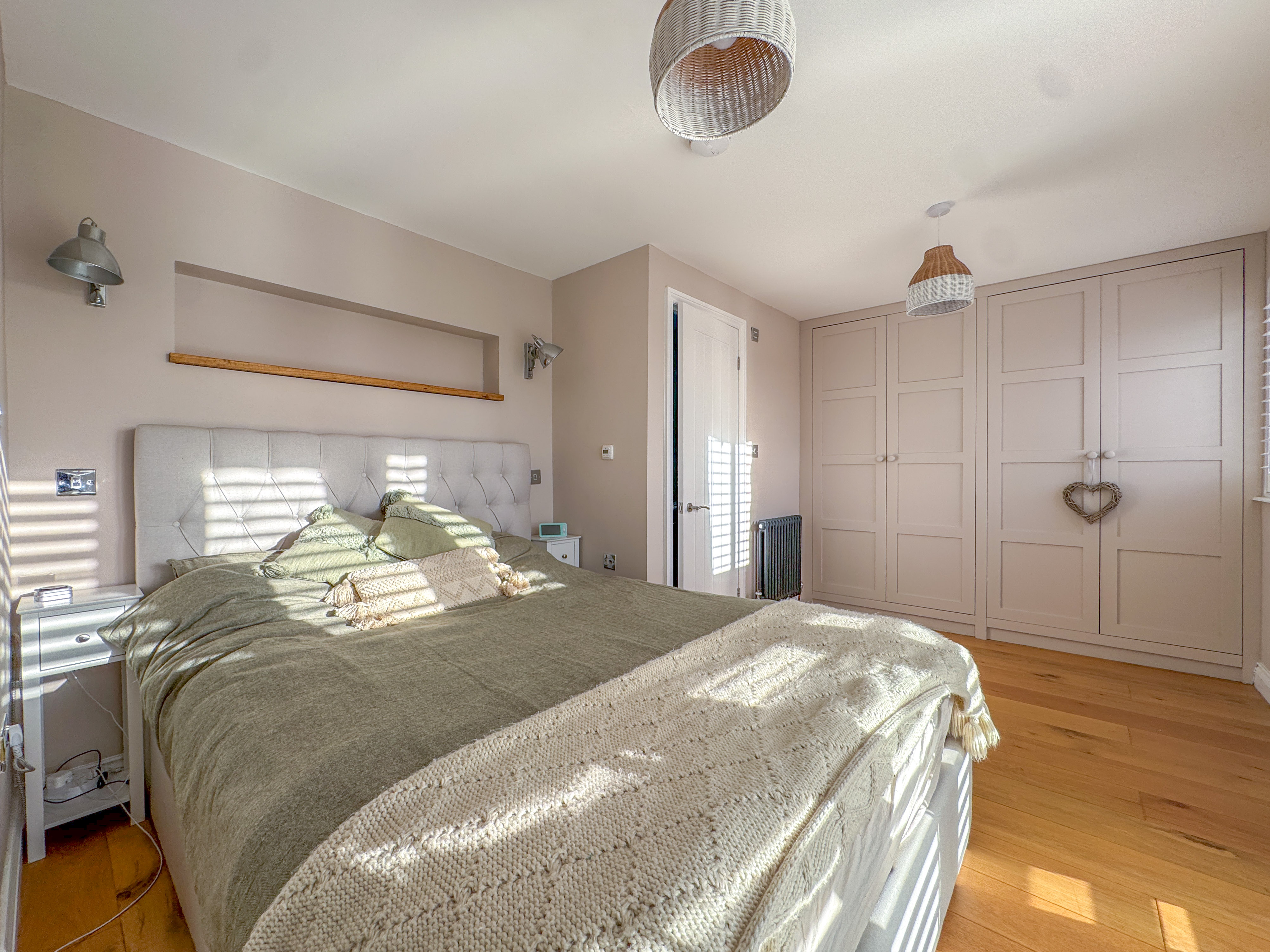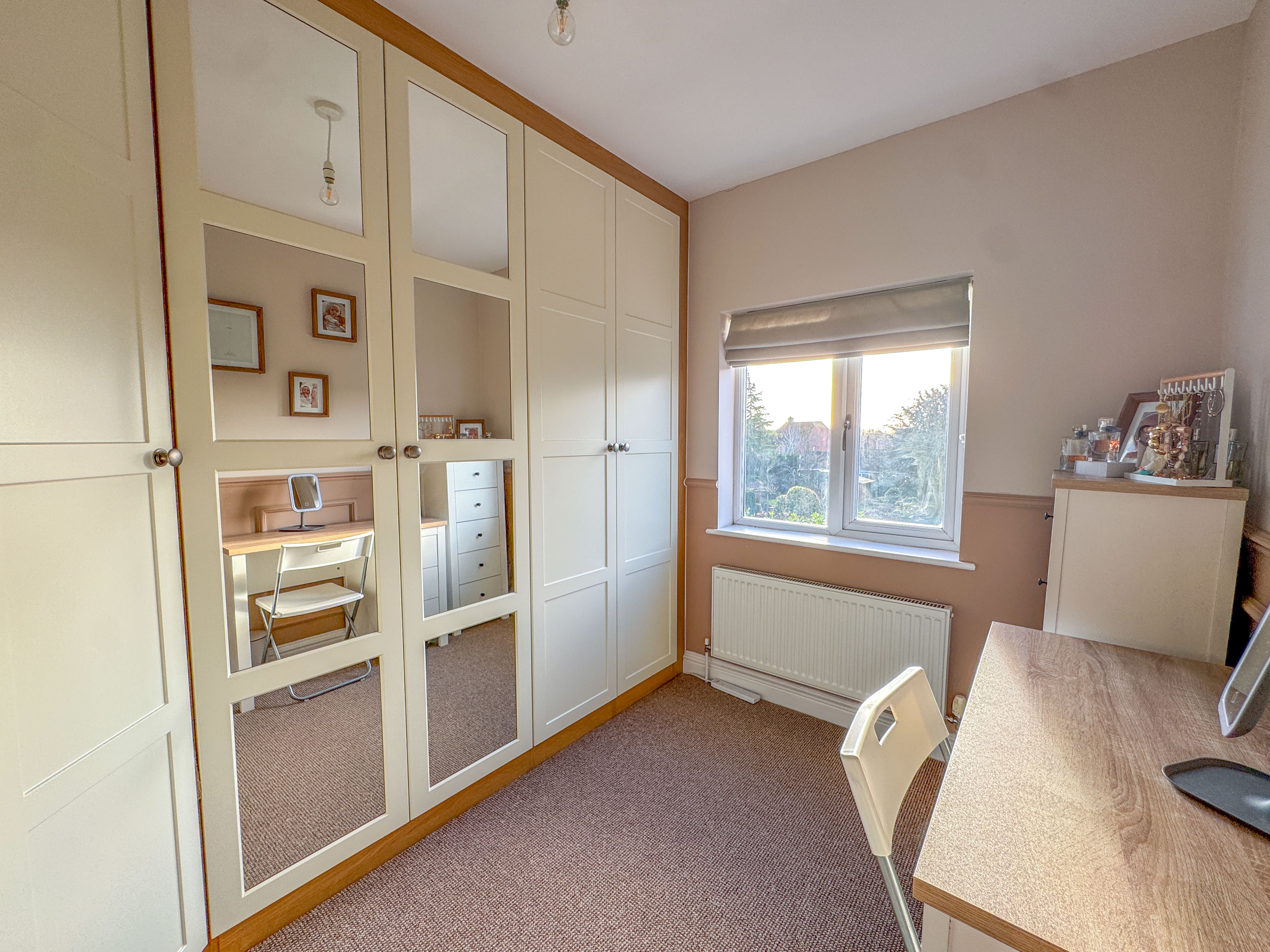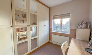 To the first floor, you'll find three well-proportioned bedrooms, including two generous doubles—one with a feature bay window to the front and another with a cast iron fireplace to the rear. The third bedroom, currently used as a dressing room, benefits from recently installed bespoke fitted wardrobes. These rooms are served by a stylish family bathroom, comprising a white three-piece suite with mains-powered shower.