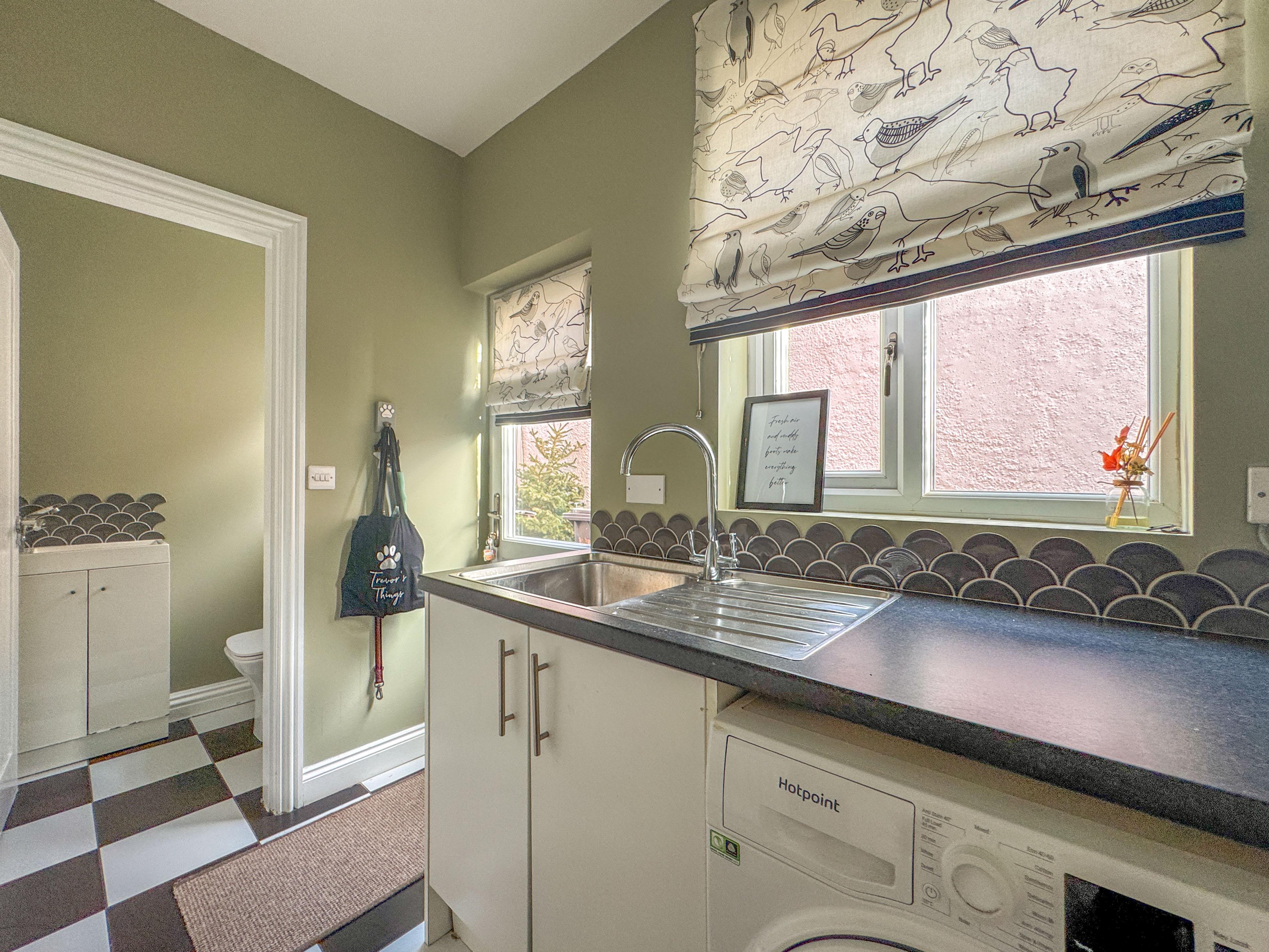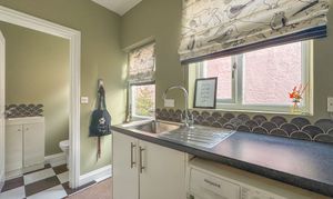 A utility room with further units and plumbing for a washing machine provides practical functionality, alongside a modern WC/guest cloakroom.