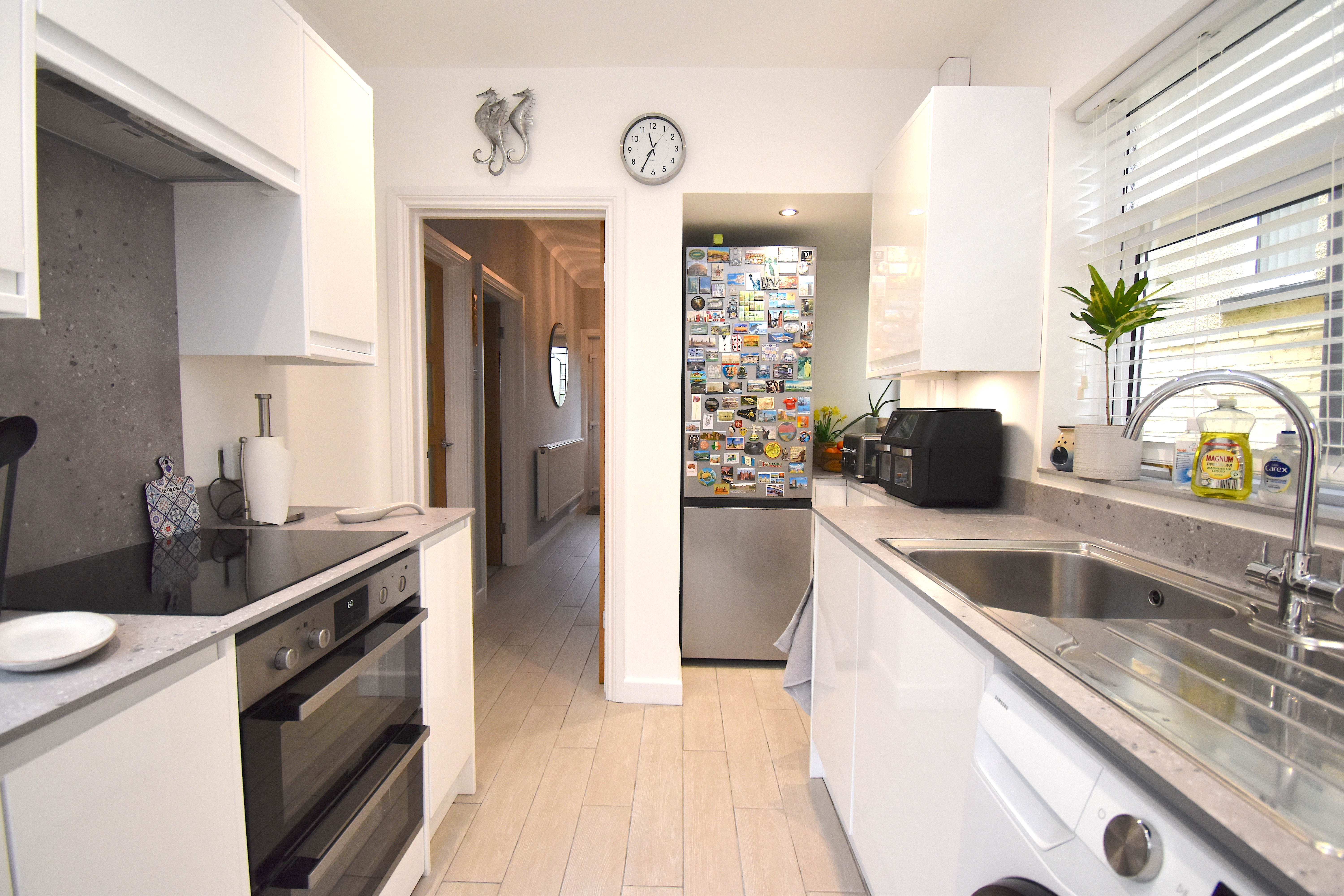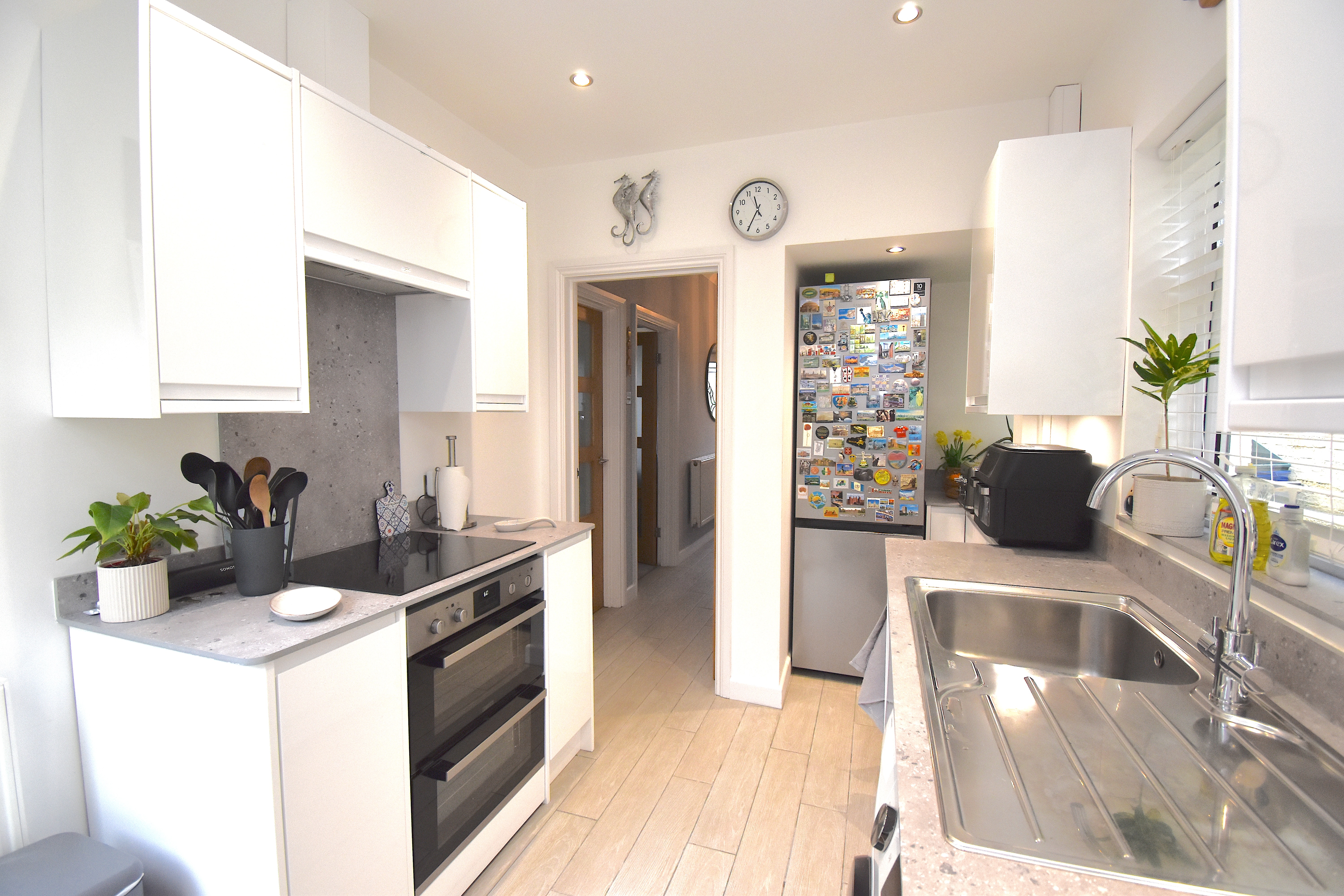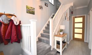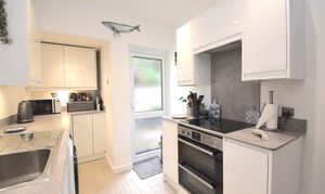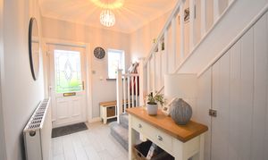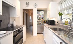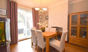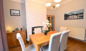 Entering through a spacious hallway, you are welcomed by a cosy and warm front living room with a bay window that provides fantastic views and plenty of natural light. The rear-facing dining room is versatile and can be used as a second lounge, making it ideal for both entertaining and relaxing. The modern white kitchen is equipped with ample worktop space and plenty of cupboards, ensuring a practical and stylish cooking environment. Upstairs, a spacious landing offers additional storage, while two generous double bedrooms and a well-proportioned single bedroom provide flexible accommodation for families or guests. The modern bathroom features tiled walls and a contemporary shower cubicle, creating a sleek and functional space.