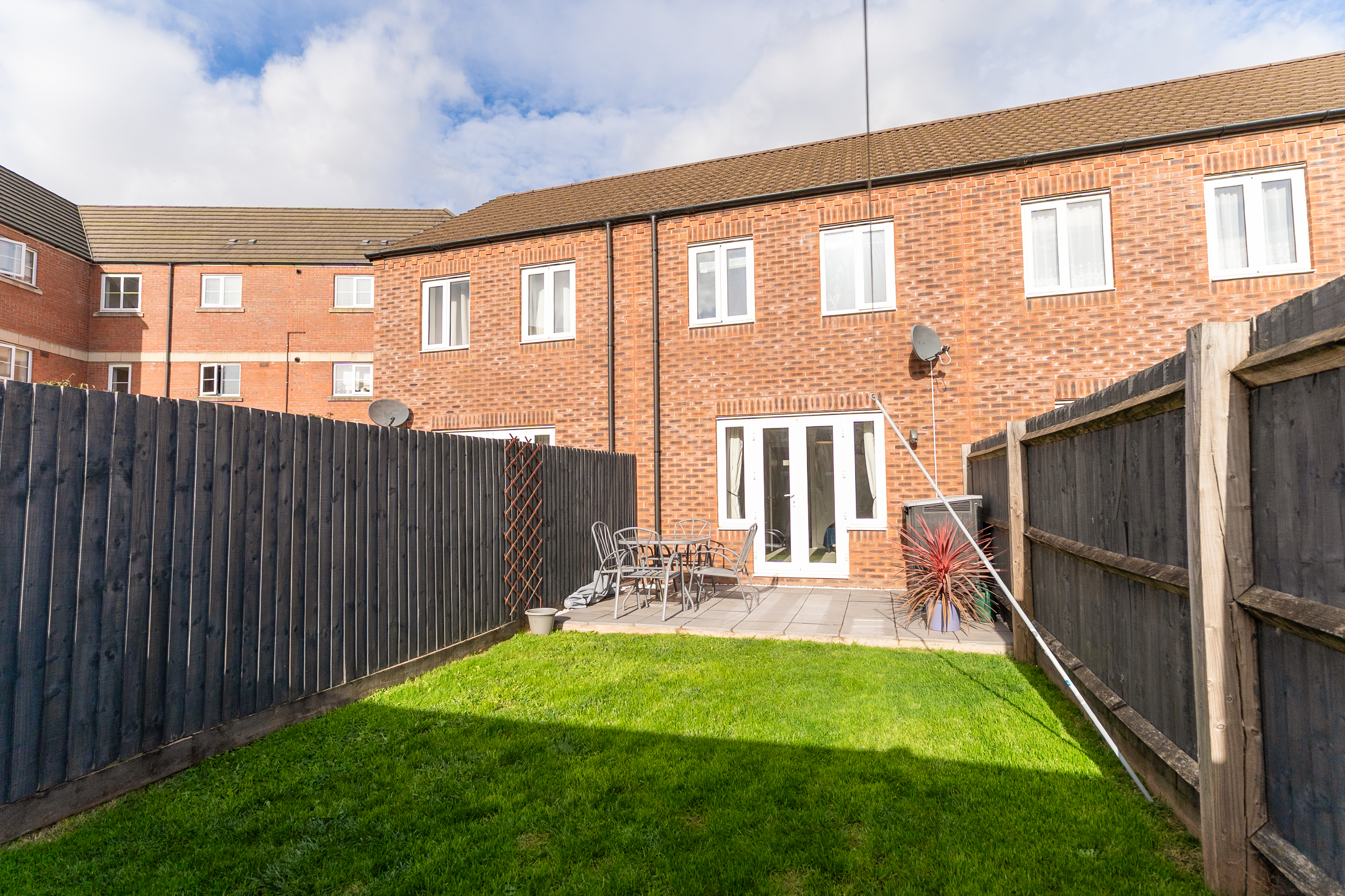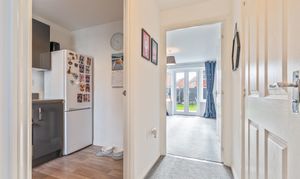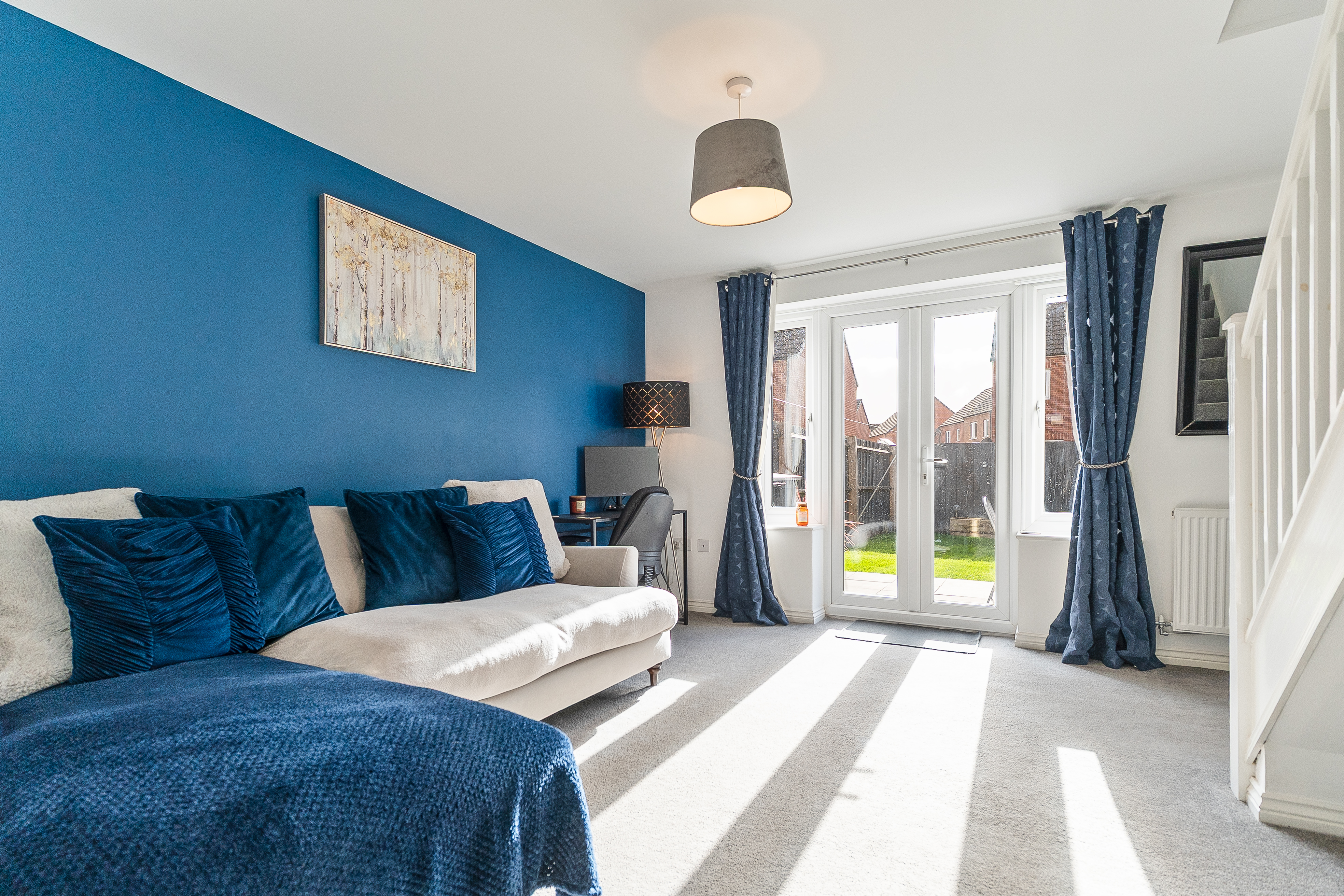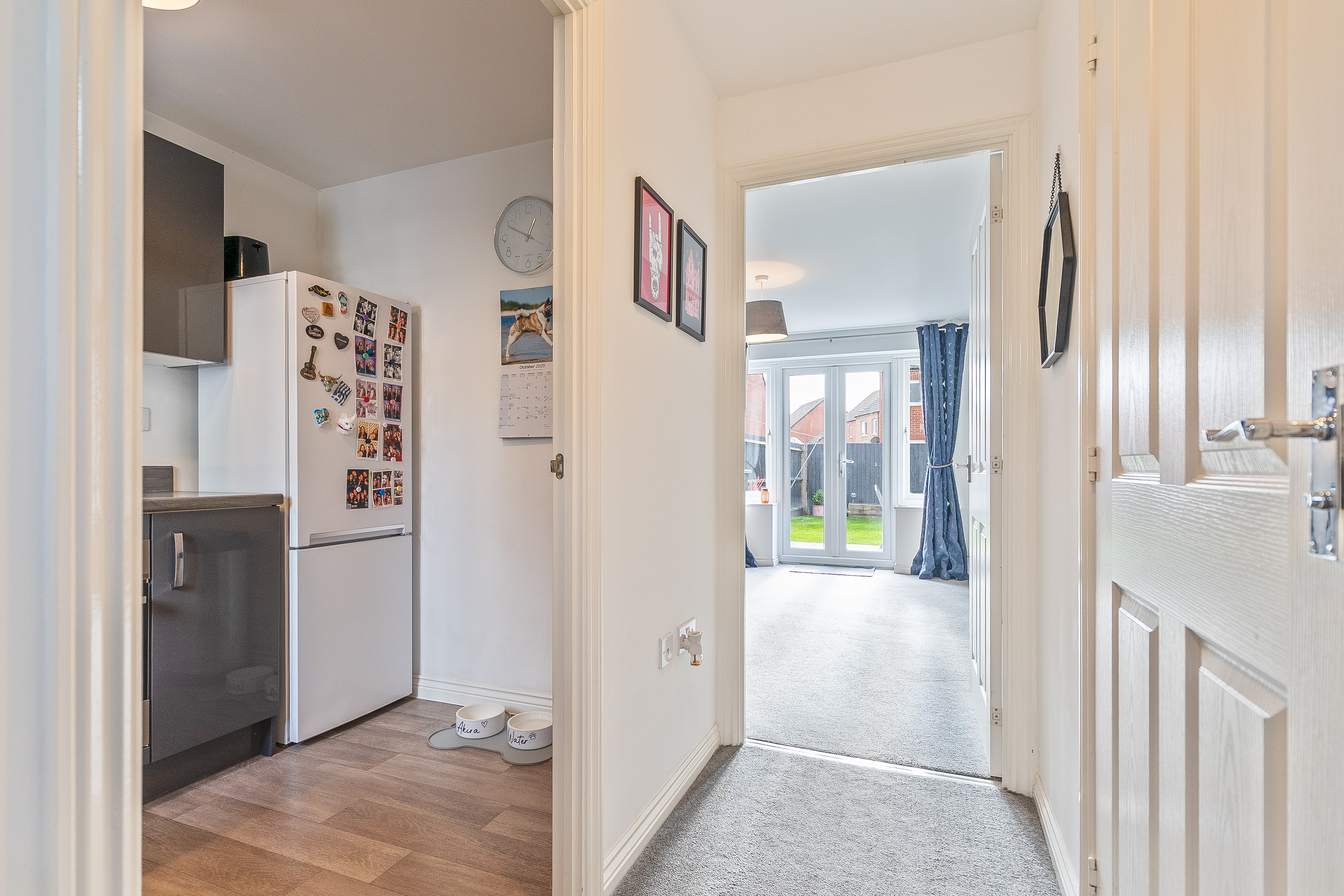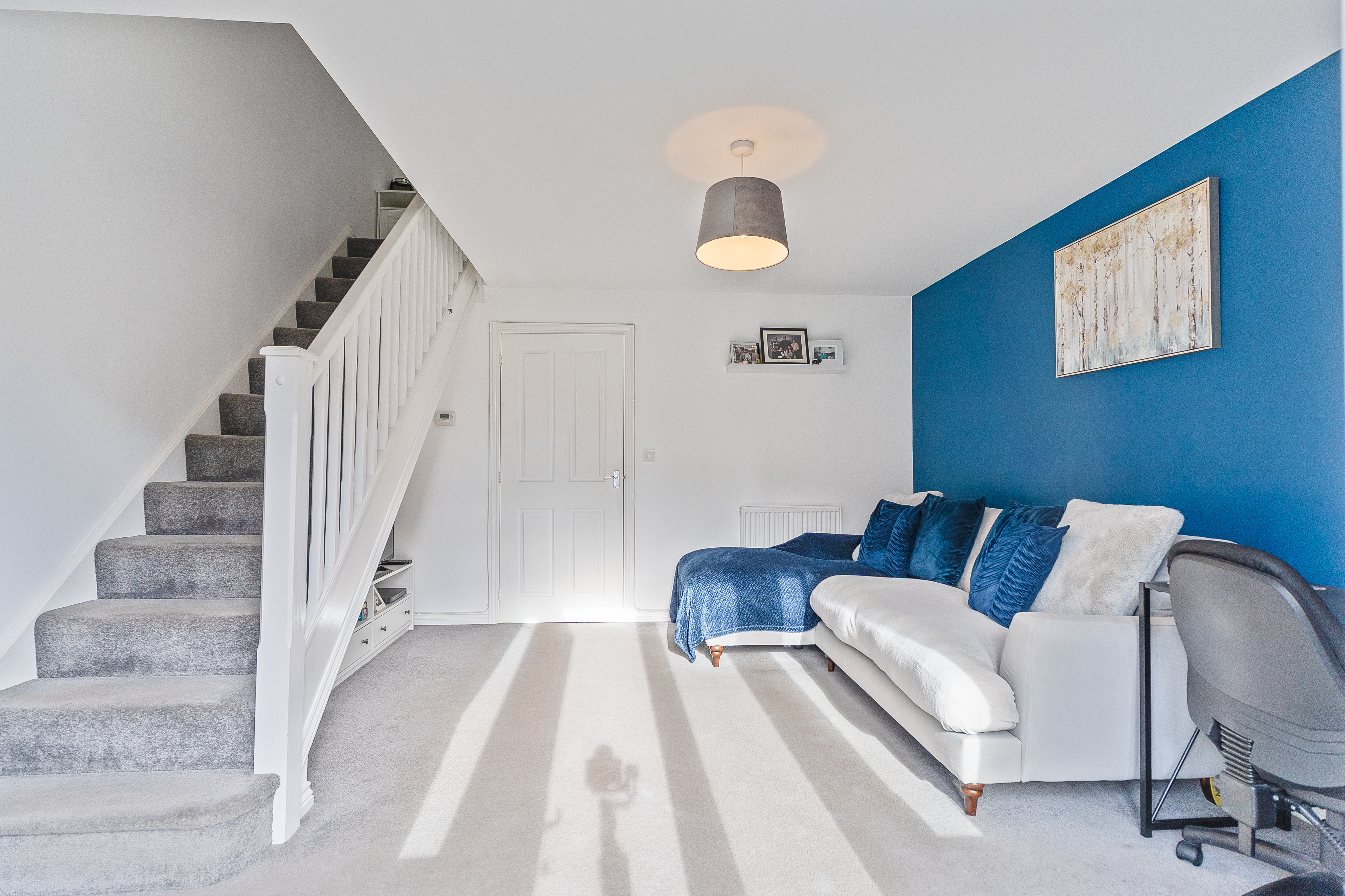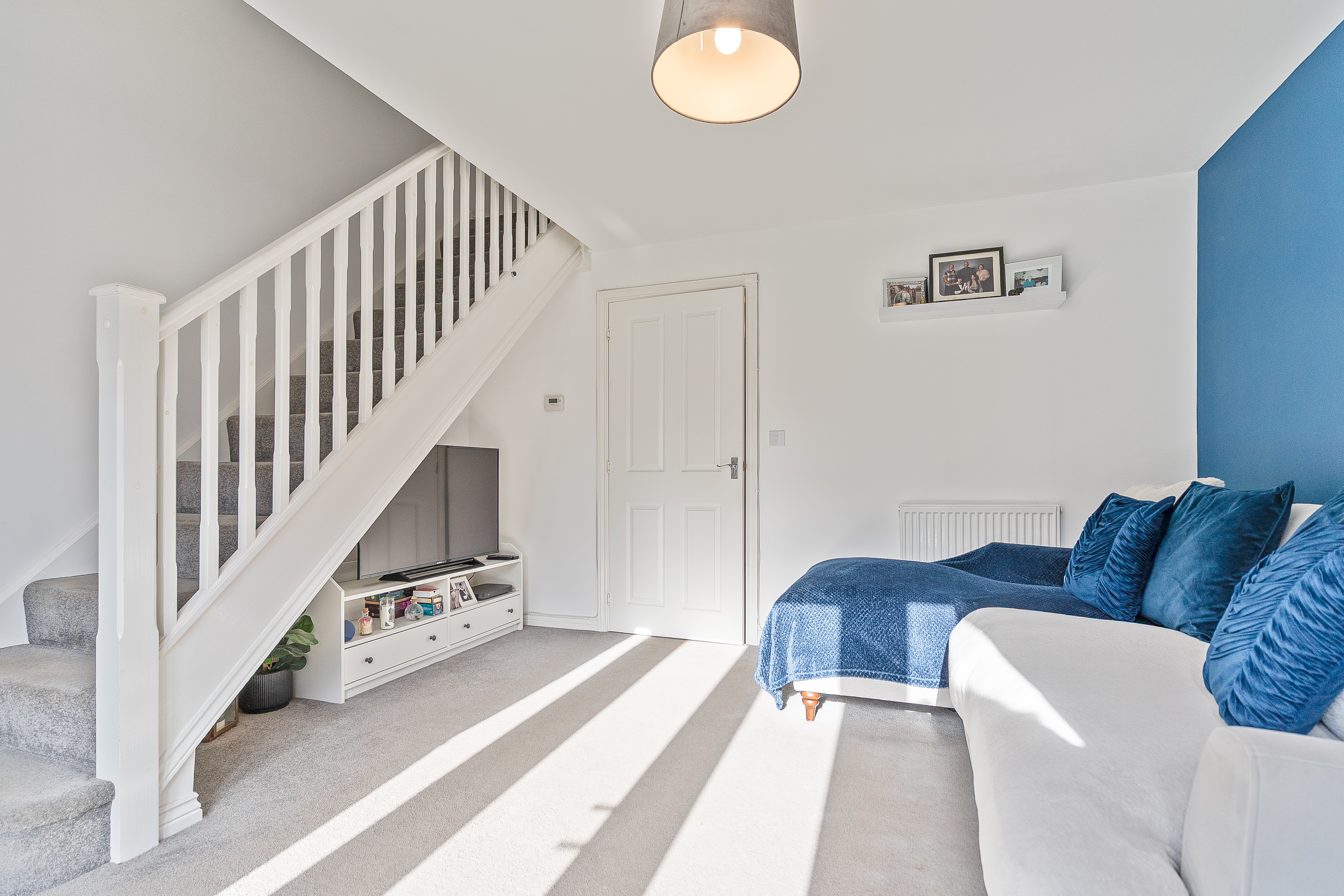 Upon entering the property, you are greeted by a welcoming hallway which provides access to the main living areas. To the right is a convenient cloakroom, complete with WC and hand basin — ideal for guests and everyday use. To the left, the kitchen offers a practical and efficient layout, fitted with ample storage and worktop space, and providing room for freestanding appliances. Moving through to the rear of the home, you’ll find the bright and spacious living area, tastefully presented and featuring patio doors that open directly onto the rear garden. This creates a seamless connection between indoor and outdoor living, making it an ideal space for relaxing or entertaining. Stairs from the living area lead up to the first floor.