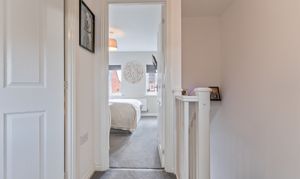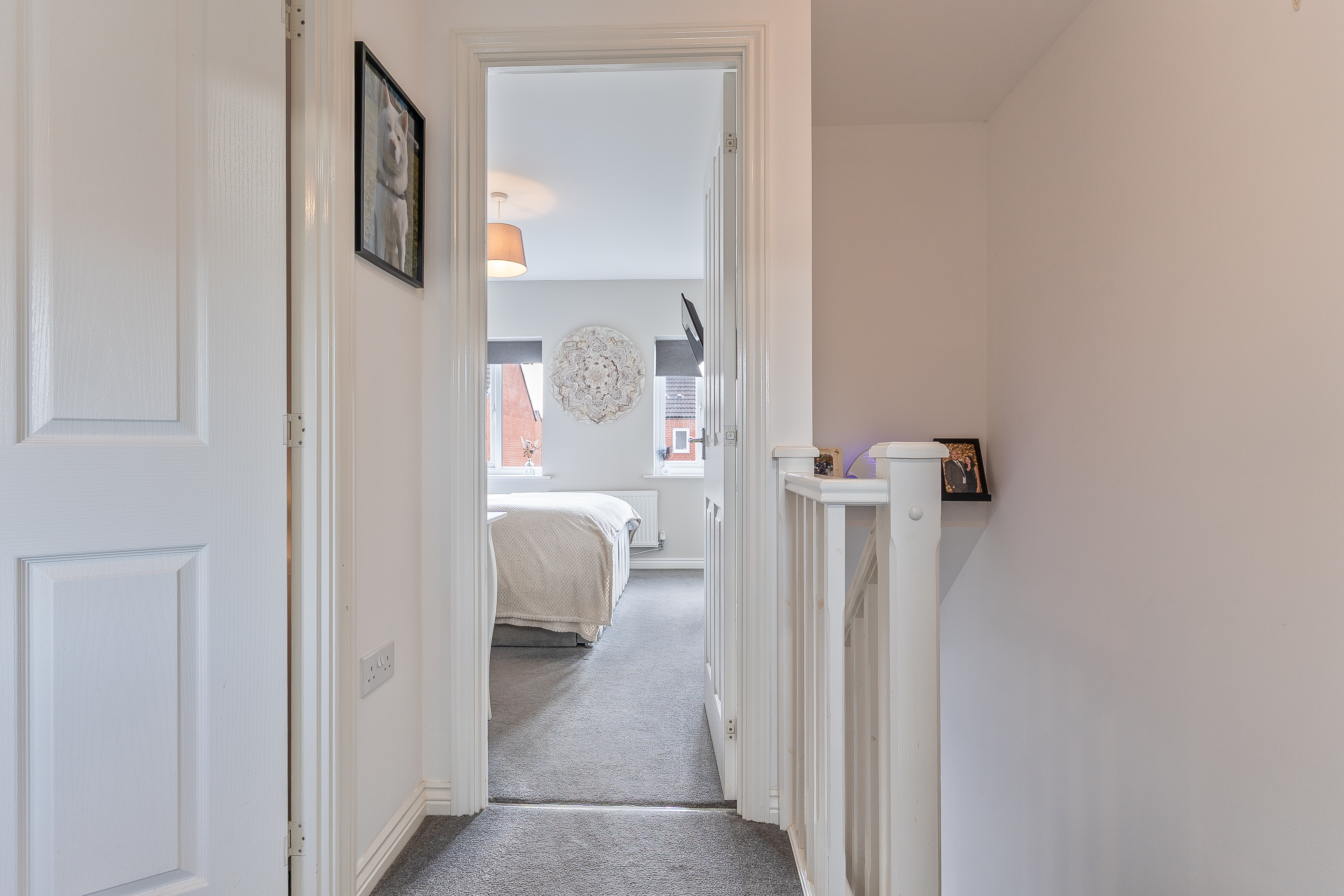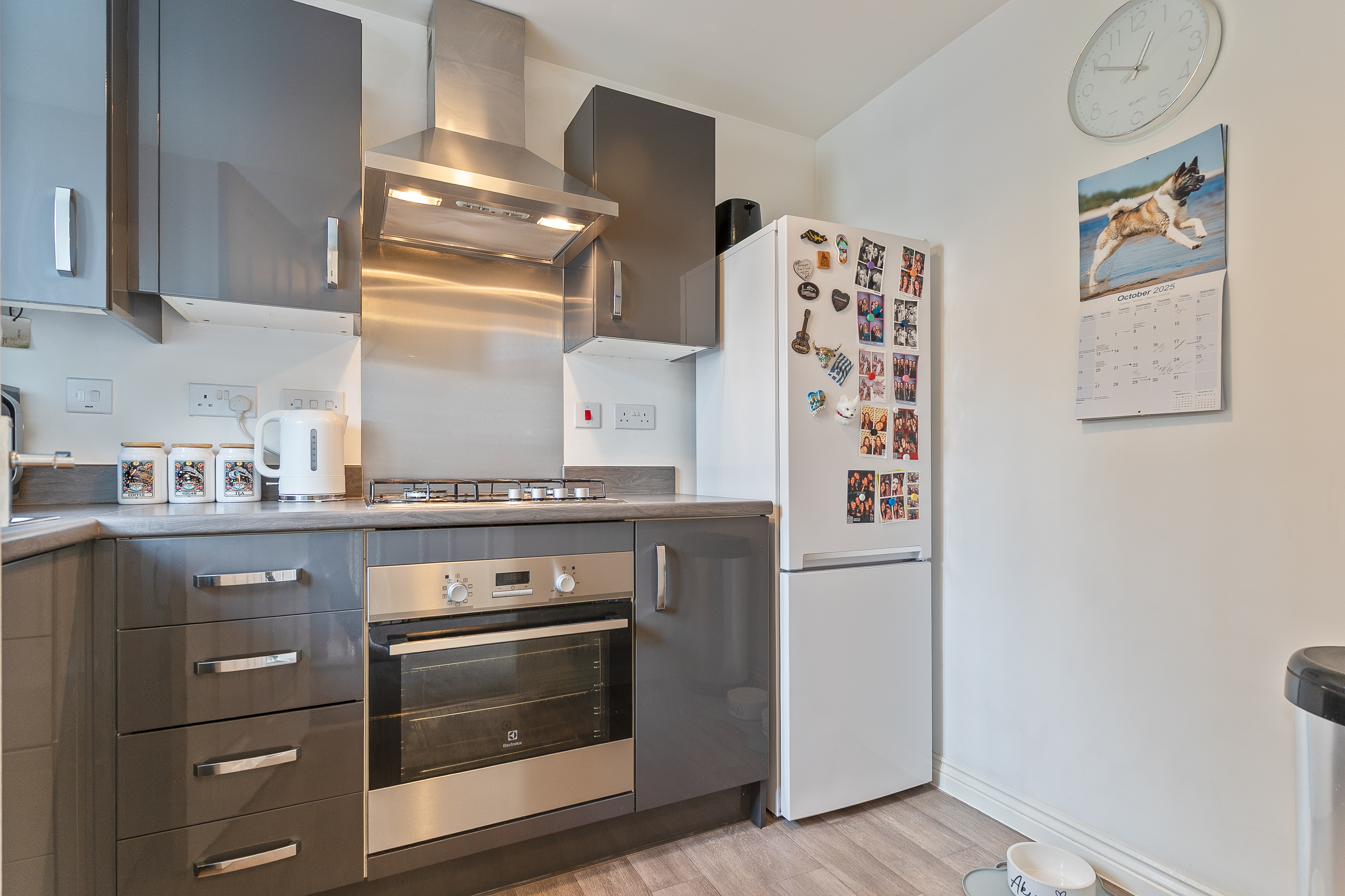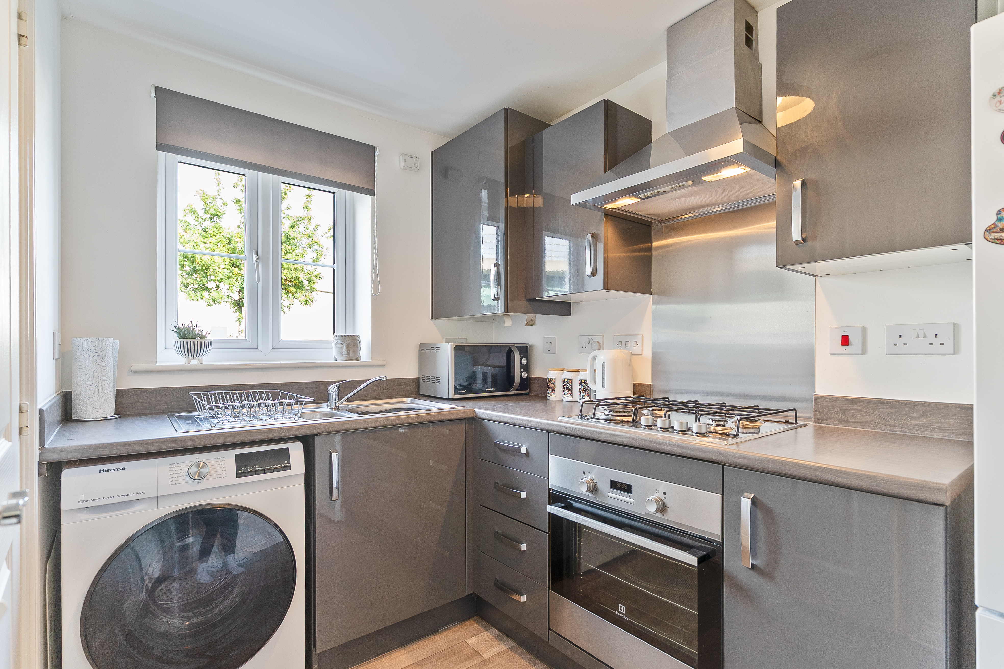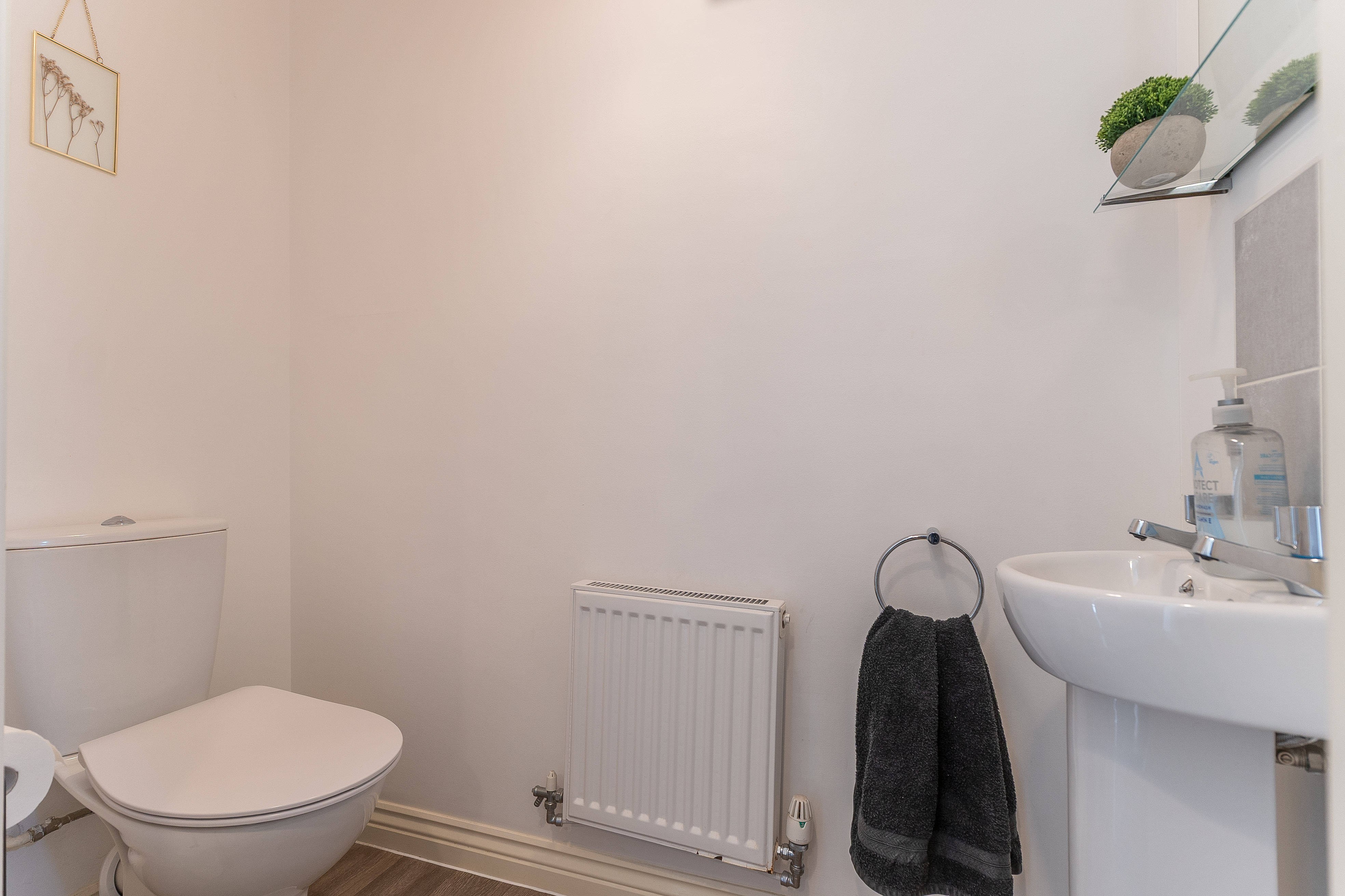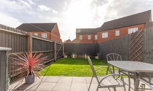 Upon entering the property, you are greeted by a welcoming hallway which provides access to the main living areas. To the right is a convenient cloakroom, complete with WC and hand basin — ideal for guests and everyday use. To the left, the kitchen offers a practical and efficient layout, fitted with ample storage and worktop space, and providing room for freestanding appliances. Moving through to the rear of the home, you’ll find the bright and spacious living area, tastefully presented and featuring patio doors that open directly onto the rear garden. This creates a seamless connection between indoor and outdoor living, making it an ideal space for relaxing or entertaining. Stairs from the living area lead up to the first floor.