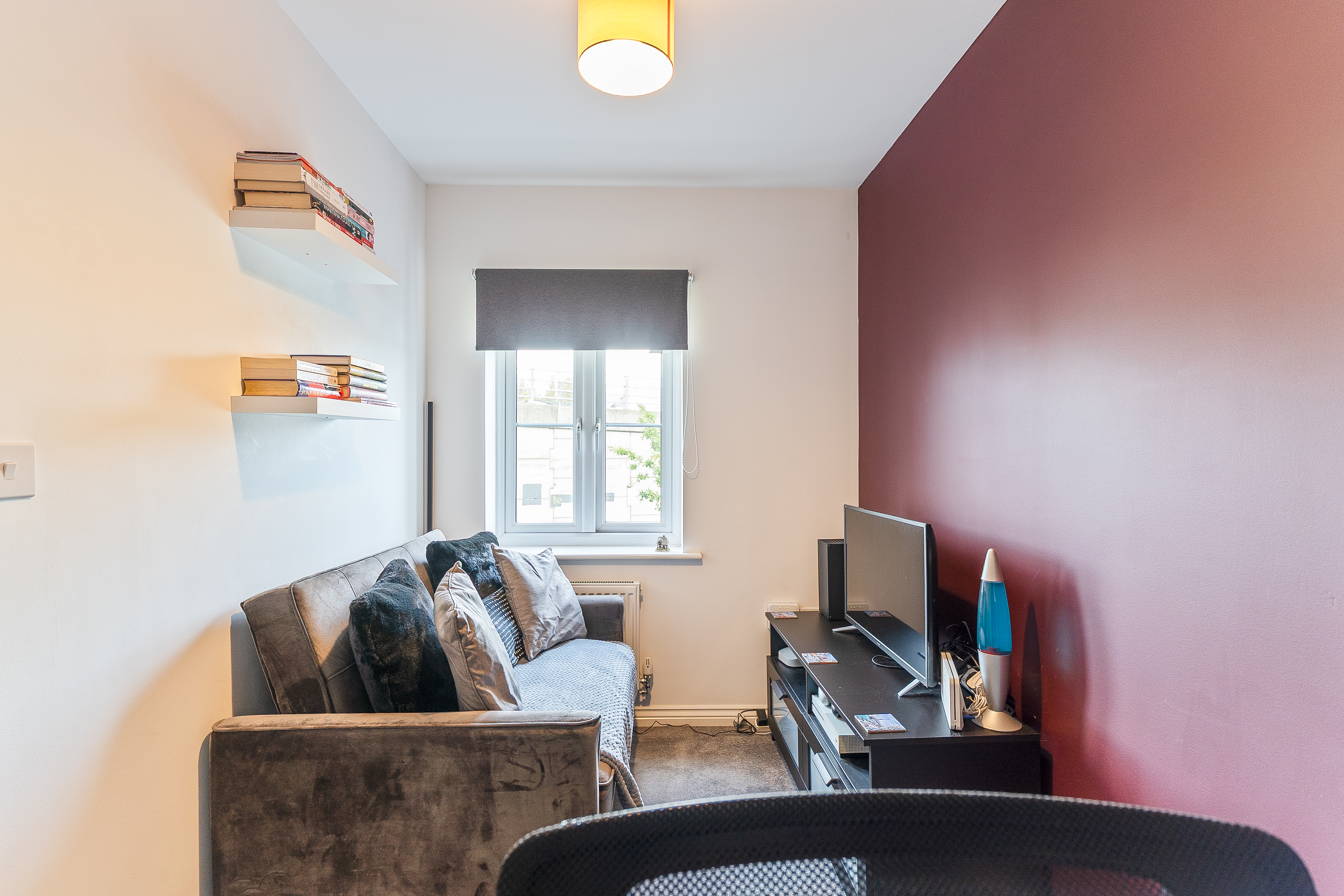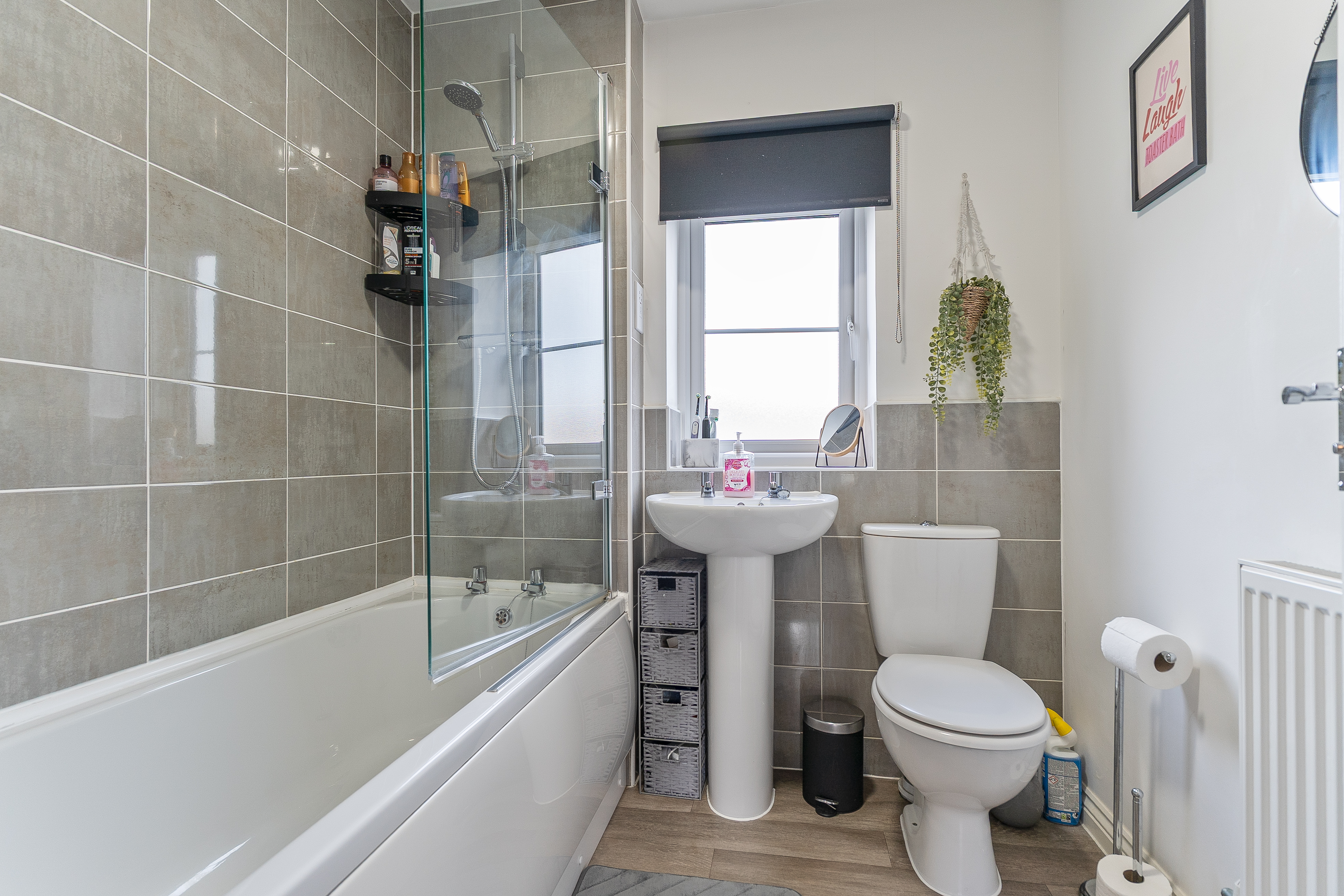 The first floor comprises two bedrooms — one generous double and one single — both decorated in a modern and neutral style. The second bedroom could also serve as a nursery, guest room, or home office, depending on the needs of the household. Completing this level is the bathroom, which is fitted with a modern white suite including a bath with overhead shower, WC, and hand basin.