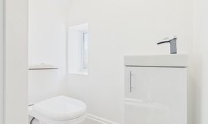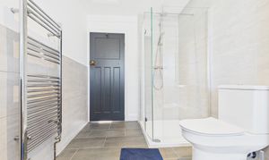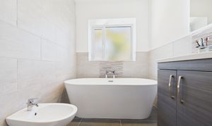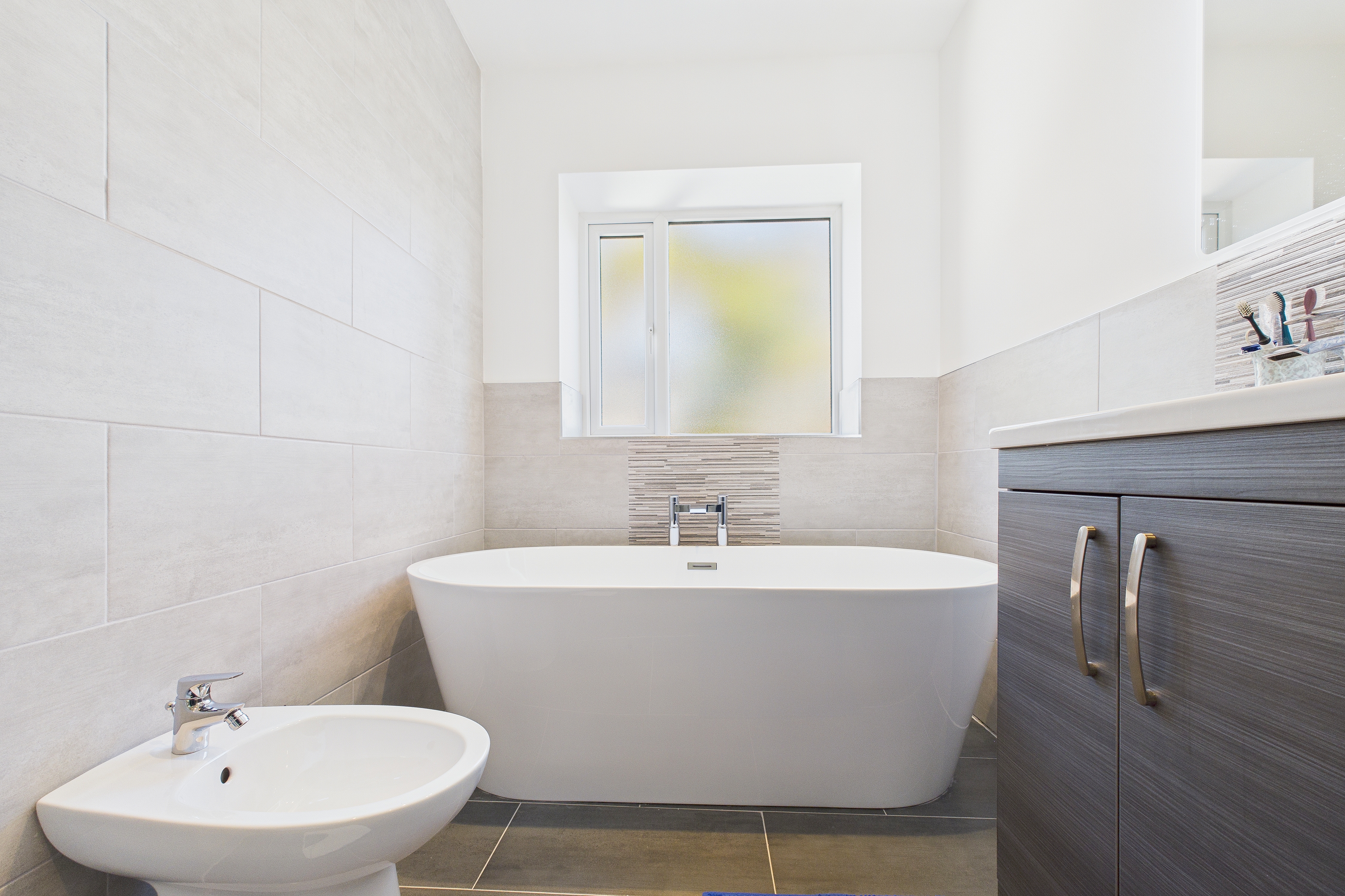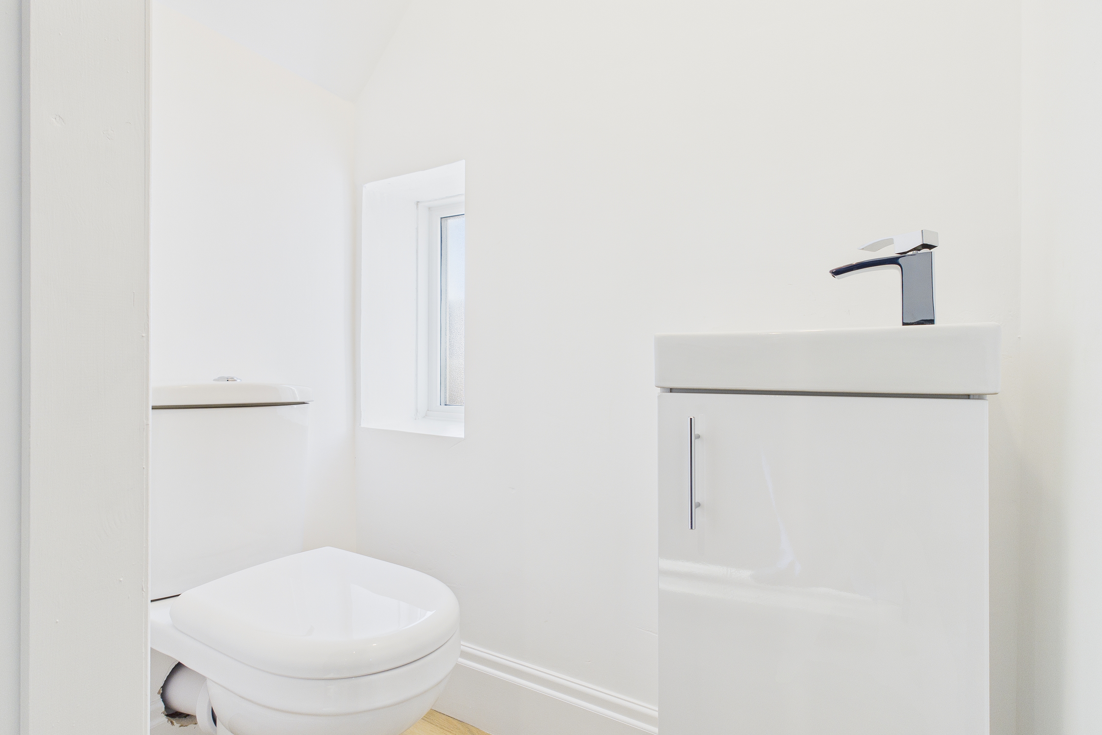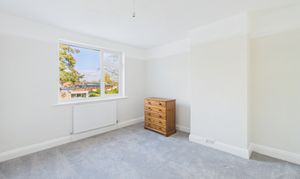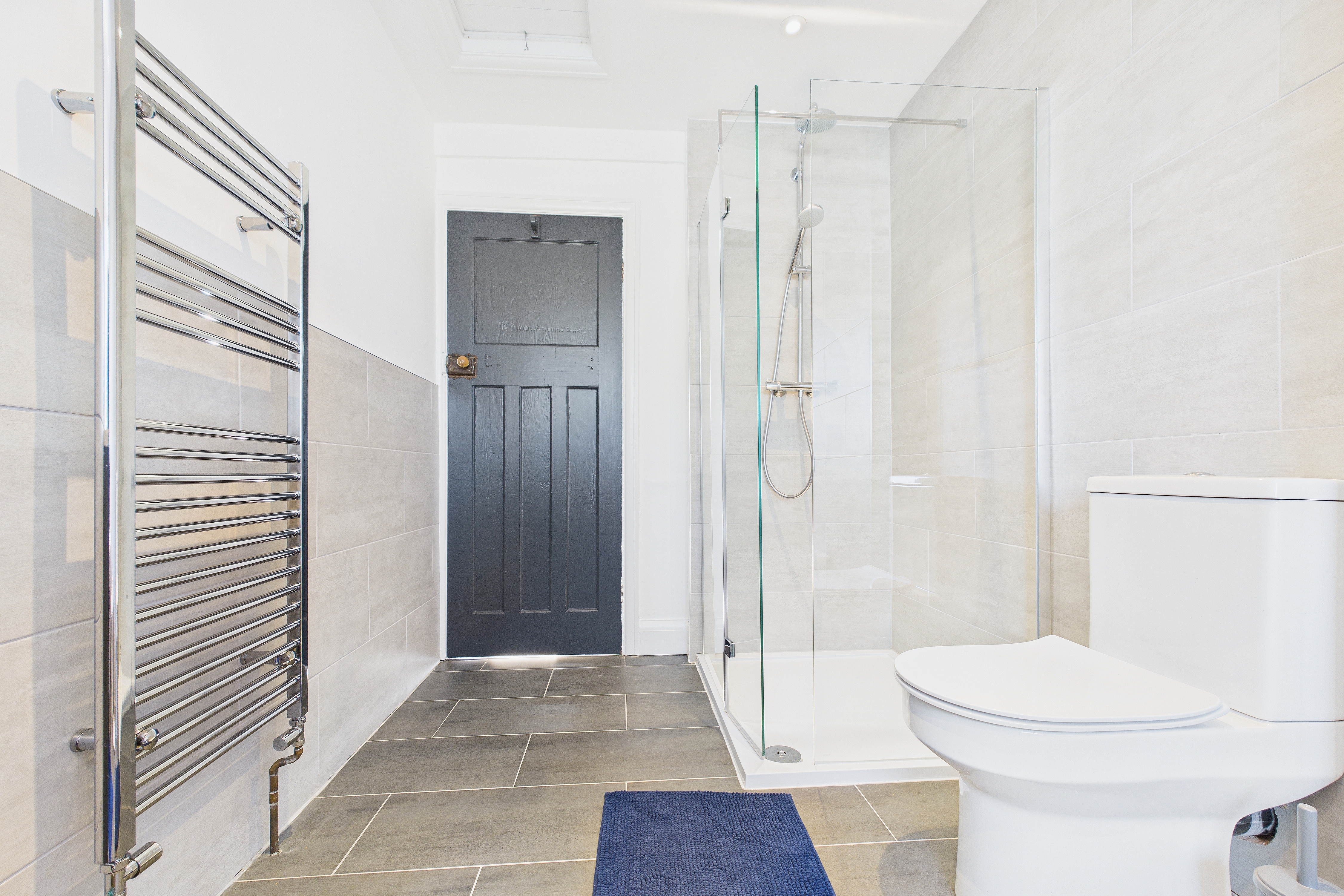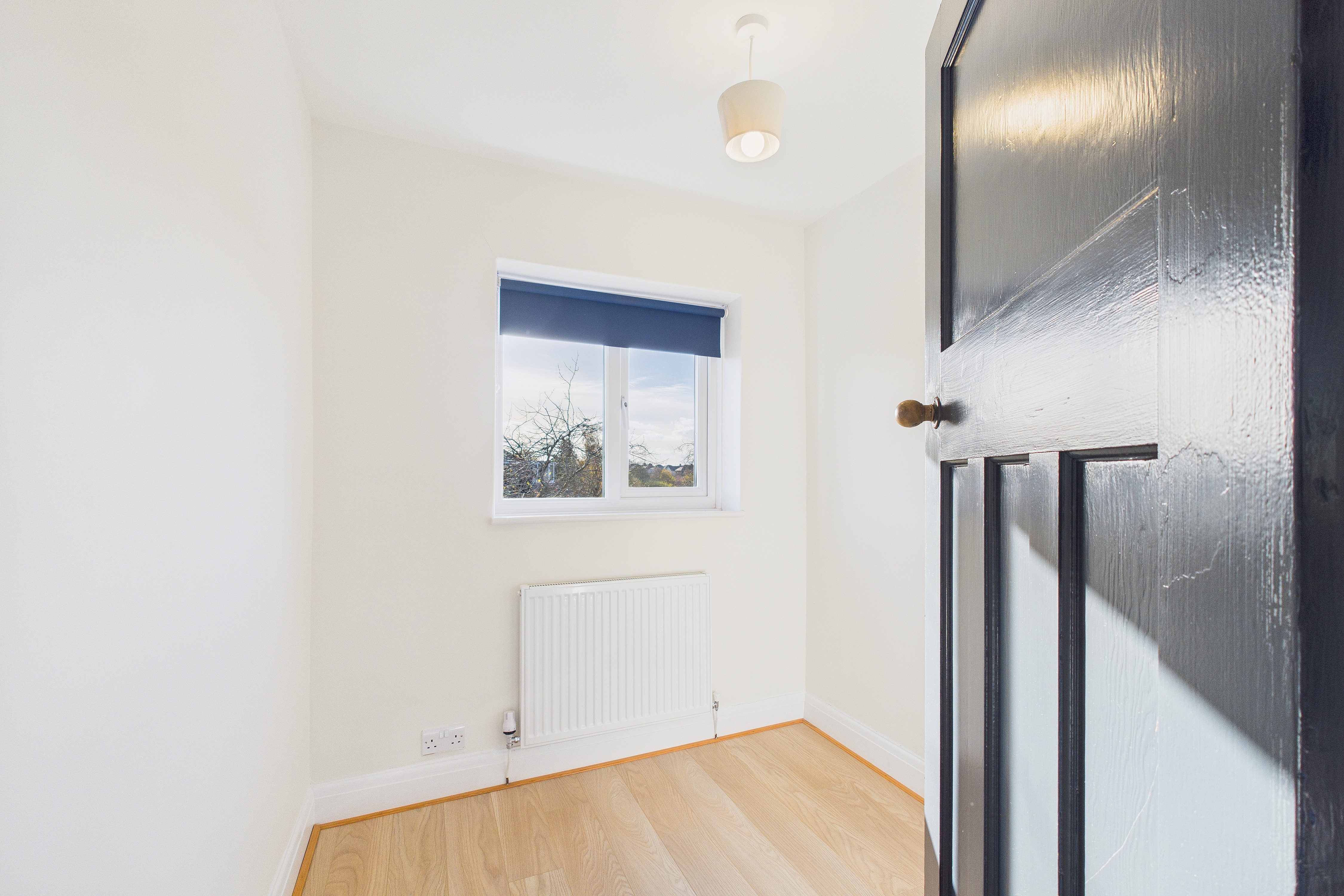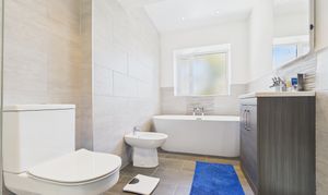 To the first floor, the landing with spindled balustrade provides access to all three bedrooms—two doubles and a smaller single, ideal as a home office if required. The two front bedrooms enjoy a pleasant outlook, and all rooms are well served by the extended Bathroom. This exceptional space features a modern five-piece white suite comprising a shower enclosure with glazed screen and dual mixer controls, low-level WC, panelled bath, vanity wash basin, and bidet, complemented by quality floor and wall tiling.