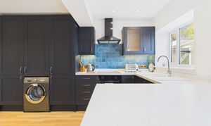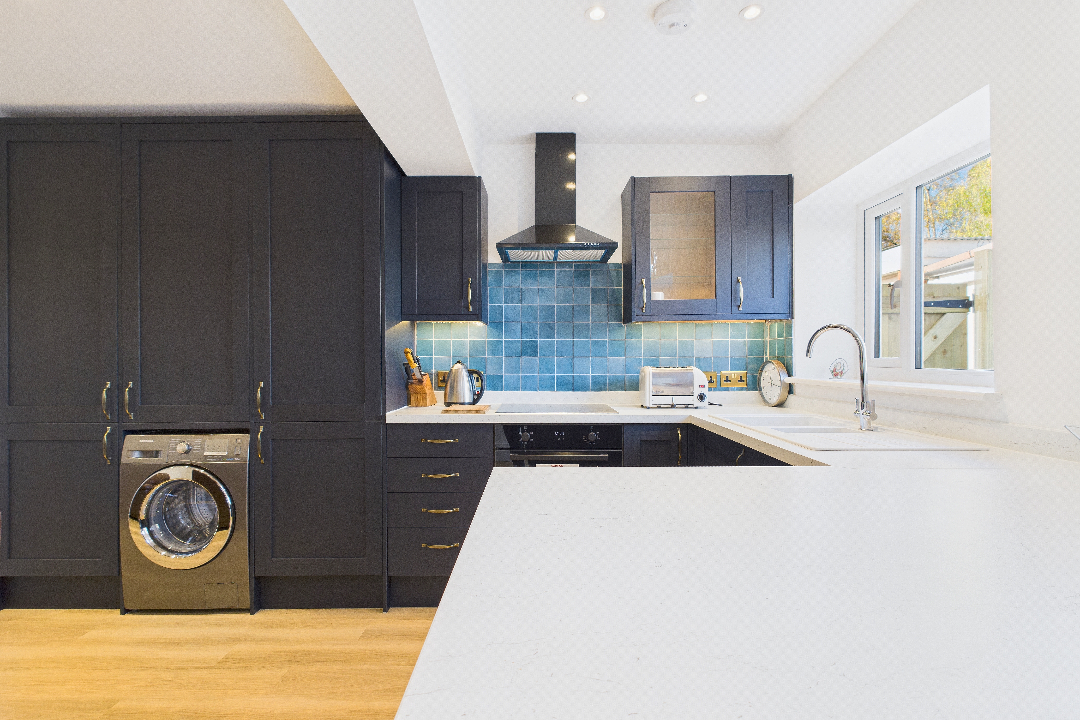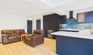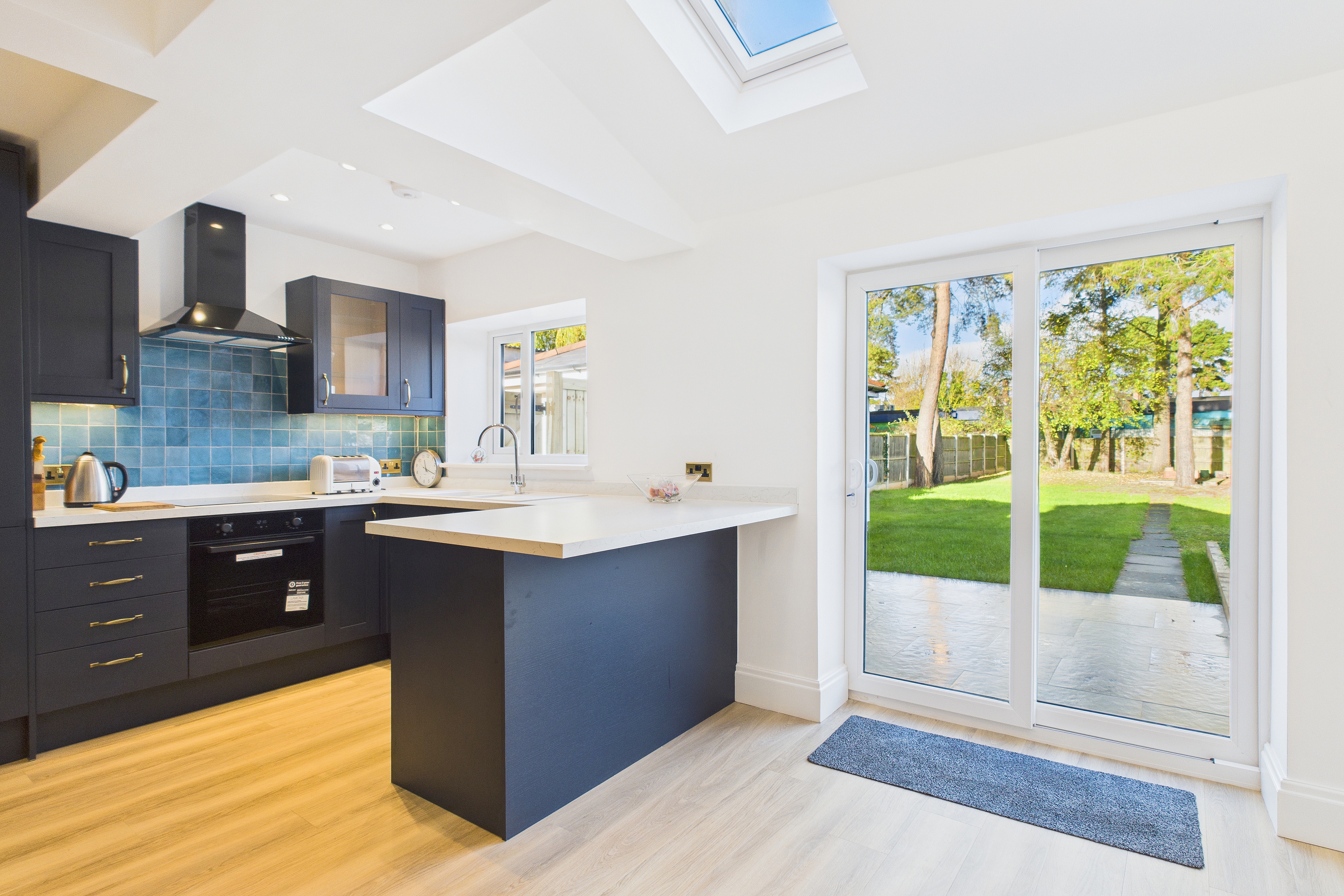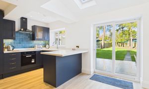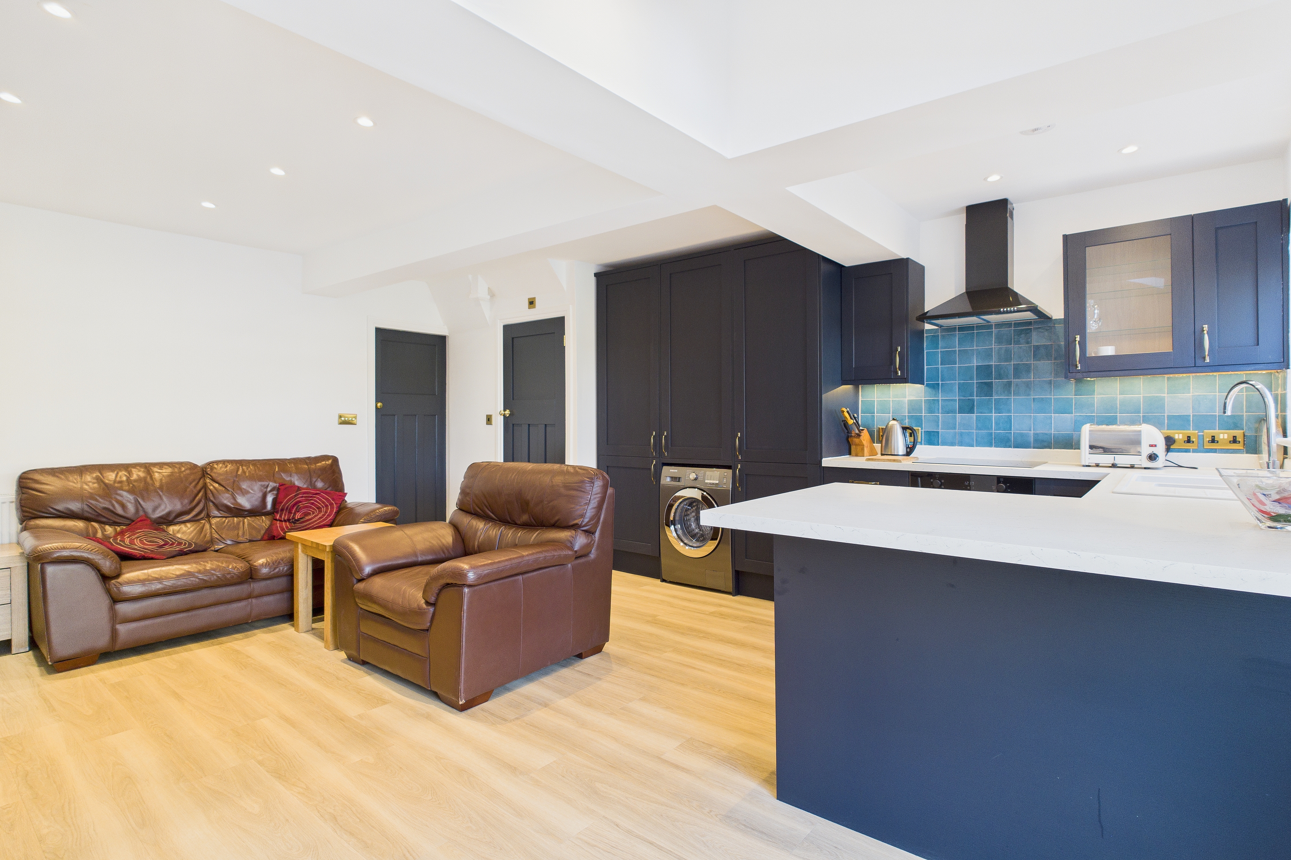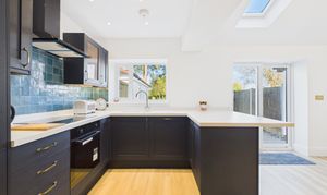 - Modern open-plan living kitchen with part-vaulted ceiling with sky lights