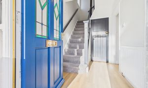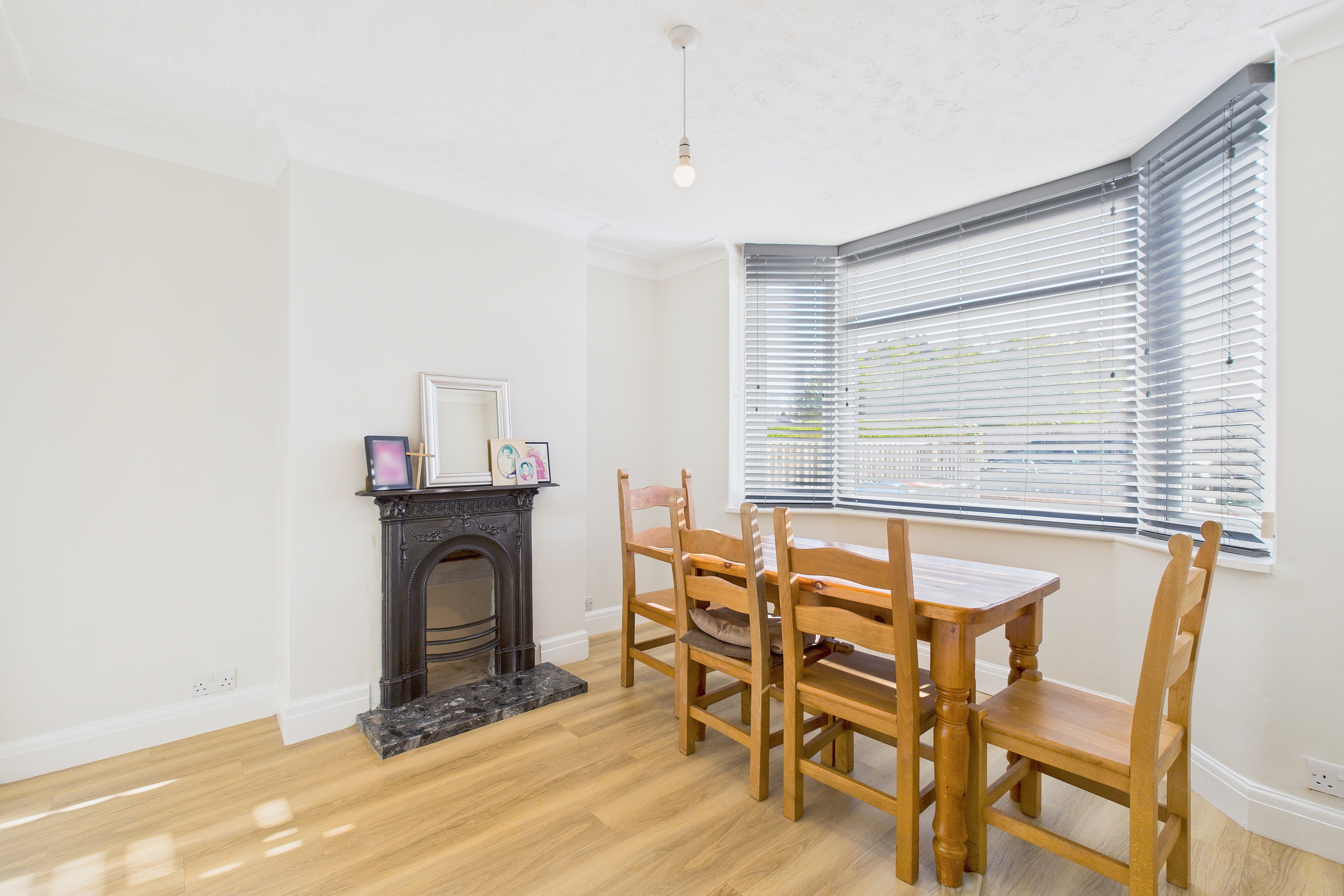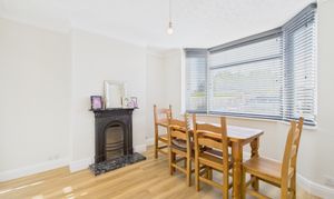 An open arched storm porch with a stained glass, leaded entrance door and side windows leads into the Entrance Hall, setting the tone for the decorative style found throughout. The spindled staircase rises to the first floor, and attractive wood-effect laminate flooring continues into both the Dining Room—an independent, bay-fronted reception room with a charming feature period cast-iron fireplace—and into the superb open-plan Living Kitchen. This wonderful area of the home, enhanced by the rear extension with part-vaulted ceiling and skylight windows, serves as its hub. The living area centres around an attractive fireplace with tiled inserts and inset living flame gas fire, while the kitchen offers a contemporary range of units with complementary fittings, impressive work surfaces with inset sink and drainer, integrated appliances, and further space/plumbing for a washing machine. uPVC double-glazed French doors open directly onto the rear terrace, creating an excellent indoor–outdoor flow. A useful downstairs cloakroom/WC completes the ground floor accommodation.