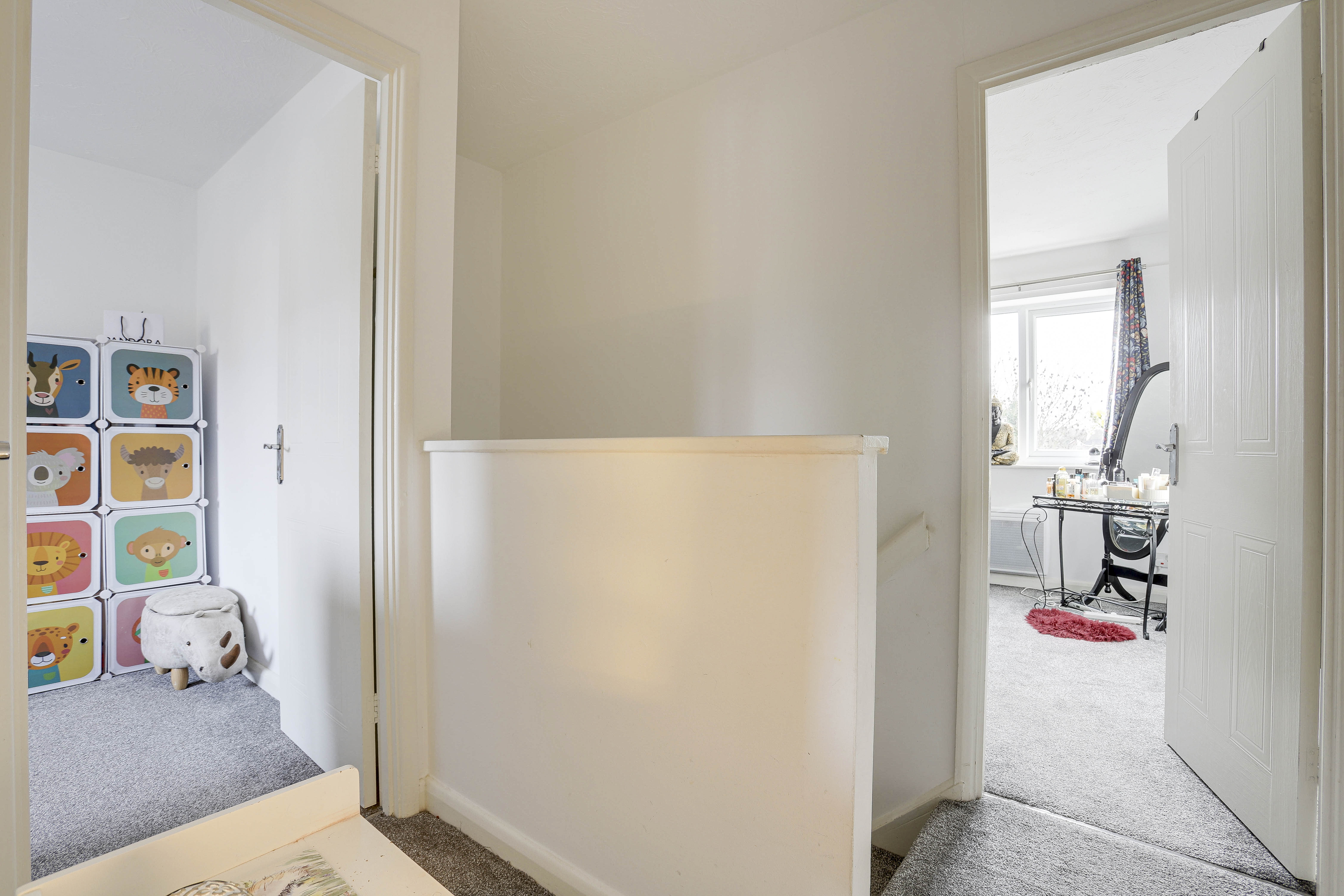 The landing has carpeted flooring, recessed spotlights, an in-built cupboard, access to the loft and access to the first floor accommodation.