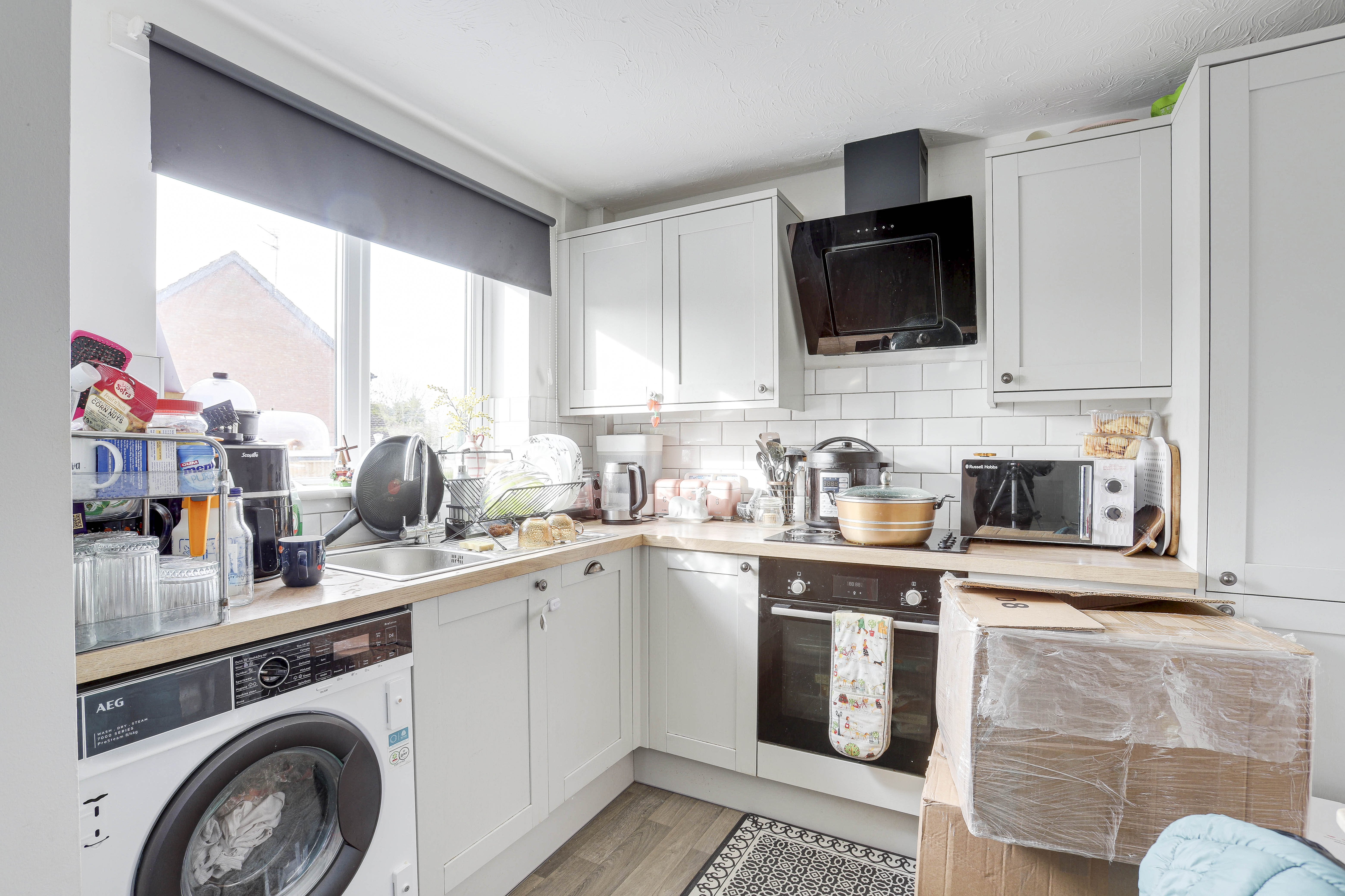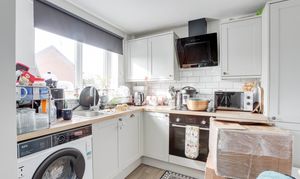 The kitchen has a range of fitted base and wall units with worktops, a stainless steel sink with a drainer and a swan neck mixer tap, an integrated oven, a hob, extractor fan, dishwasher and washing machine, partially tiled walls, vinyl flooring and a UPVC double-glazed window to the front elevation.