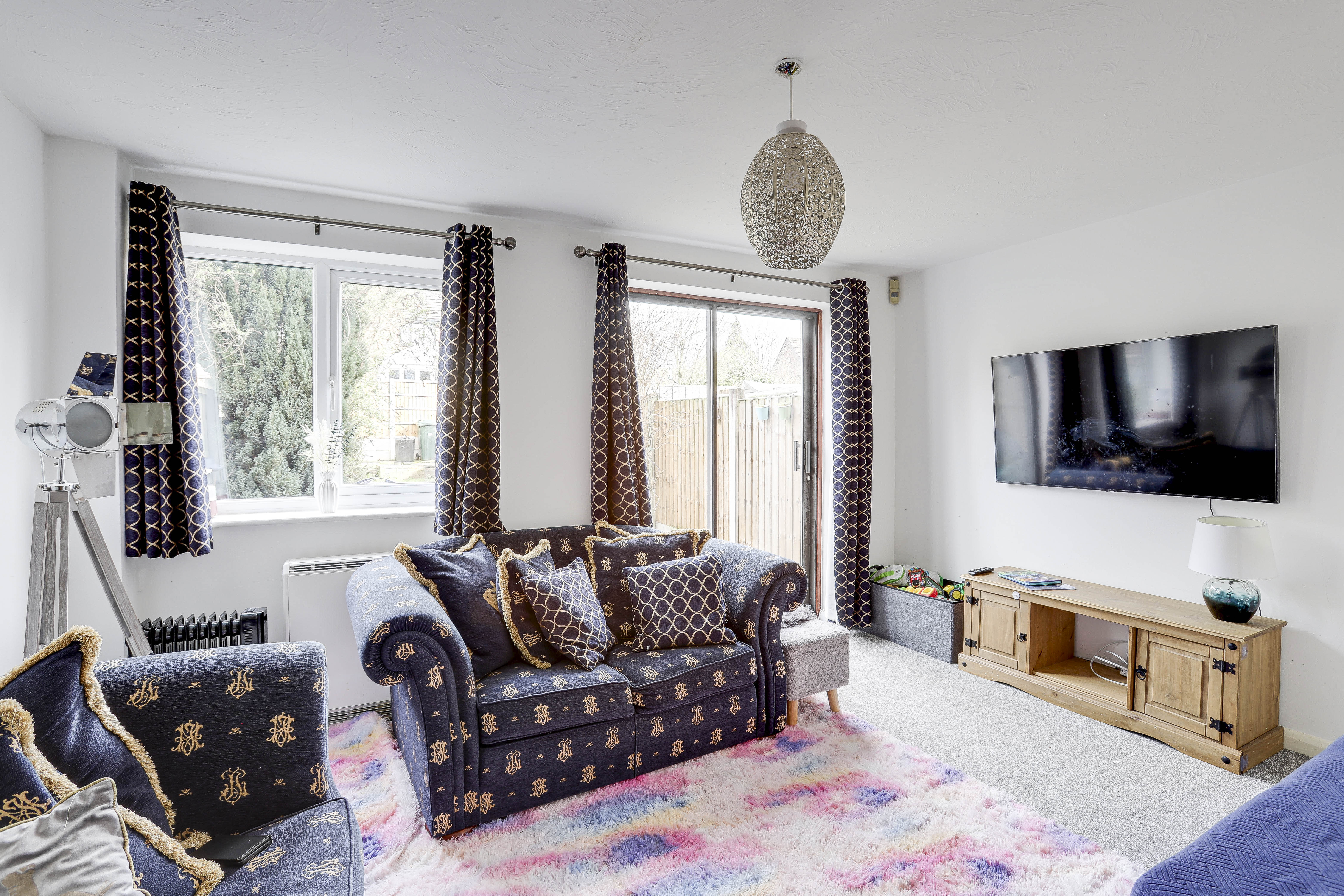 The living room has carpeted flooring, an electric room heater, a UPVC double-glazed window to the rear elevation and a sliding patio door providing access to the rear garden.