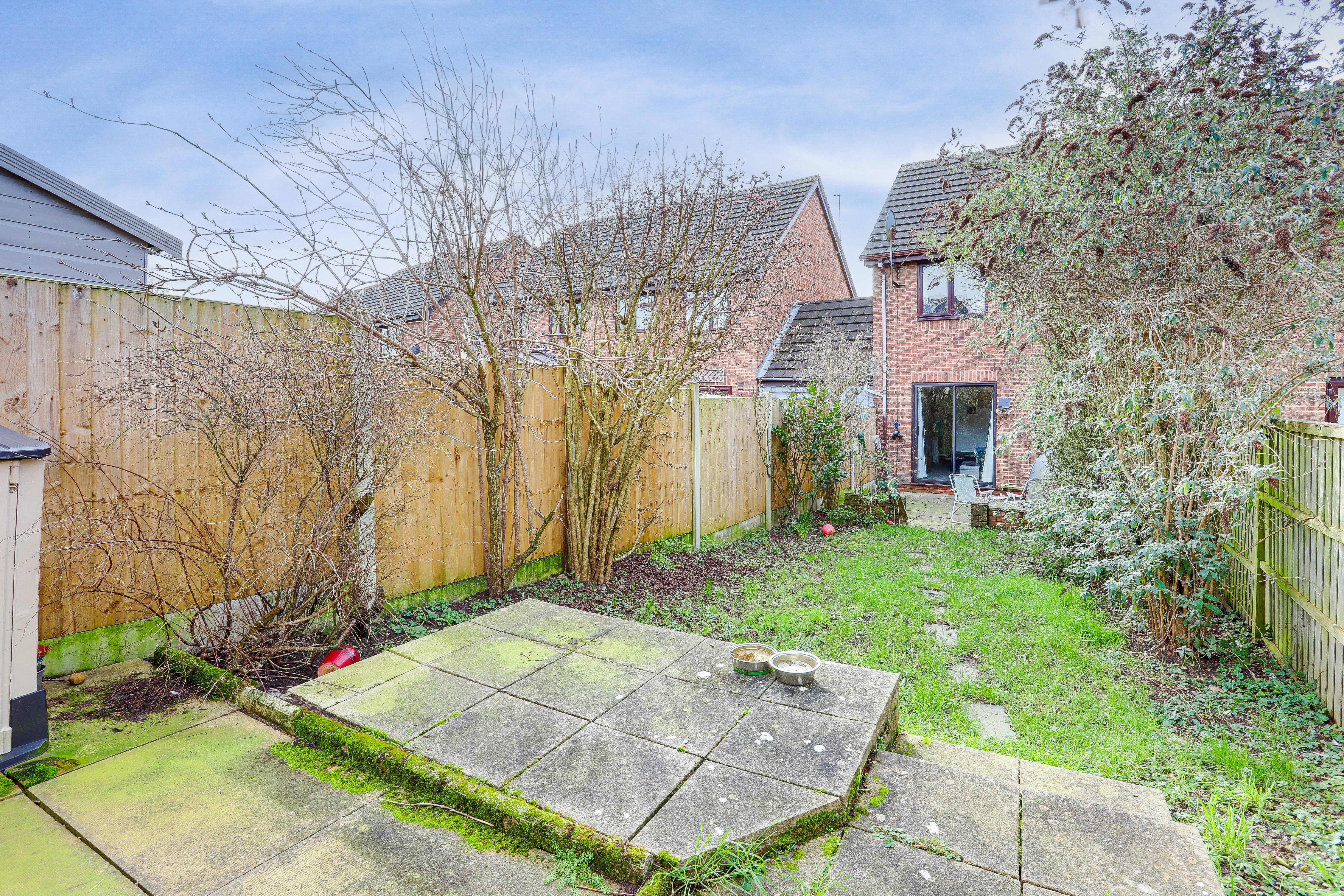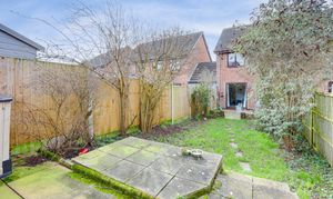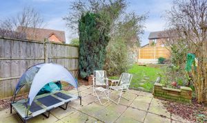 To the rear of the property is an enclosed garden with a paved patio area, a lawn, a range of plants and shrubs and fence panel boundaries.