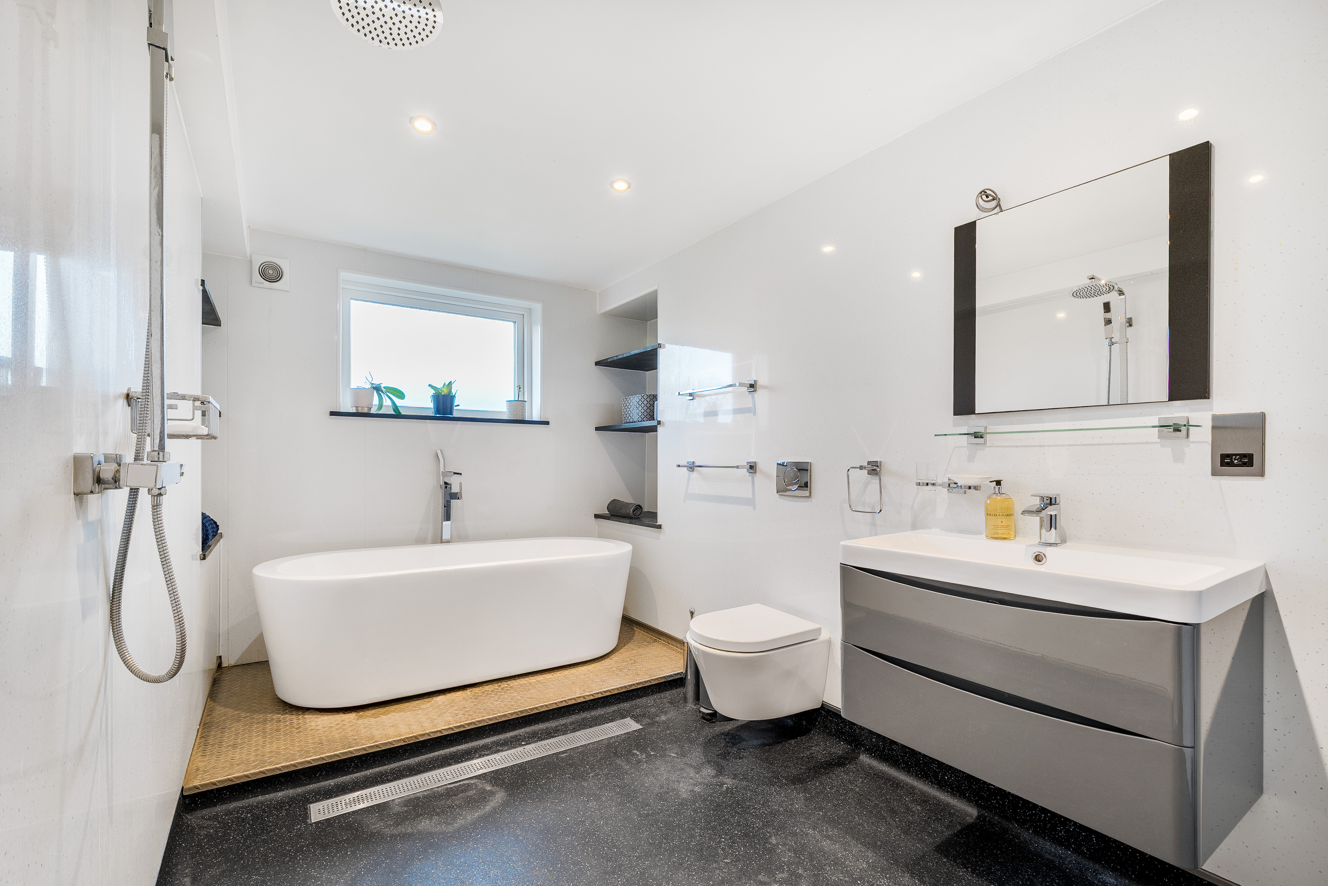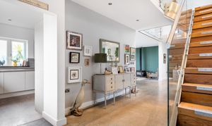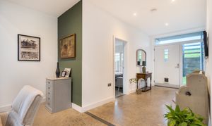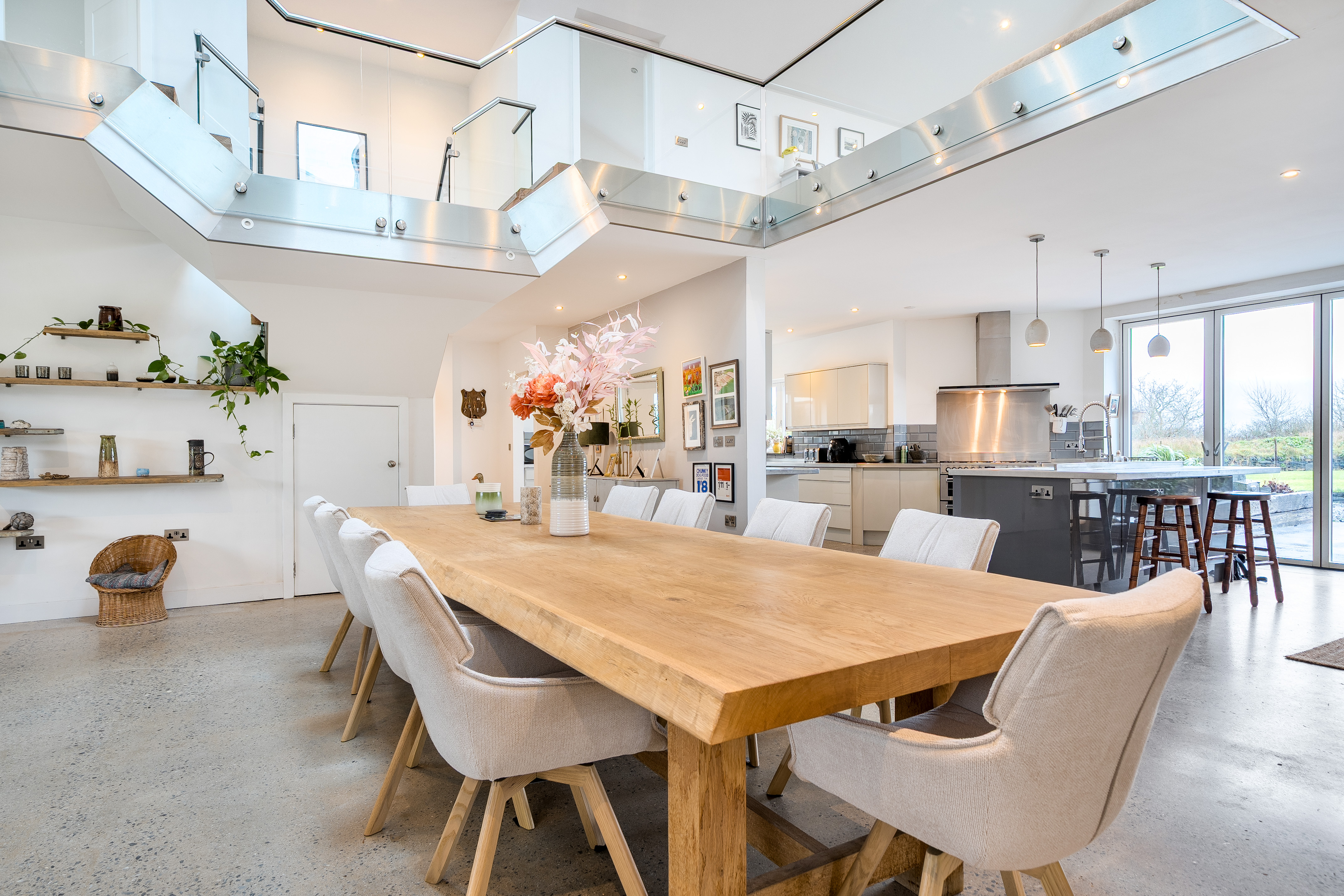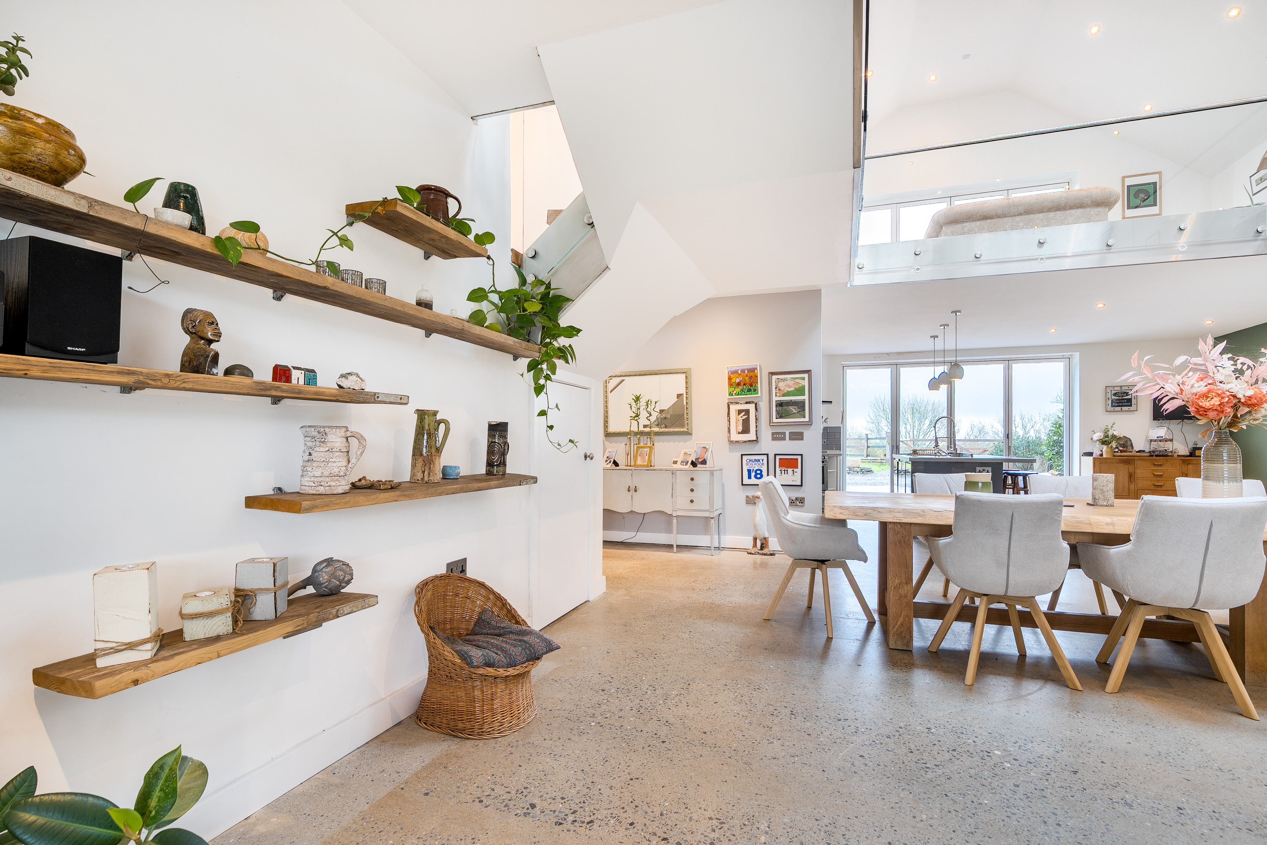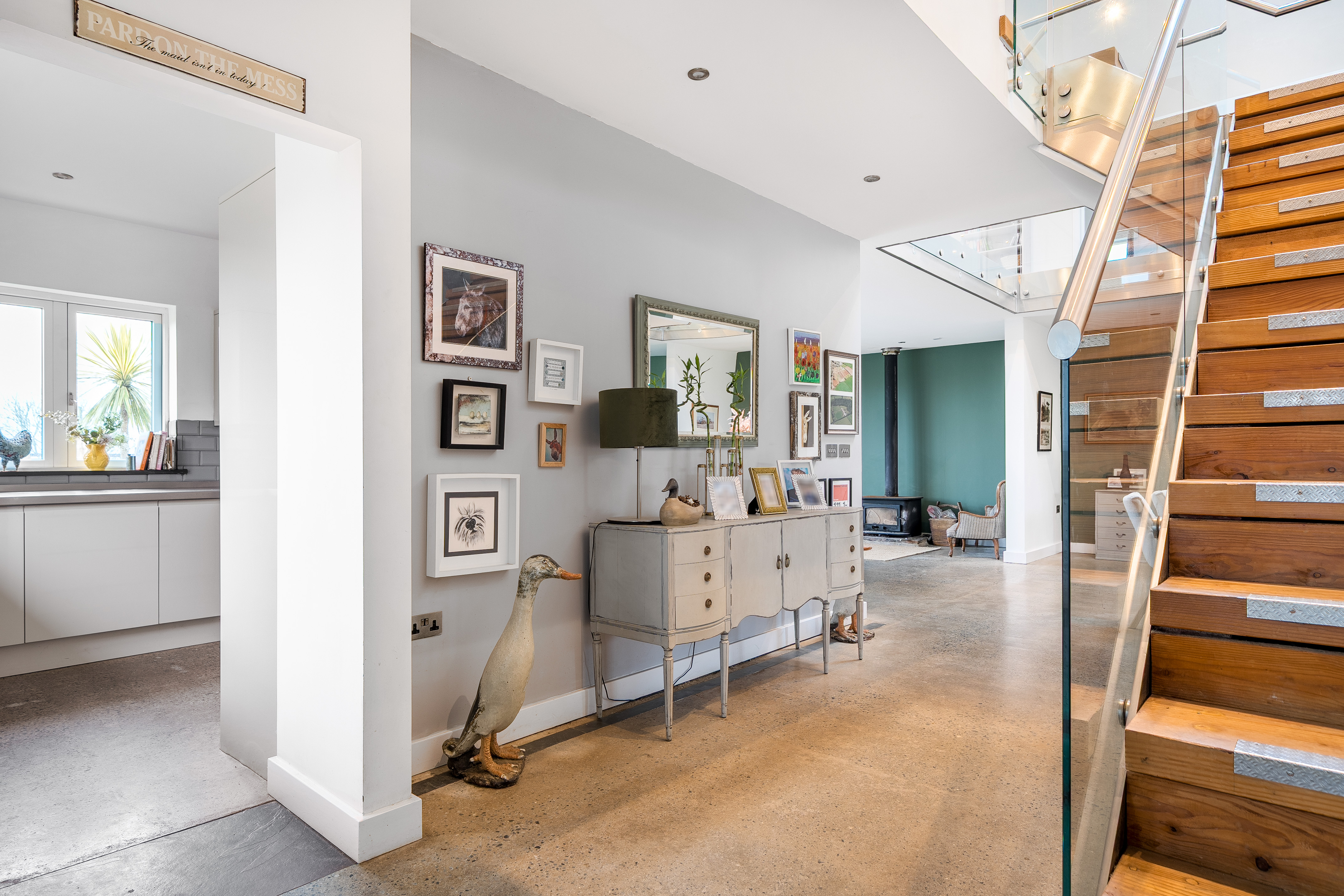 The approach to the house is via a practical storm porch, providing an ideal space to remove outdoor clothing and footwear before entering the main accommodation. This leads into a welcoming entrance hall, where a polished concrete floor, neutral palette and underfloor heating immediately establish the home’s contemporary yet understated aesthetic. A staircase rises to the first floor, splitting to serve both wings of the house and reinforcing the balance of the internal layout.