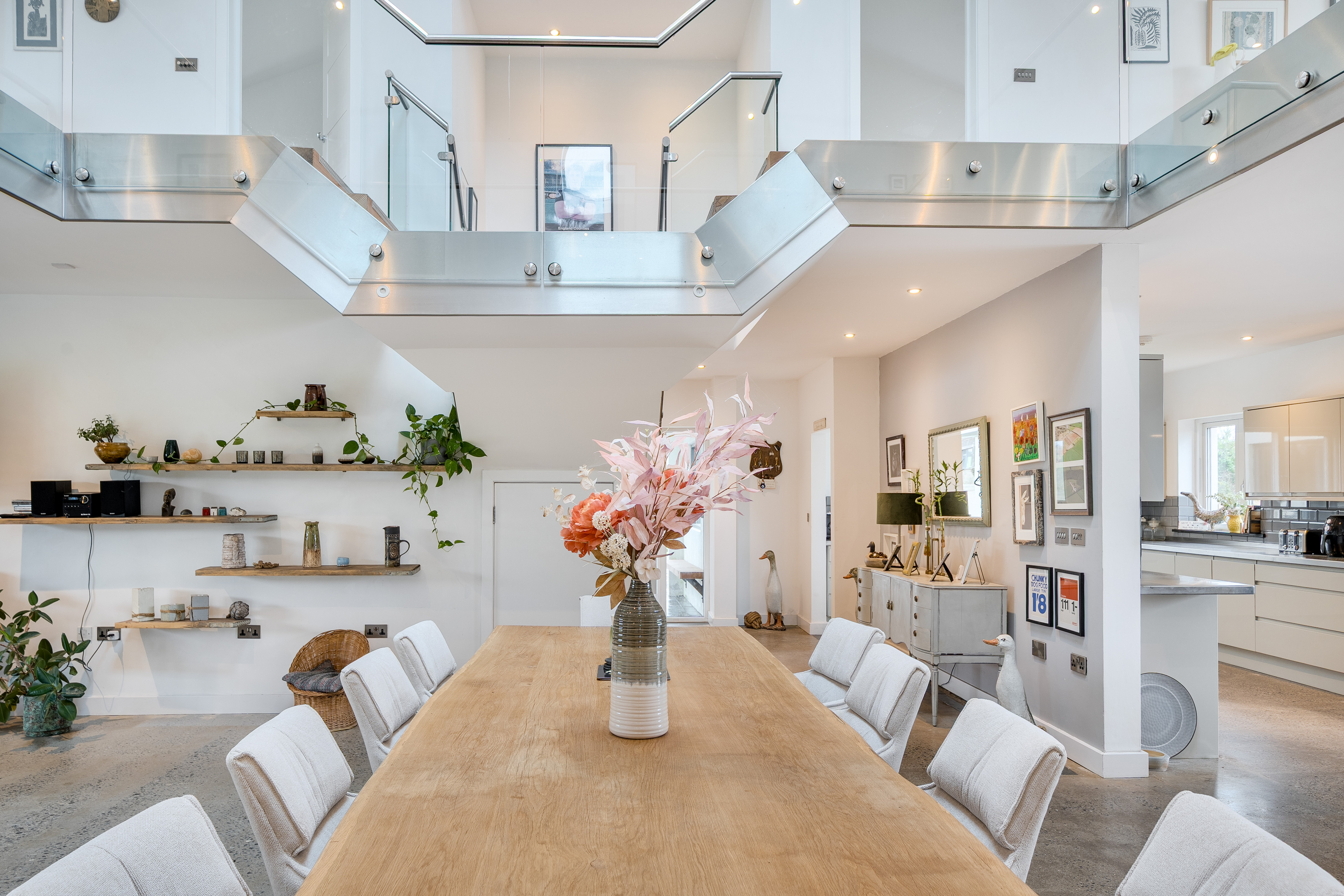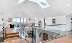 Upstairs, the first-floor landing has been conceived as two distinct reception-style seating areas, offering peaceful spaces to enjoy the views by day and atmospheric entertaining areas by evening. A vaulted ceiling with feature spot lighting accentuates the sense of volume, while glazed openings provide access to a terrace with glass and steel balustrading on one side—linking to a bedroom and steps leading down to the garden—and a Juliet balcony on the other.