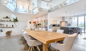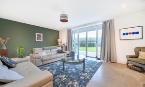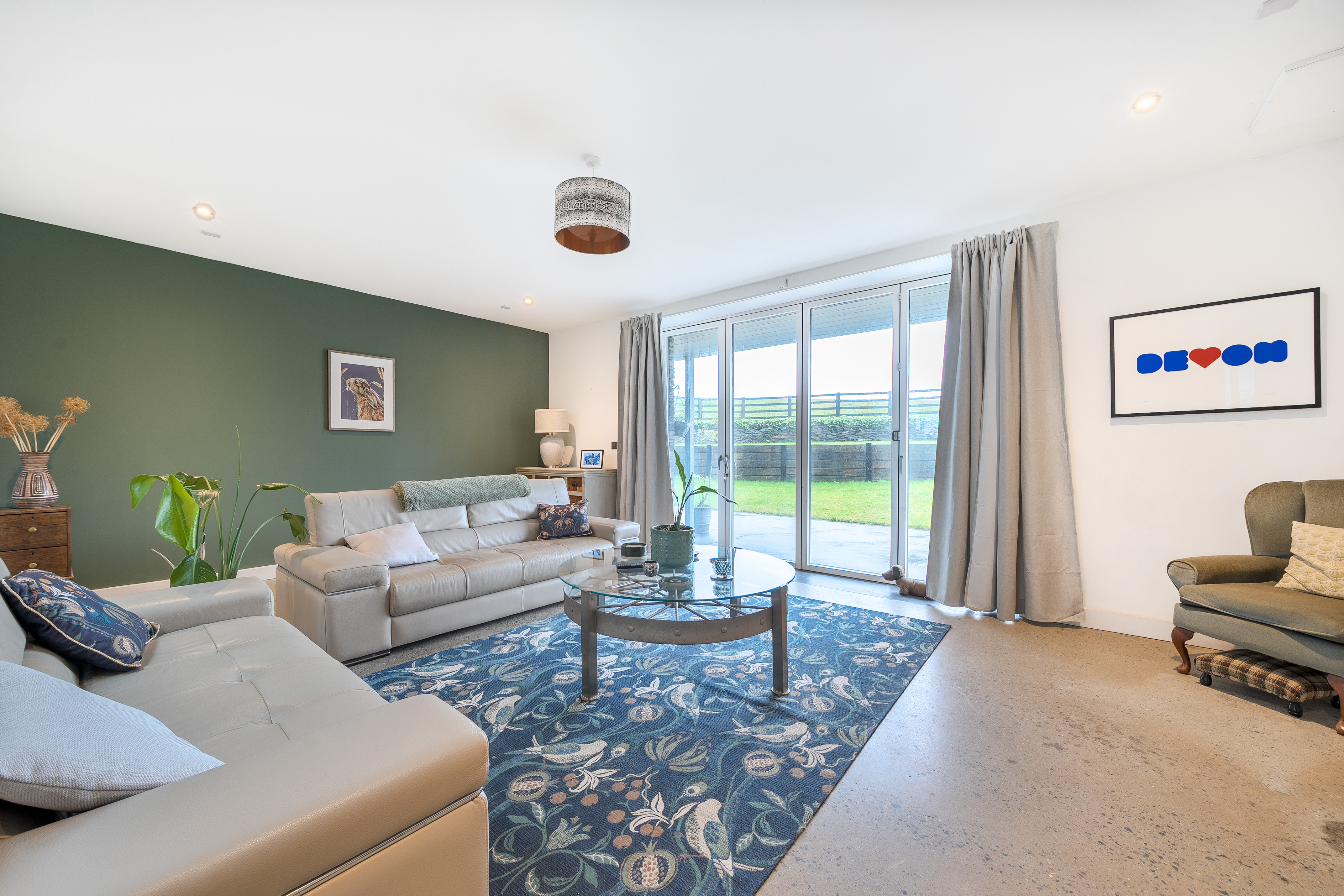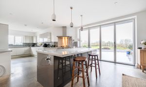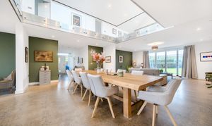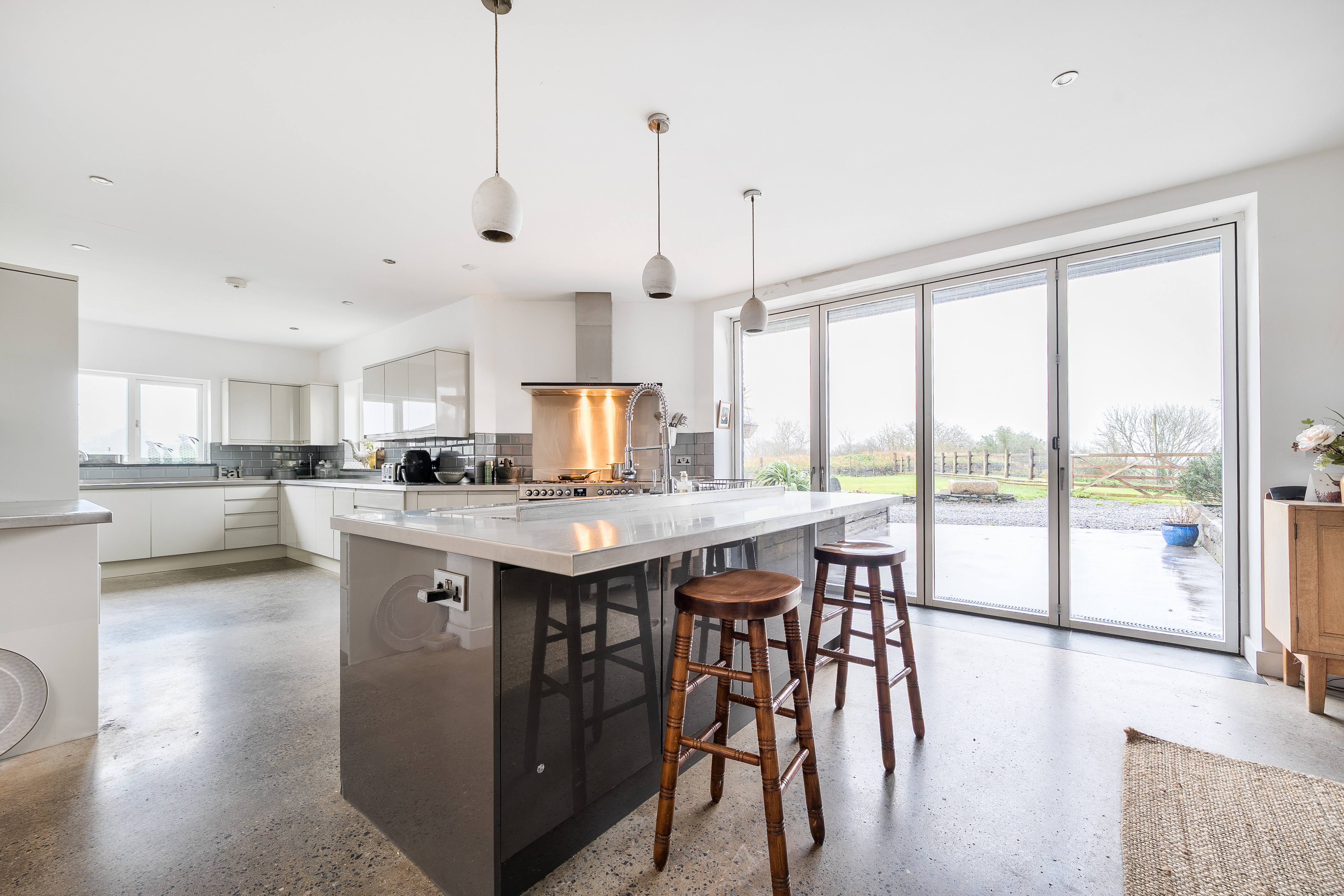 The heart of the home is an impressive open-plan kitchen, living and dining space, designed to offer flexibility and scale. While currently open, the space could be easily divided to create more intimate areas if desired. The principal living and dining area is a true statement room, featuring floor-to-ceiling tri-fold doors opening directly onto the garden. From here, views are drawn along the terrace, across a gently sloping lawn and onward to open fields beyond, creating a strong visual connection to the surrounding landscape.