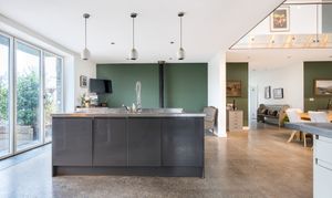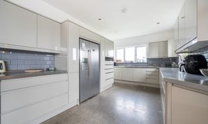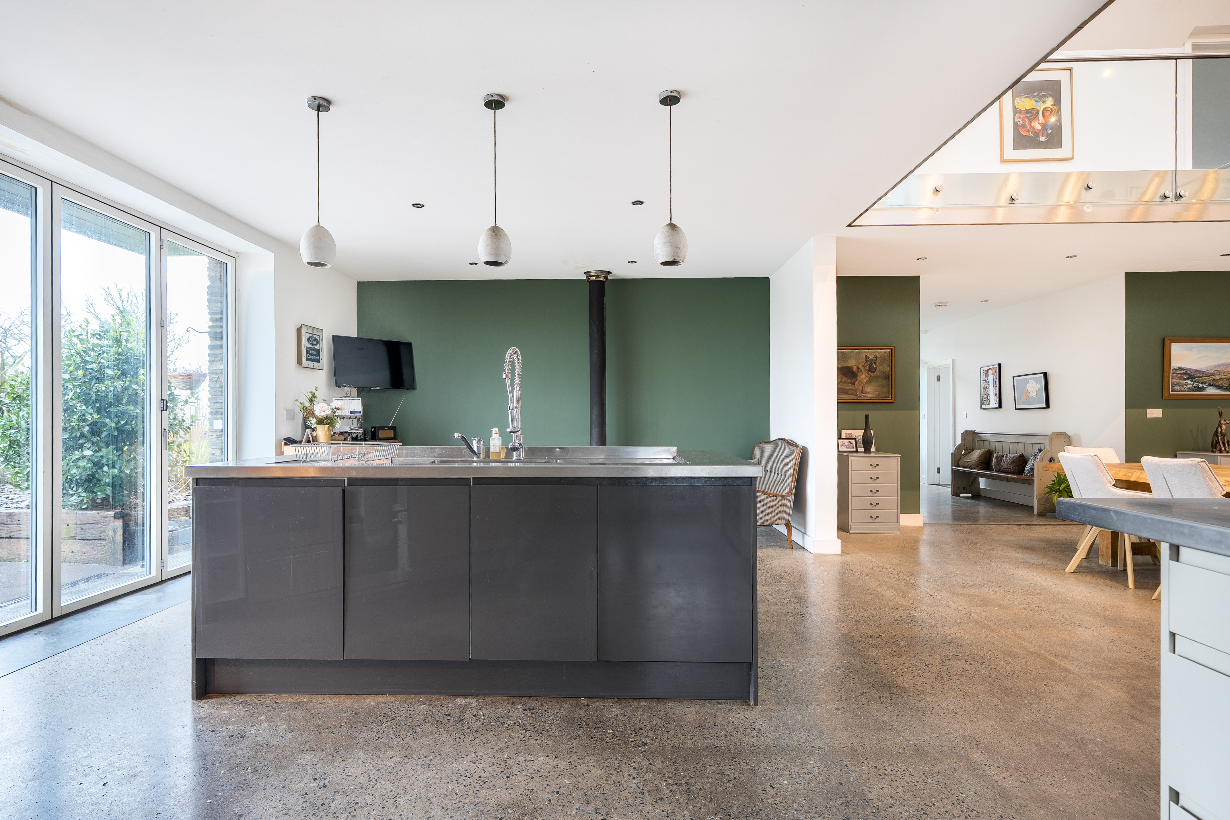 The kitchen has been designed by a chef, combining form and function in equal measure. A large central island incorporates a deep stainless-steel sink, dishwasher and informal bar seating, complemented by extensive work surfaces that make the space particularly well suited to entertaining or family living. Further features include a Belling range cooker, additional sink, space for a large fridge/freezer, and another bi-fold door opening onto the front garden, enhancing the flow between indoor and outdoor spaces.