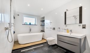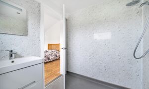 The first floor accommodates four well-proportioned double bedrooms. One benefits from an en-suite wet room, while two enjoy Juliet balconies with far-reaching, open countryside views. The remaining bedrooms are served by a Jack and Jill bathroom, appointed with a freestanding bath and waterfall tap, completing the accommodation with a sense of quiet luxury.