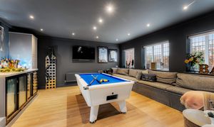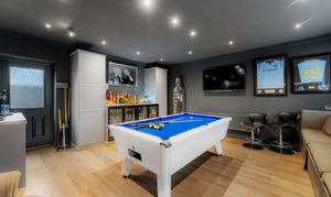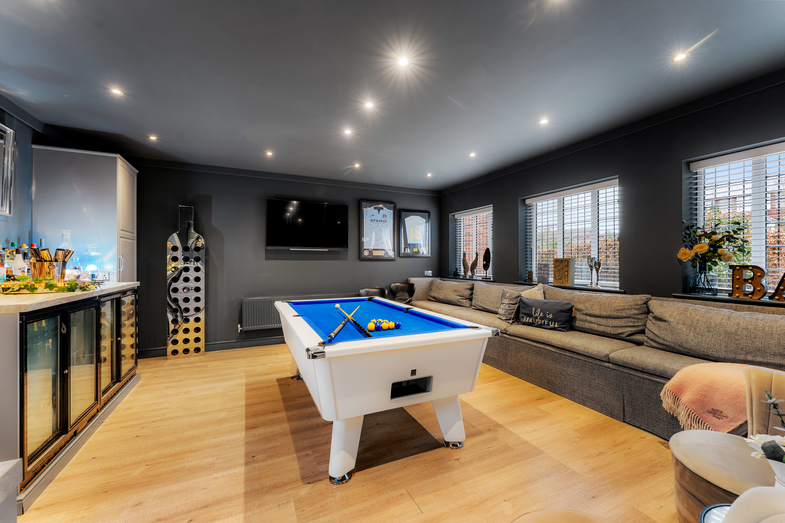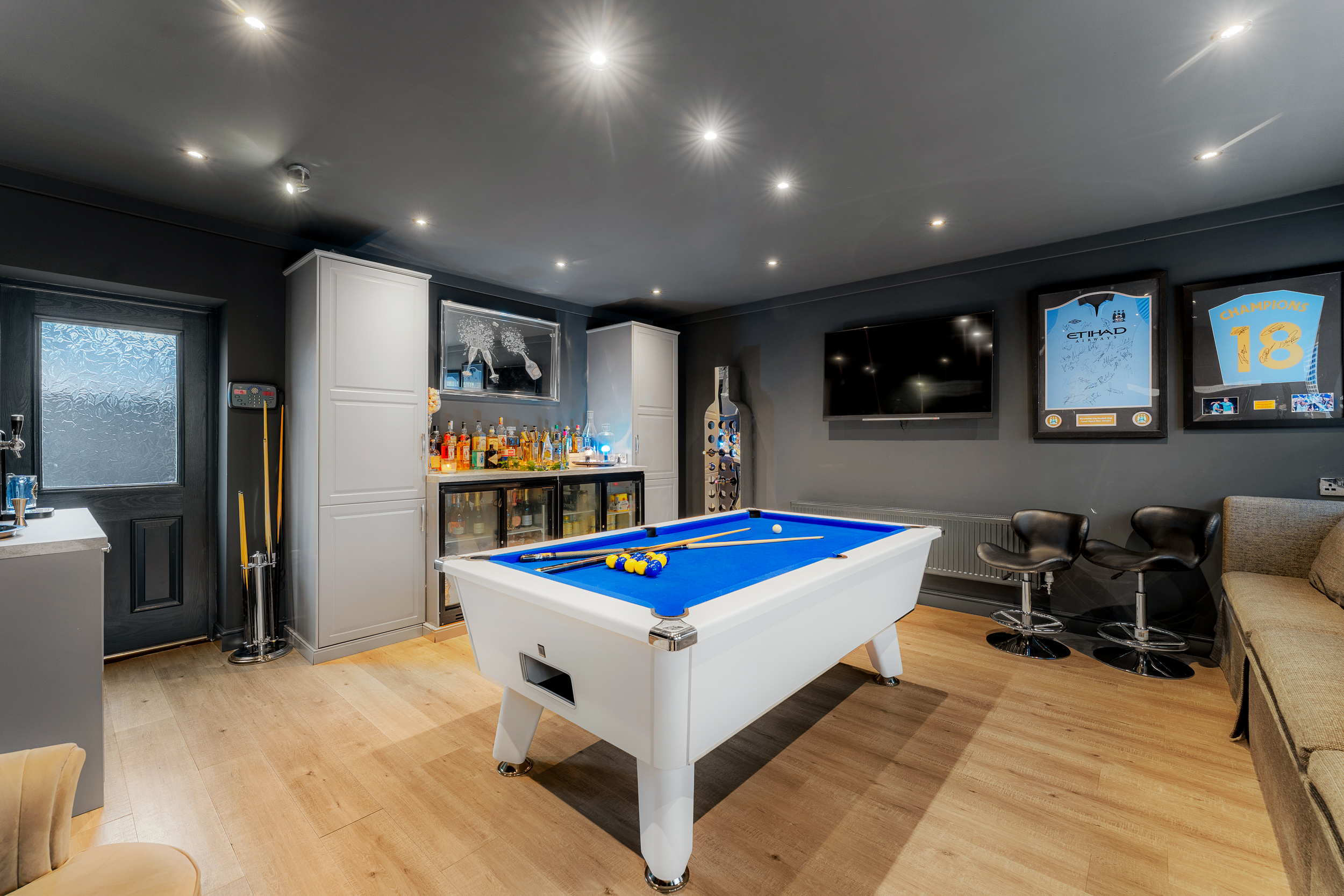 This space also doubles as a discreet route through to Birch Hill’s standout feature: a bar and games room, cleverly converted from the original garage. Designed with sociable living in mind, this modern room offers a place for music, parties and, as children grow, a space of their own to enjoy with friends; easily closed off when needed, so the rest of the home remains clean, calm and clutter free. Recessed LED strips trace the ceiling’s edges, paired with spotlighting to create a warm, atmospheric finish.