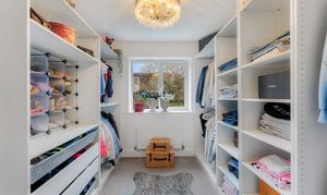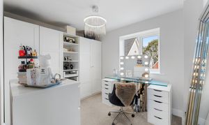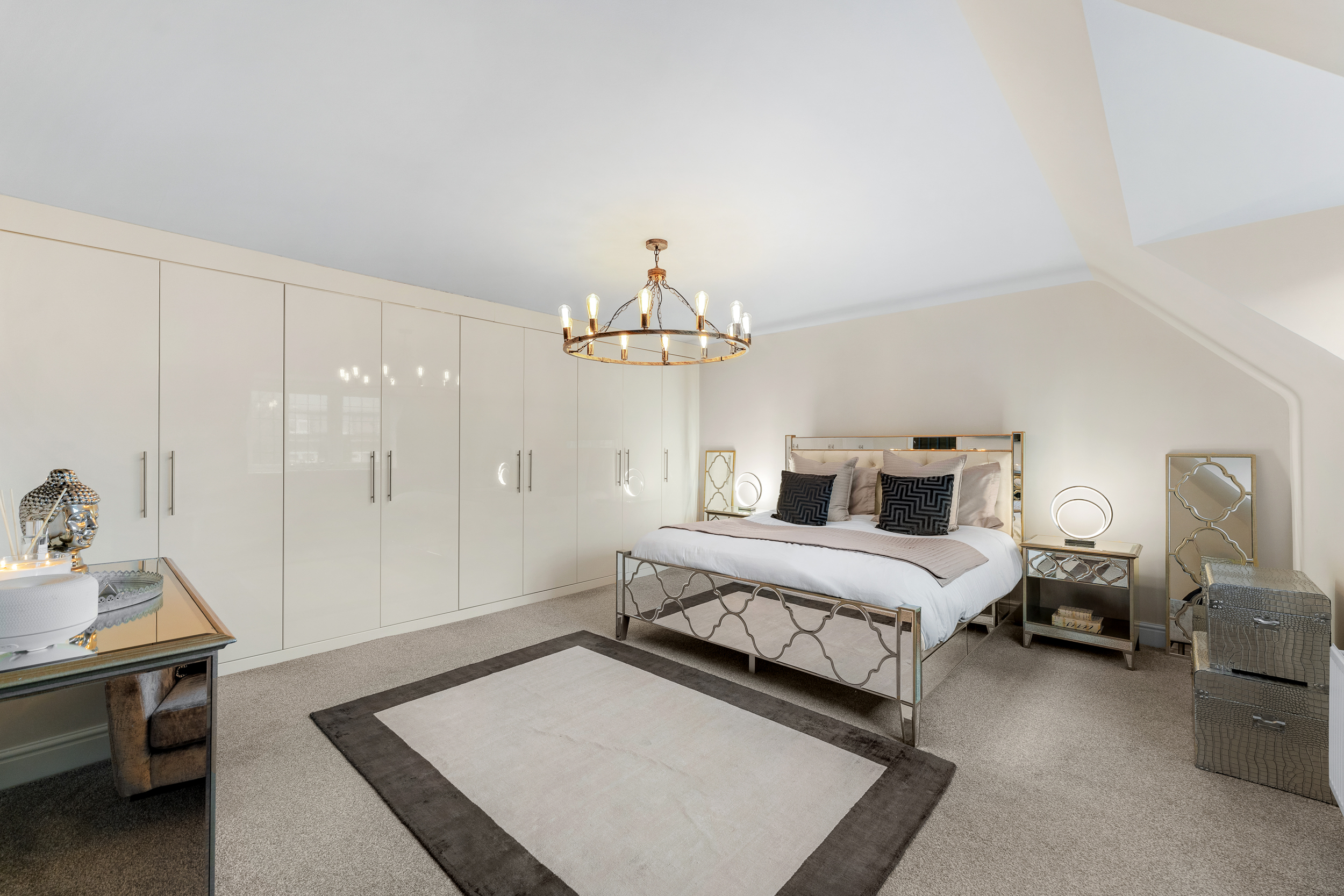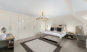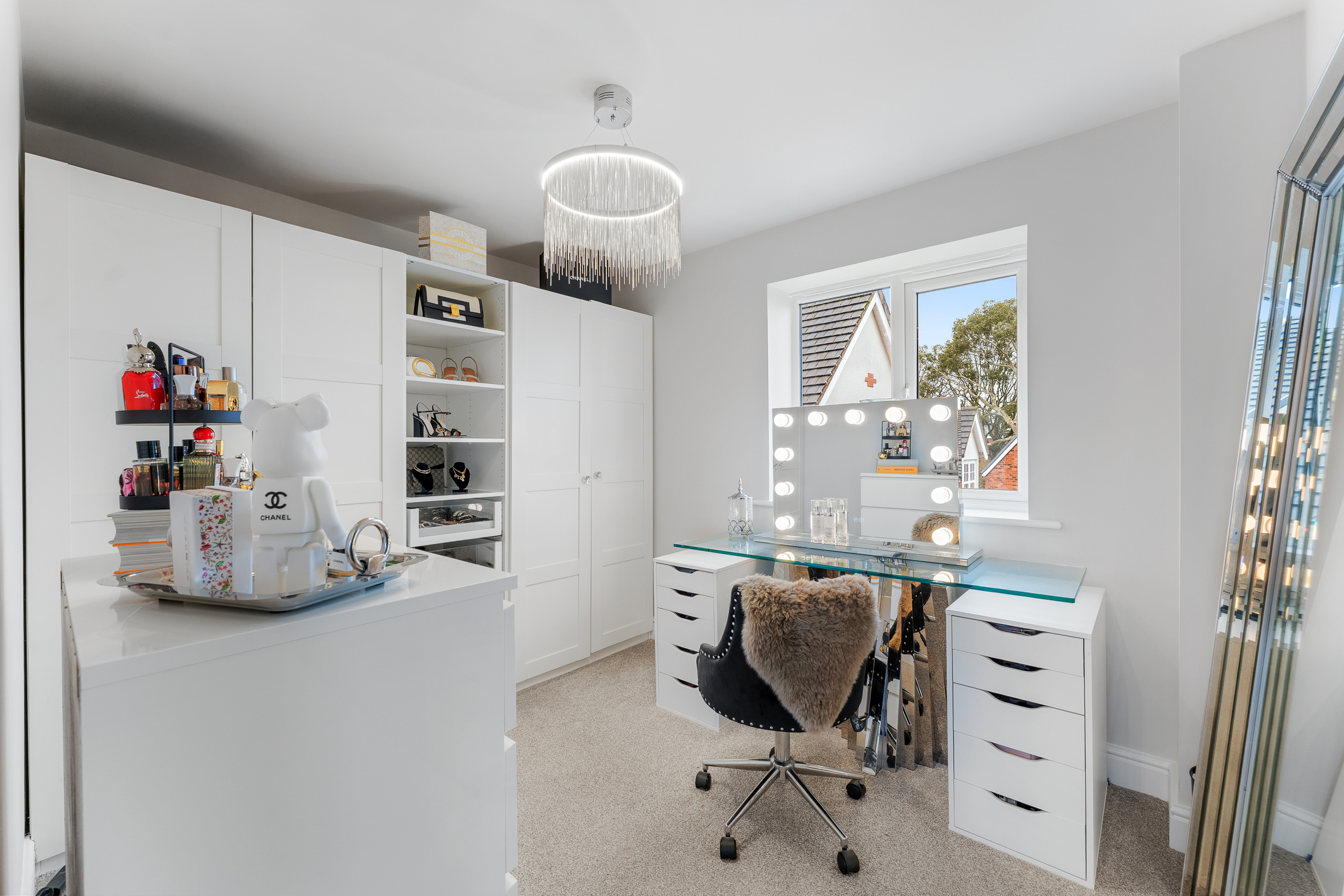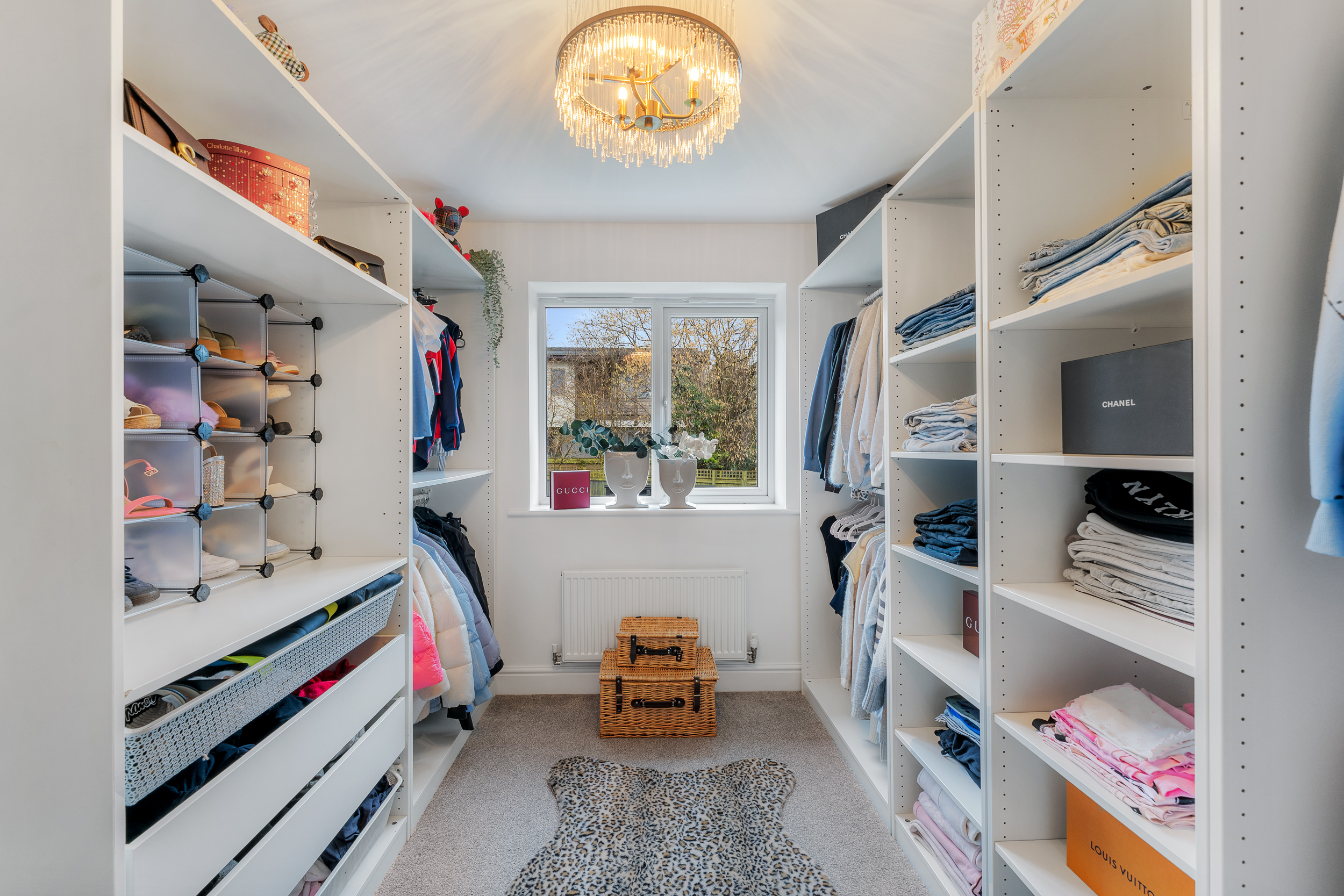 Returning to the landing, continue around to arrive at a bedroom that previously accommodated a super king size bed, now serving as a fully furnished dressing room, flooded with light and highlighting the flexibility of this home to evolve as family life changes.