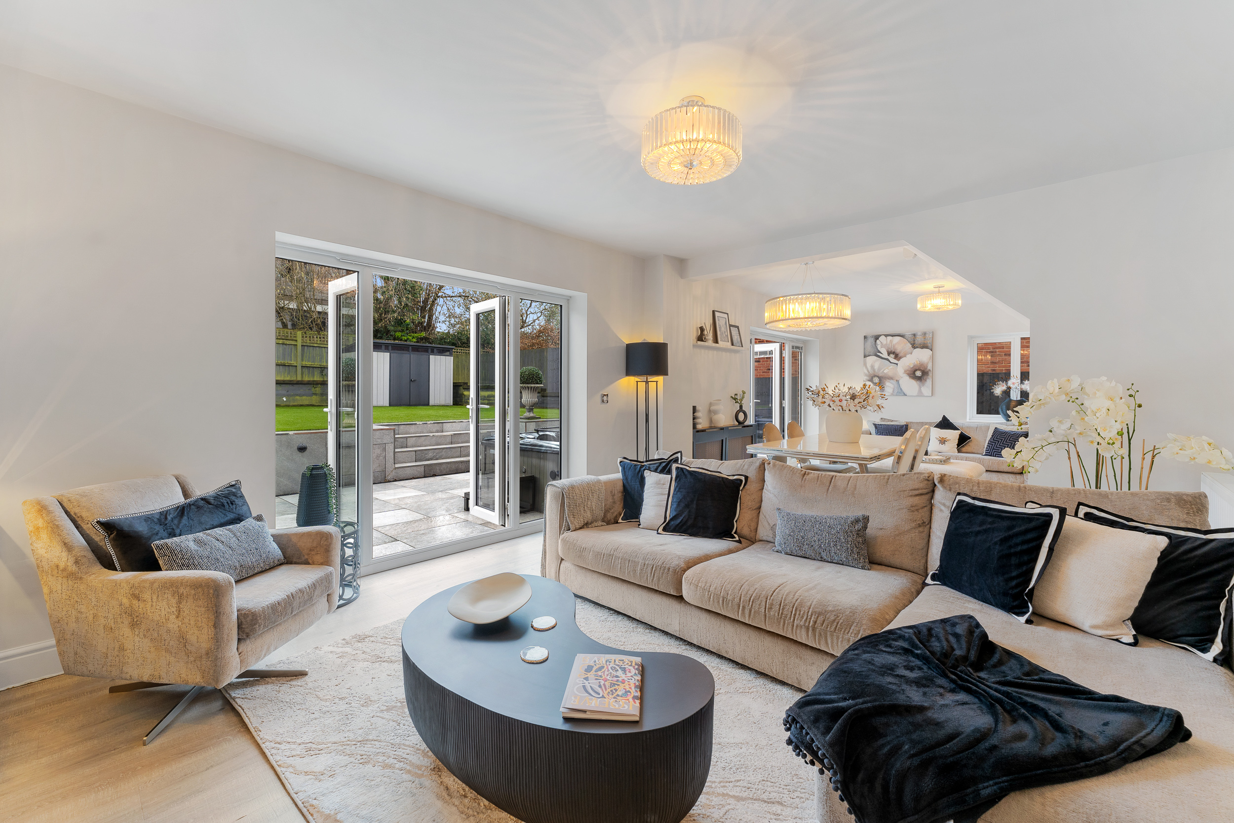 Doors open to the sunny garden from both the lounge area and the snug of the main kitchen, while a large dining area bridges both spaces in sociable style. A home designed around indoor-outdoor living, the broad patio terrace is ideal for entertaining, with tiered lawn above perfect for both children and pets.
