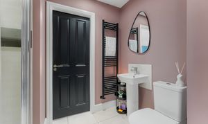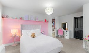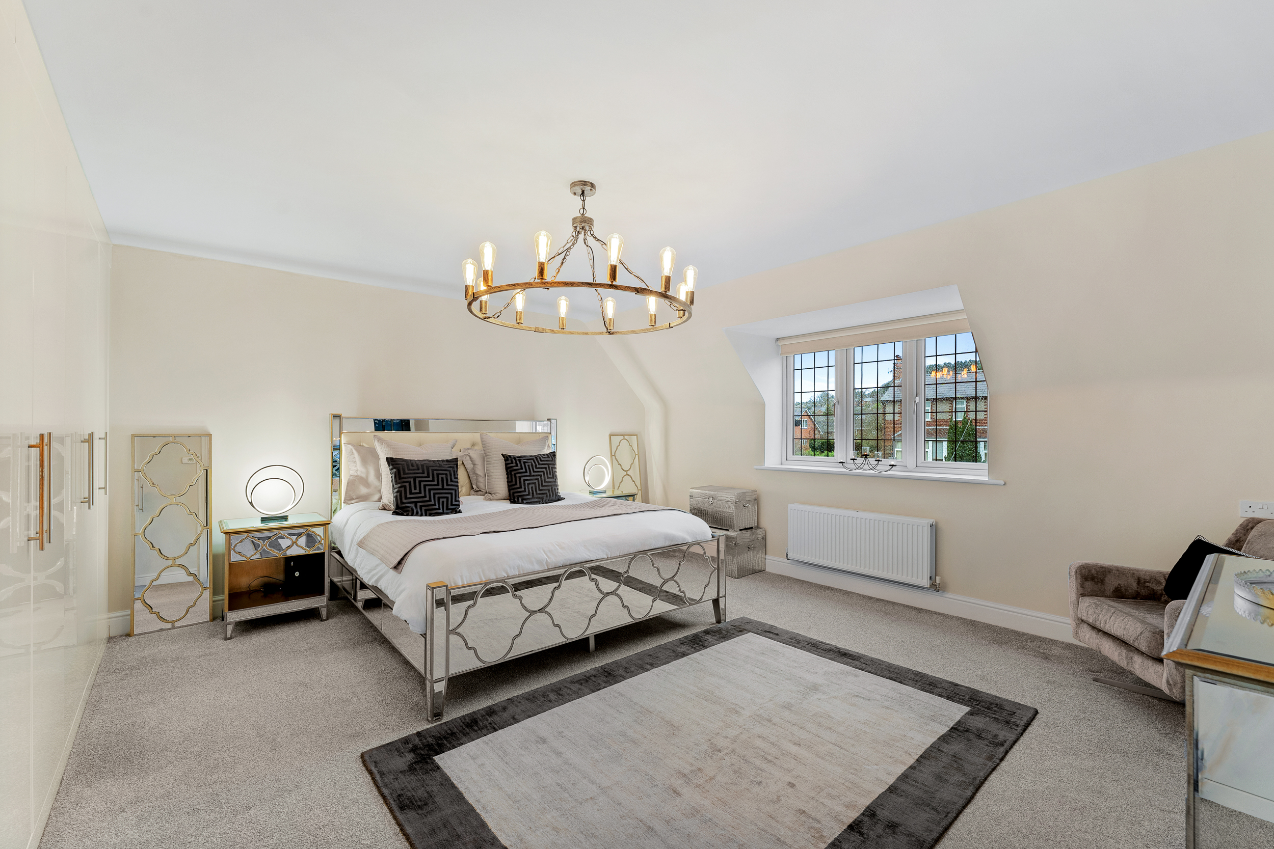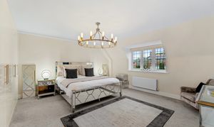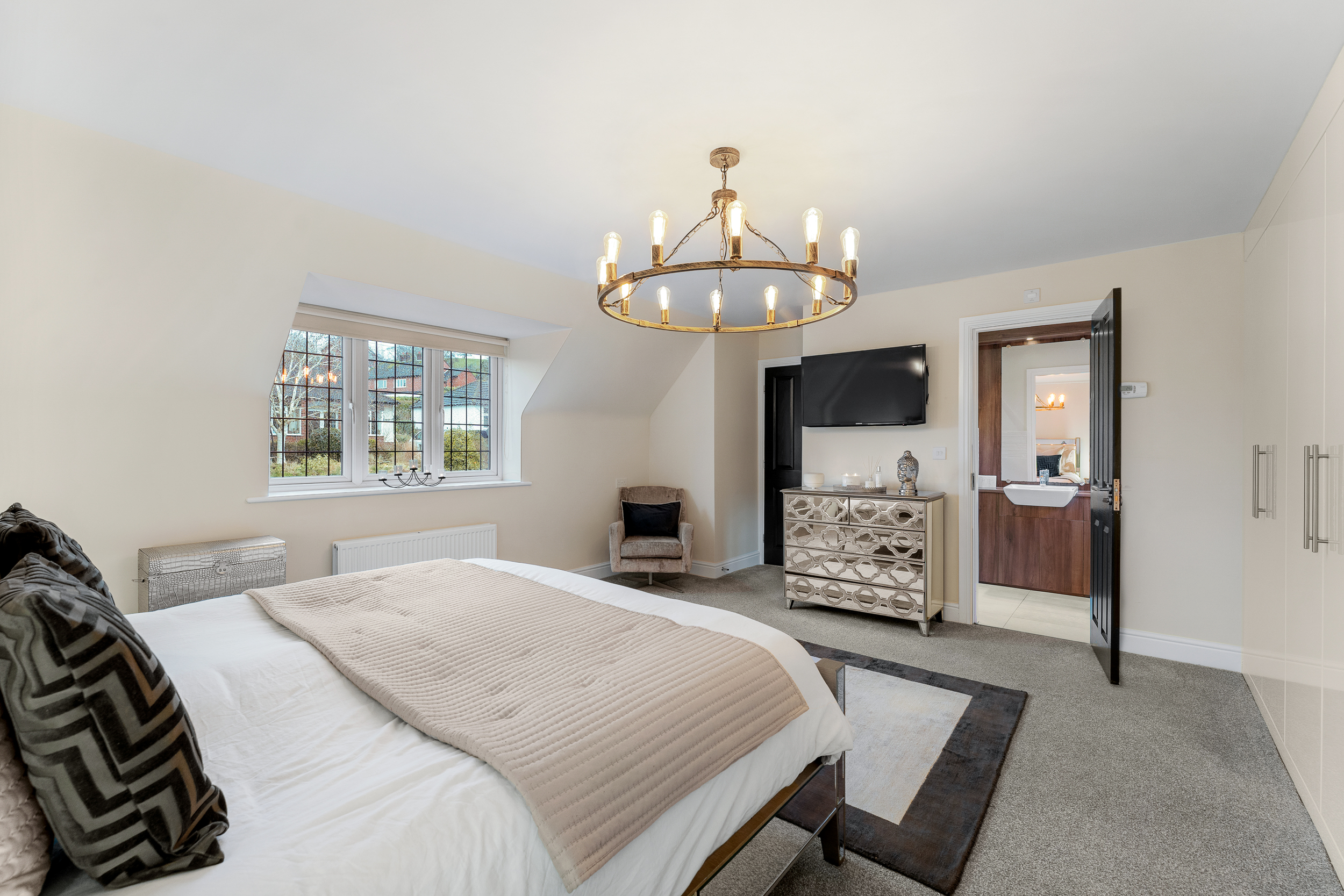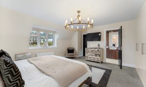 Seek sanctuary in the master suite, set further along the landing. A dressing room sits just before the principal bedroom, originally intended as a nursery and easily repurposed as an additional bedroom if needed. Two sets of doors create a natural sense of separation from the other bedrooms, with the nursery/dressing room set to one side and the bedroom itself spacious and light, set beneath a vaulted ceiling.