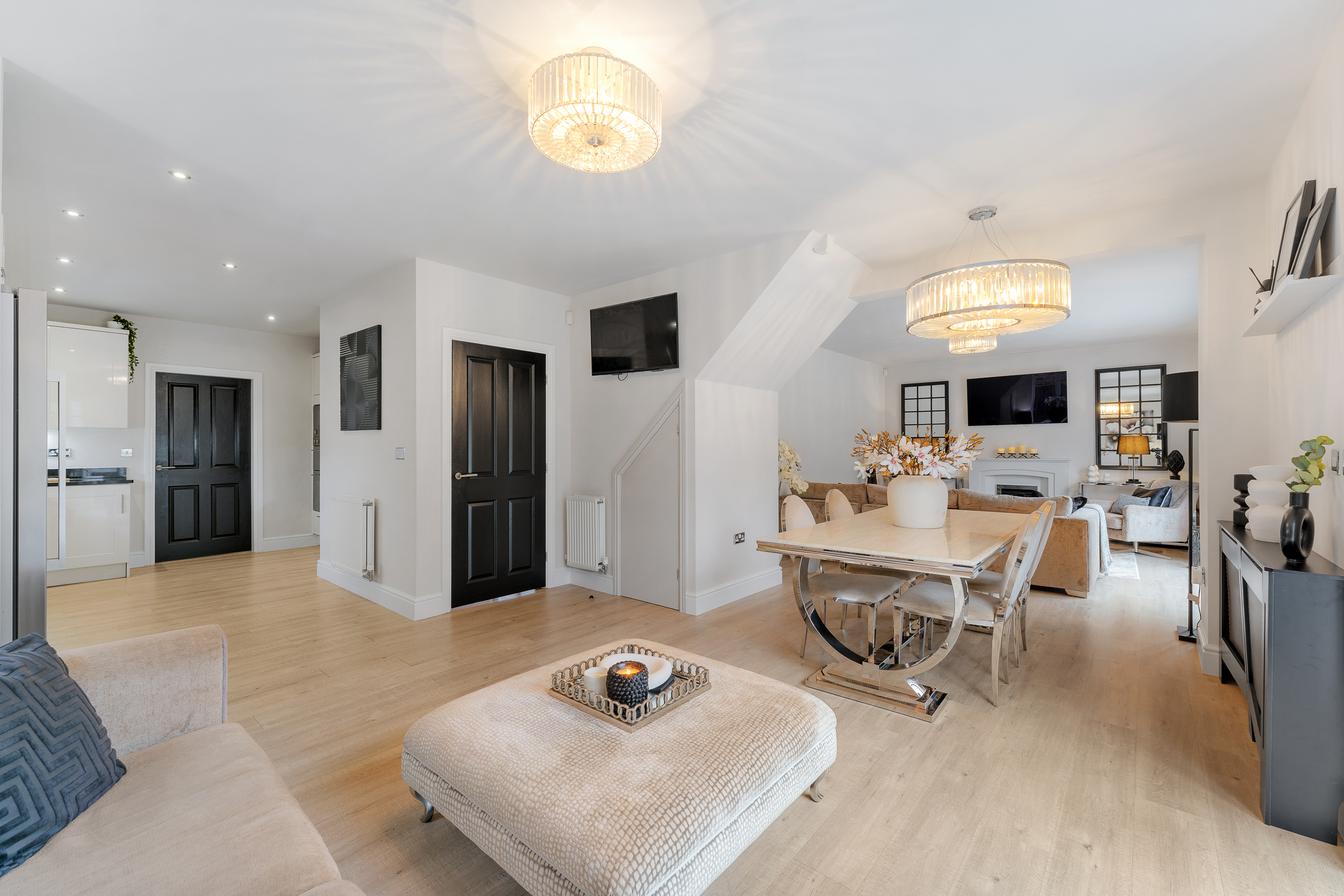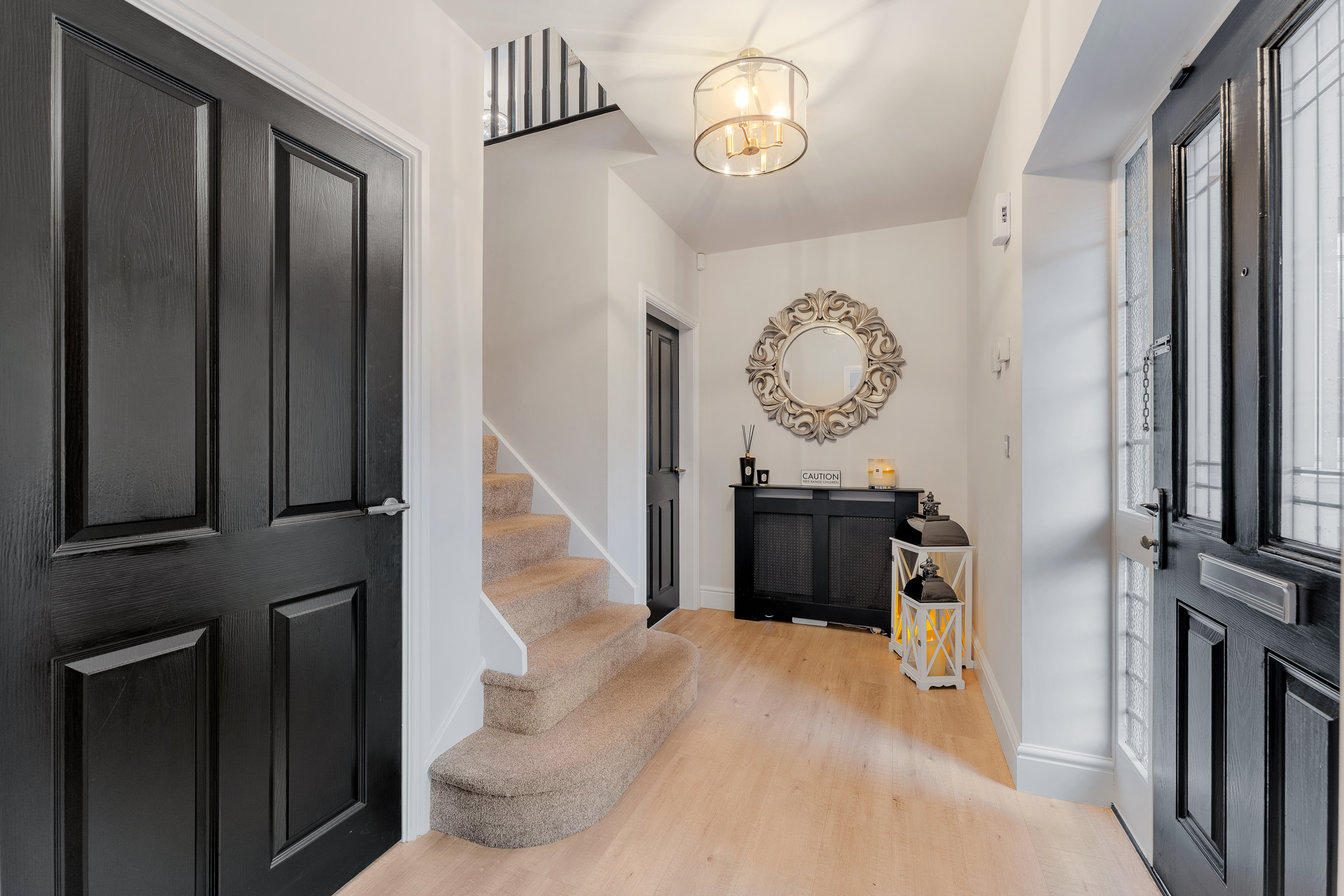Pull up to plenty of parking for three or four cars on the neatly paved driveway. From beneath the sheltered canopy open the front door and step through into the entrance hallway, where the sense of space and scale continues. Hardwearing Quickstep laminate flooring begins in the hallway, continuing throughout the ground floor rooms for a sense of flow and cohesion.