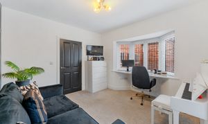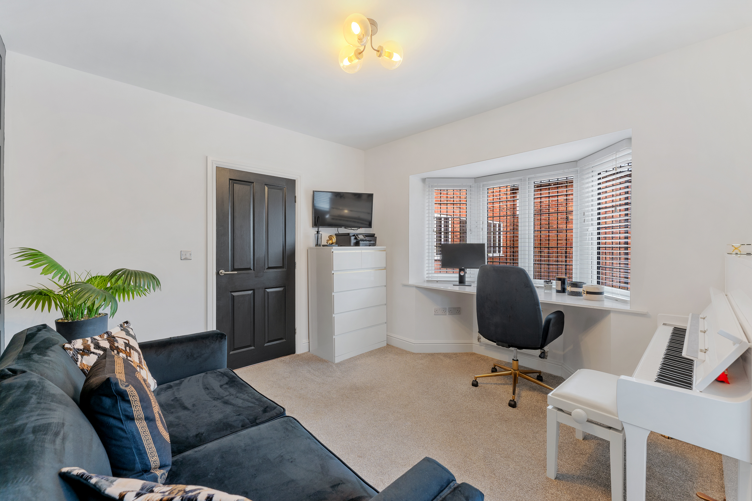 A home that has evolved in harmony with family living, versatility awaits around every corner; immediately felt in the warmth and welcome of the study on the left. Currently established as a home office, a quartz desk elegantly built into the bay window to the front opens up the space, creating plenty of room for a piano. With contemporary grey panelling to the feature wall and blind-fitted windows, this flexible room is ideal not merely as an office-come-music room but also potentially as a separate snug, playroom or even bedroom.