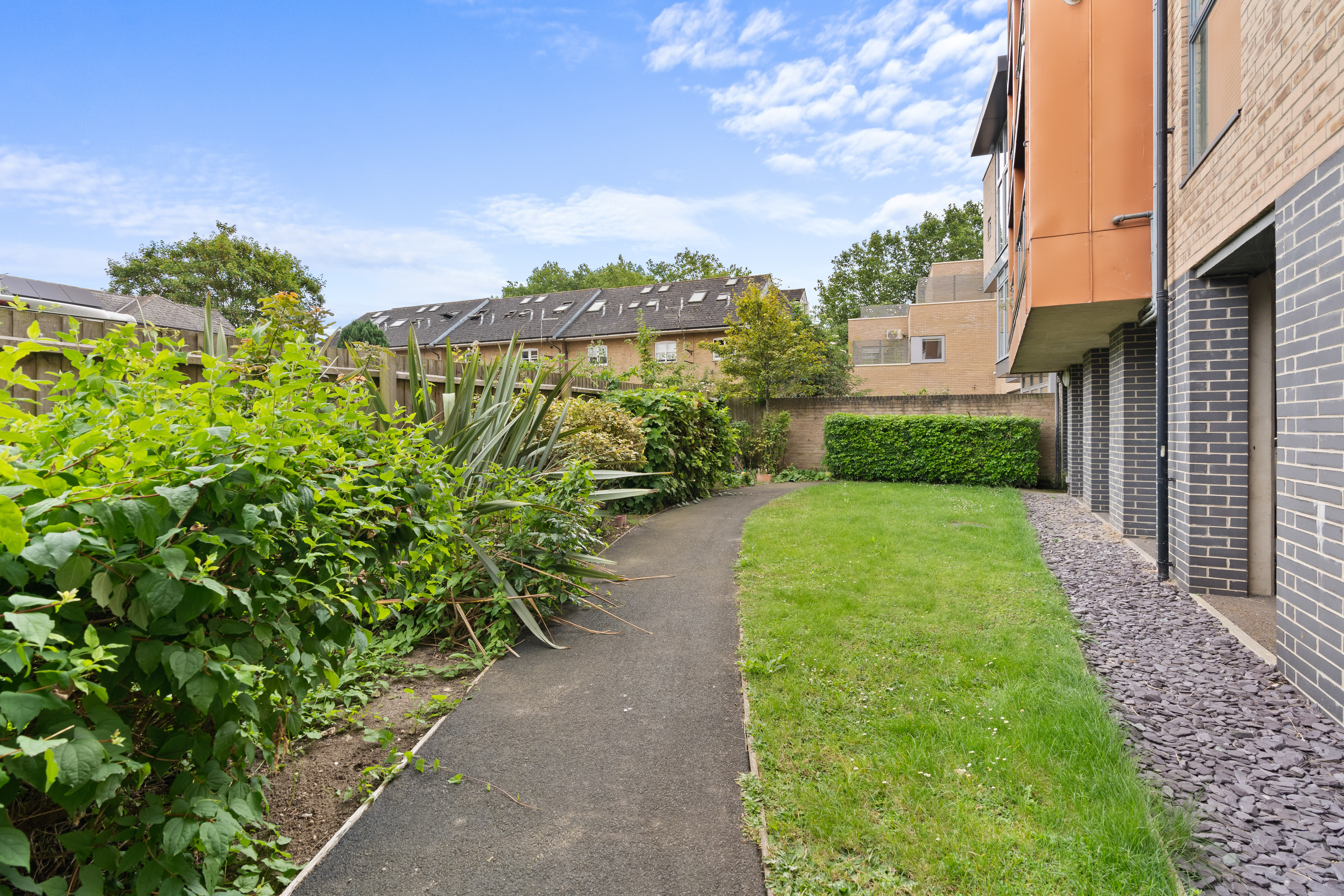 The small communal garden is laid to lawn with attractive herbaceous borders.