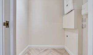 Both bedrooms are spacious and filled with natural light, offering a calm retreat from the lively city atmosphere. The stylish herringbone flooring adds a sophisticated touch, combining elegance with practicality.