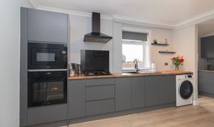 A designer kitchen is sure to impress, boasting integrated appliances and a rear door leading out to the extensive private garden, perfect for outdoor relaxation.