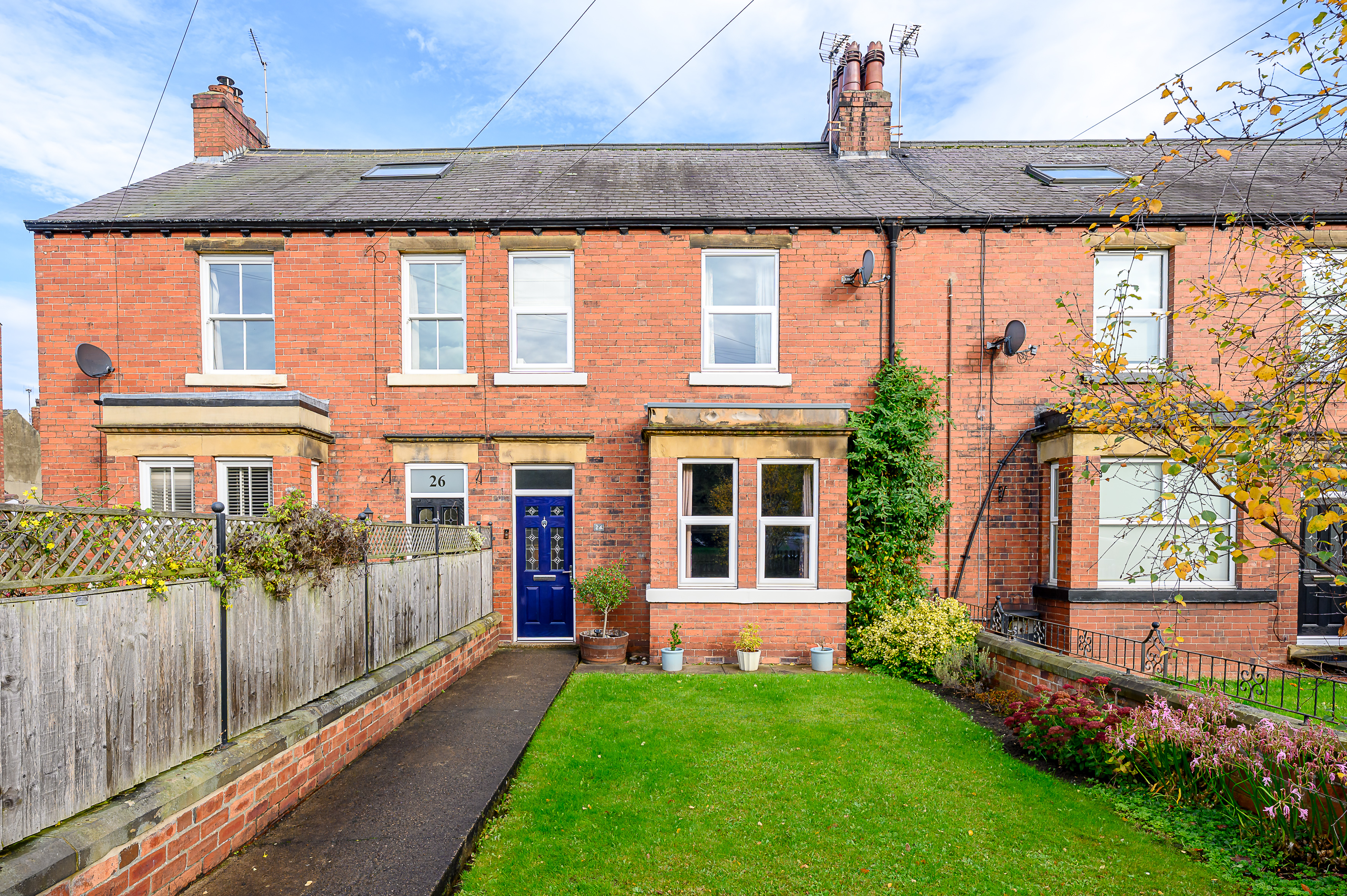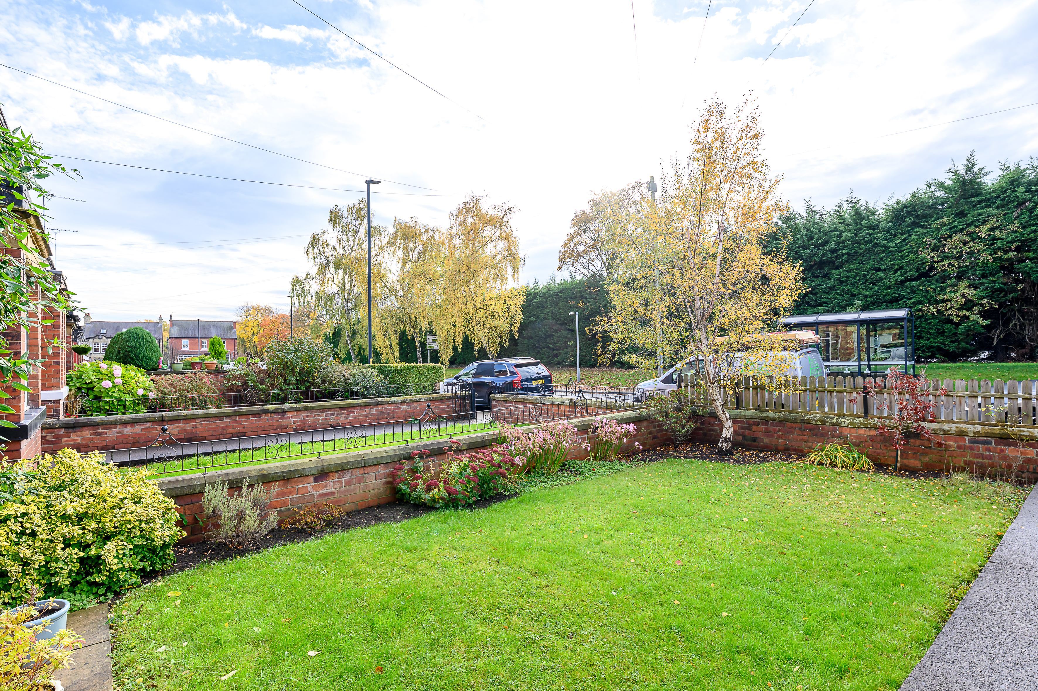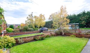 Set behind a low red brick wall, the property is approached through a wrought iron gate, opening onto a pathway running alongside a charming lawned front garden, creating an attractive first impression. A modern composite front door opens into the home.