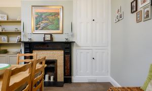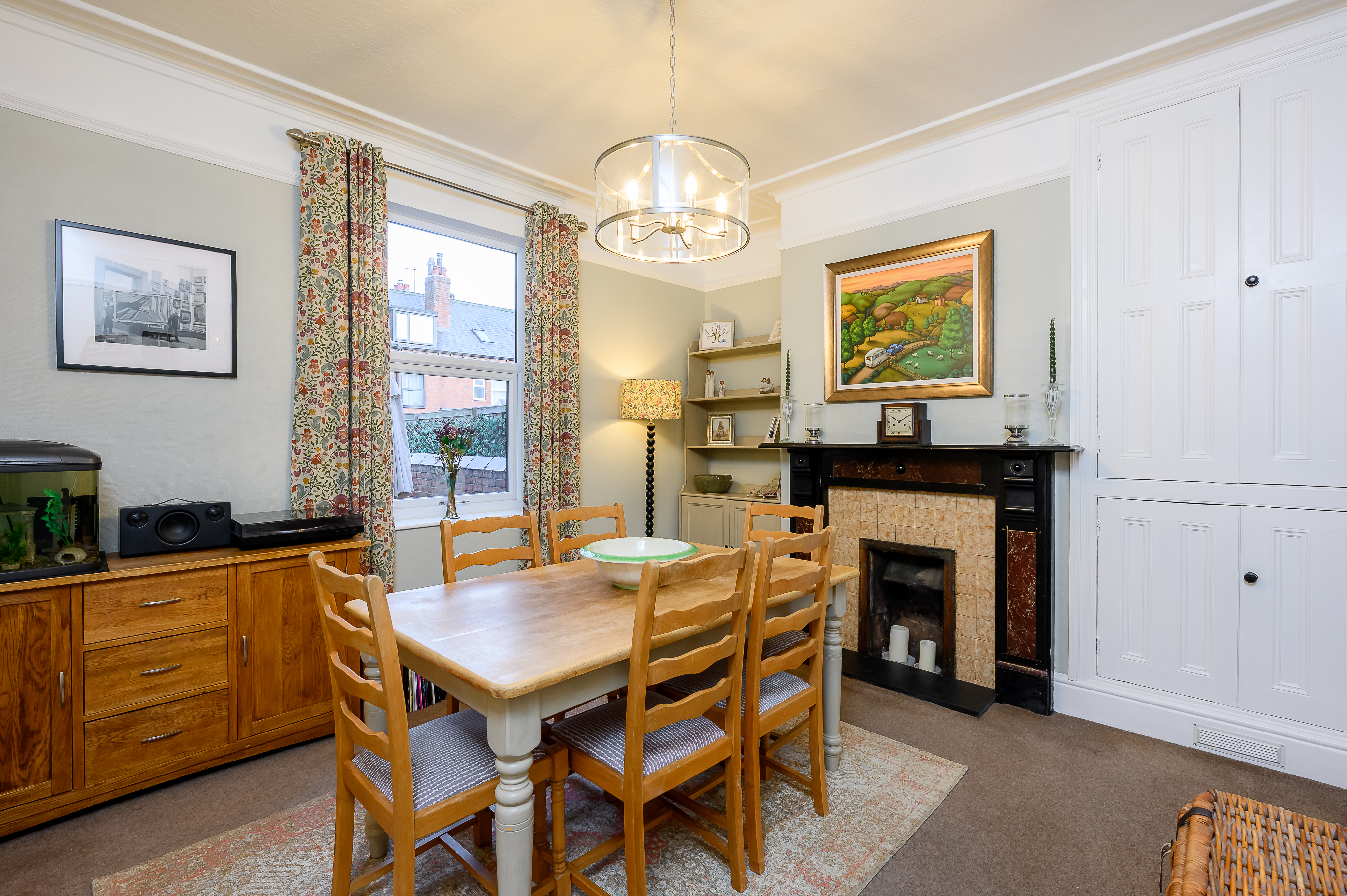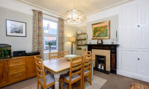 The dining room offers another generous reception area, complete with built-in shelved storage, an original fireplace with hearth, and a further alcove. A rear-facing window looks out onto the courtyard-style yard, making this an ideal entertaining or family dining space.