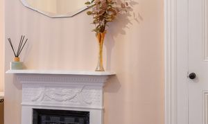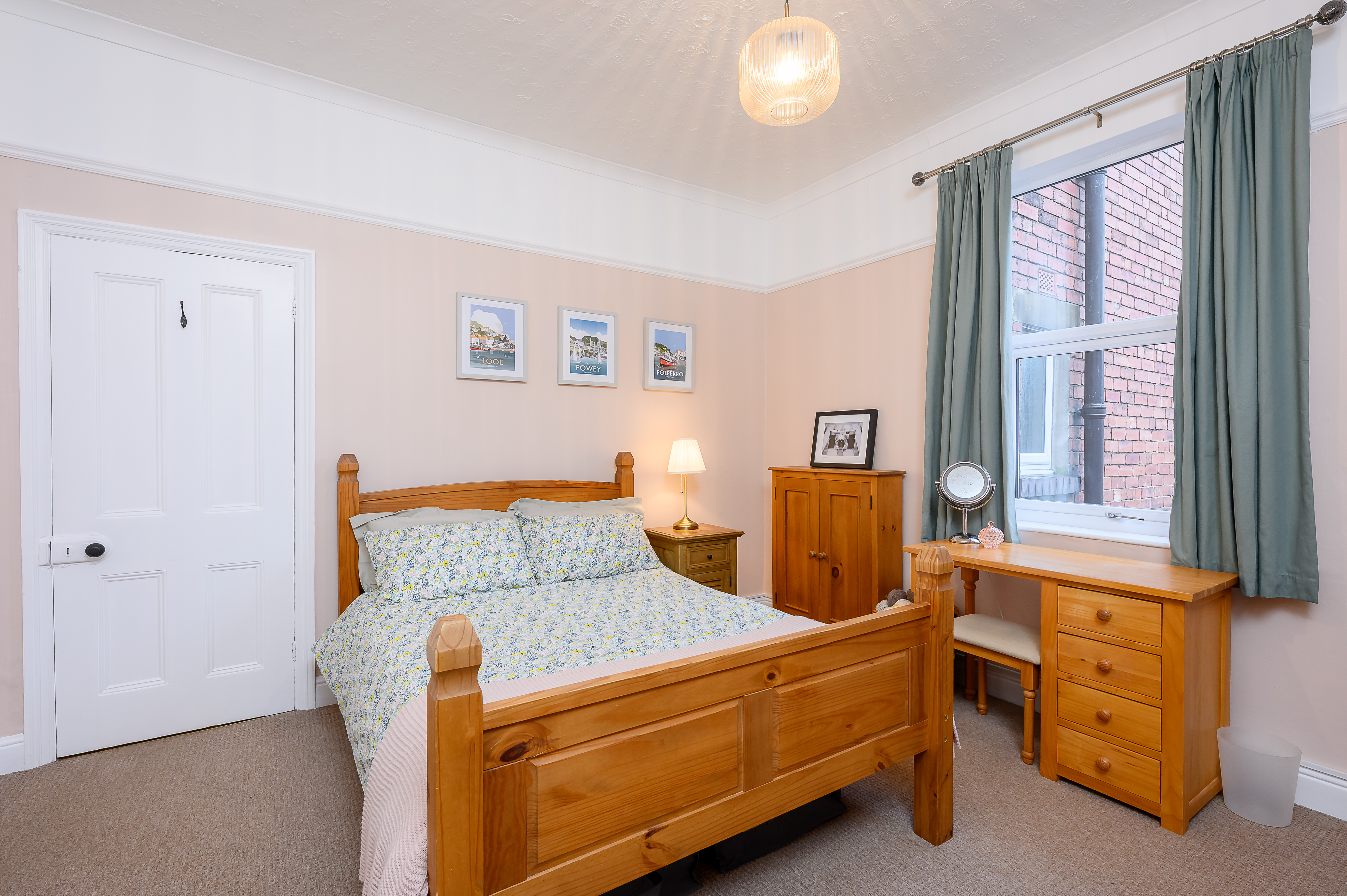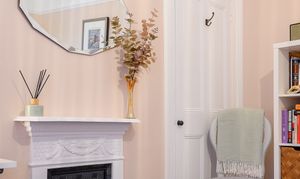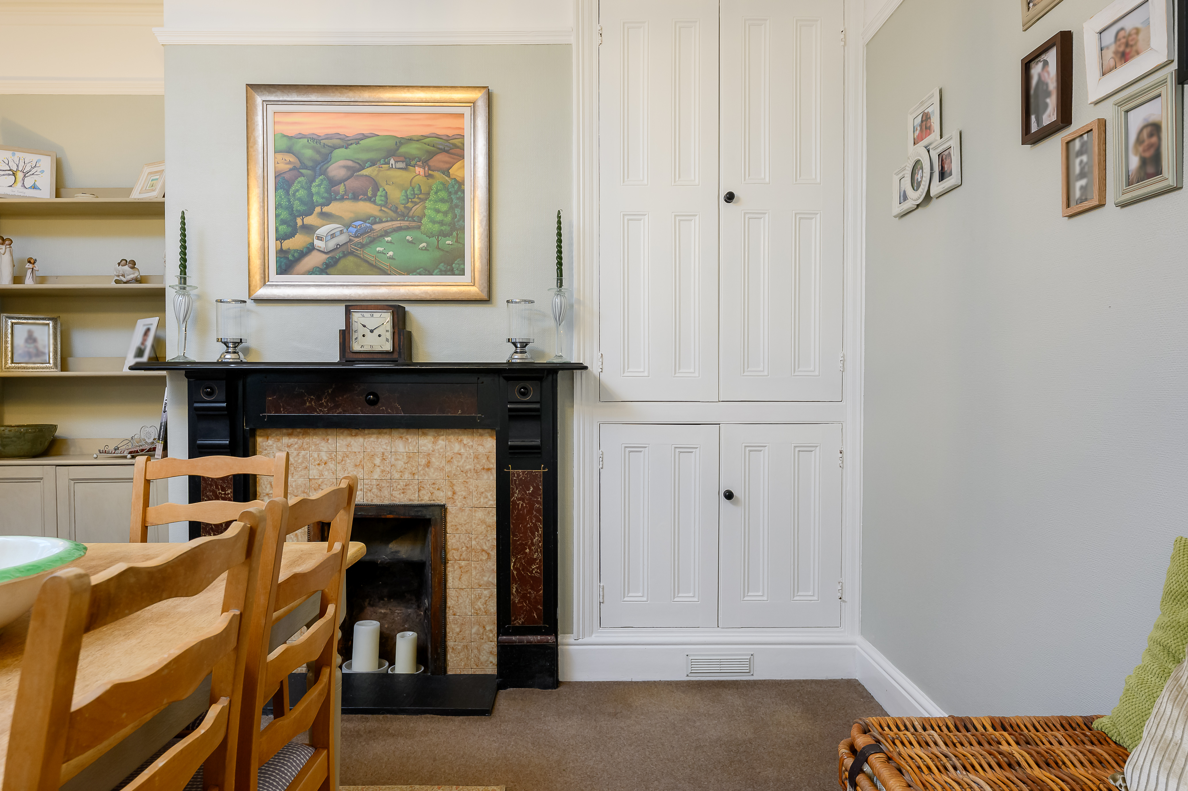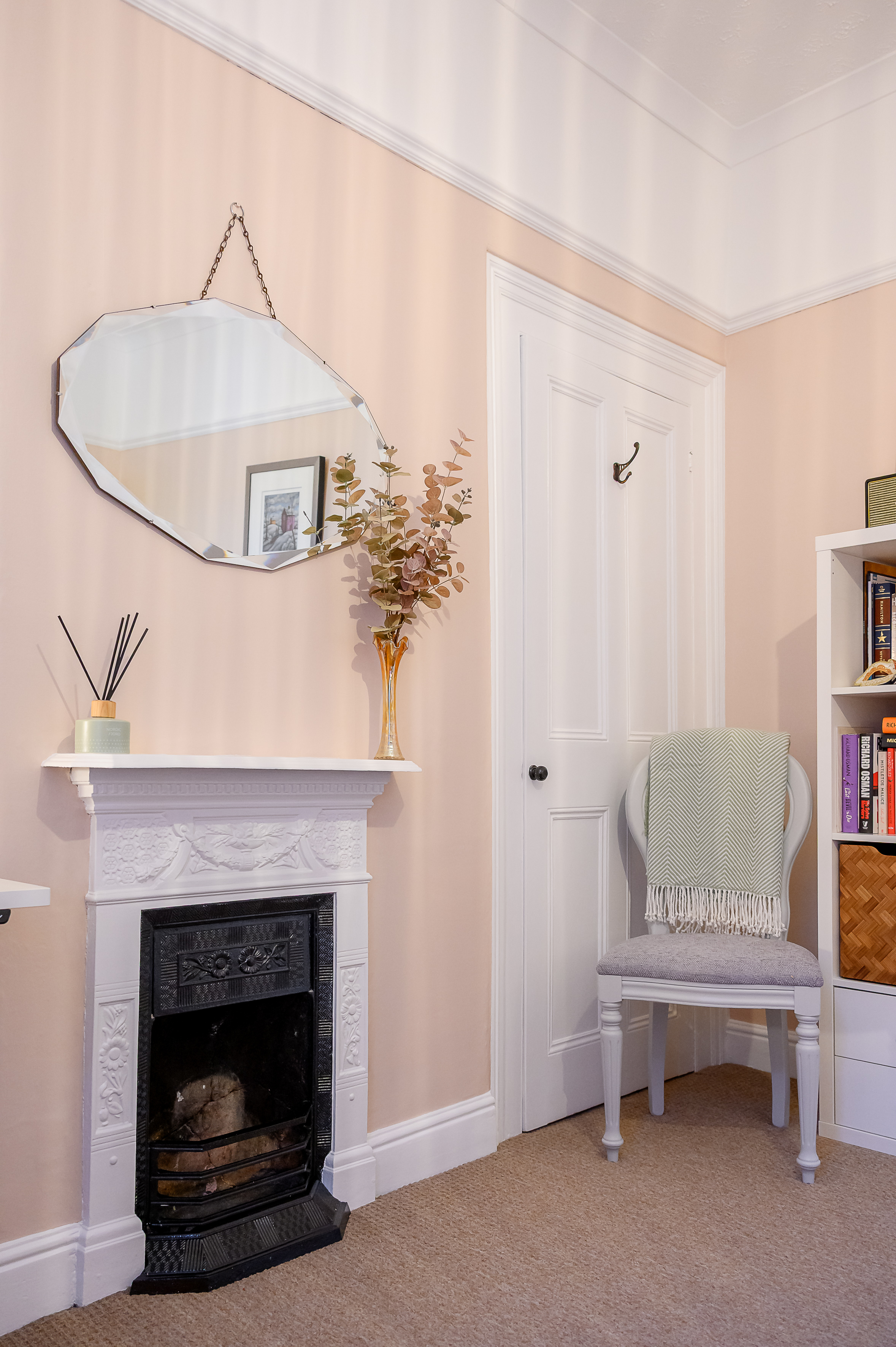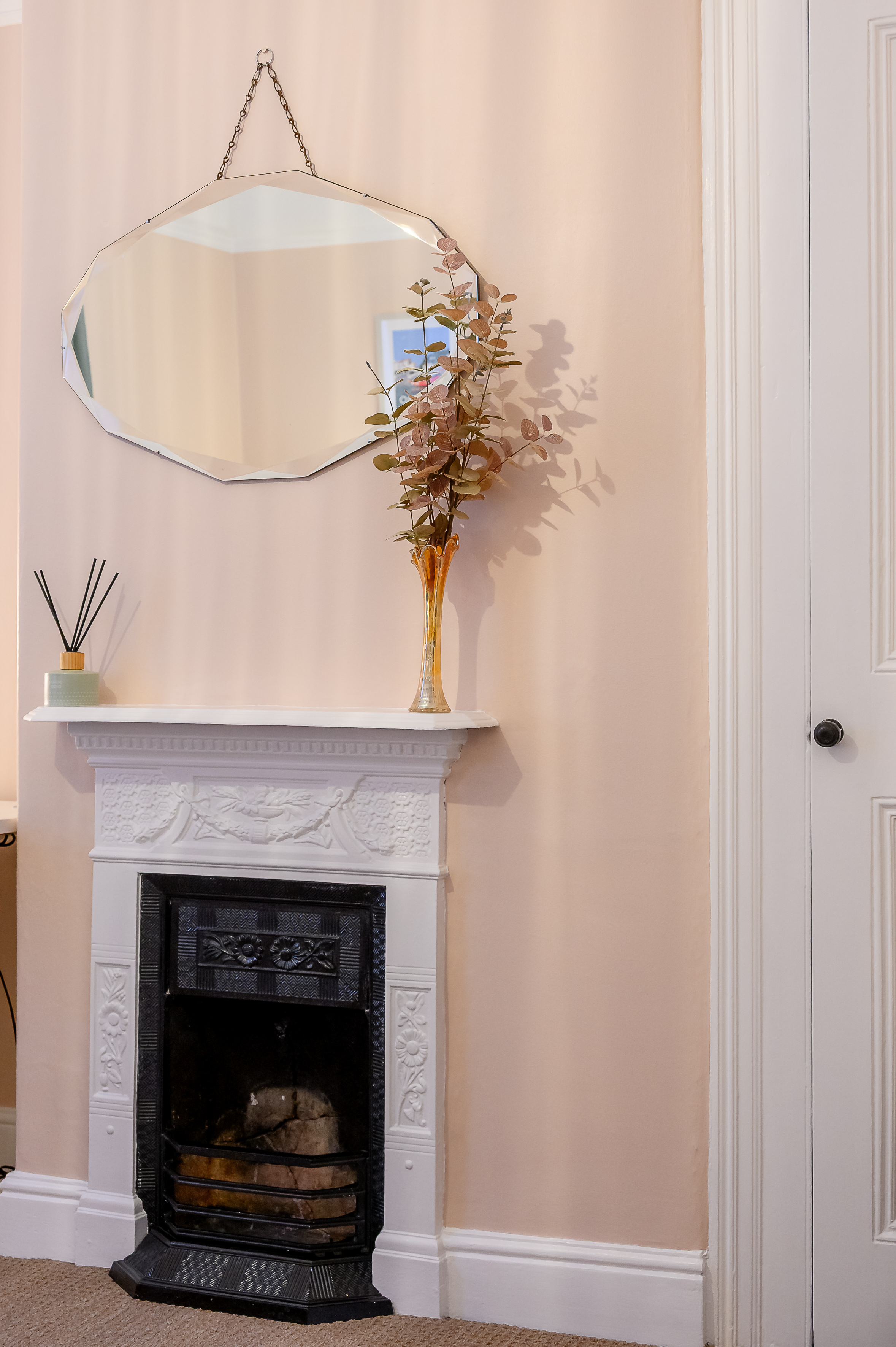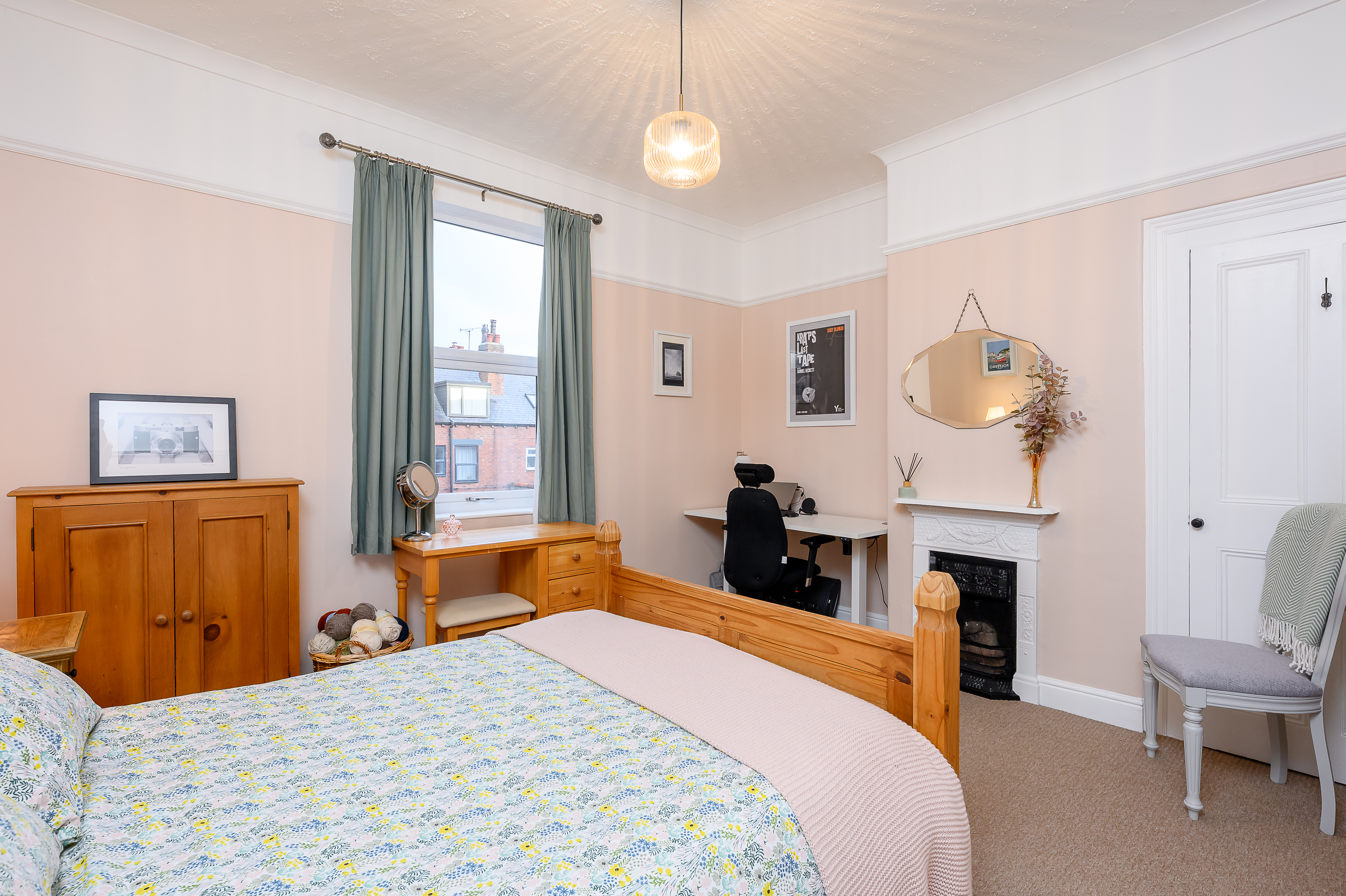 Bedroom Two: Another large double overlooking the rear yard, featuring a fitted cupboard within the alcove, picture rail, and a second cast iron decorative feature fireplace, decorated in peachy pink and white tones.