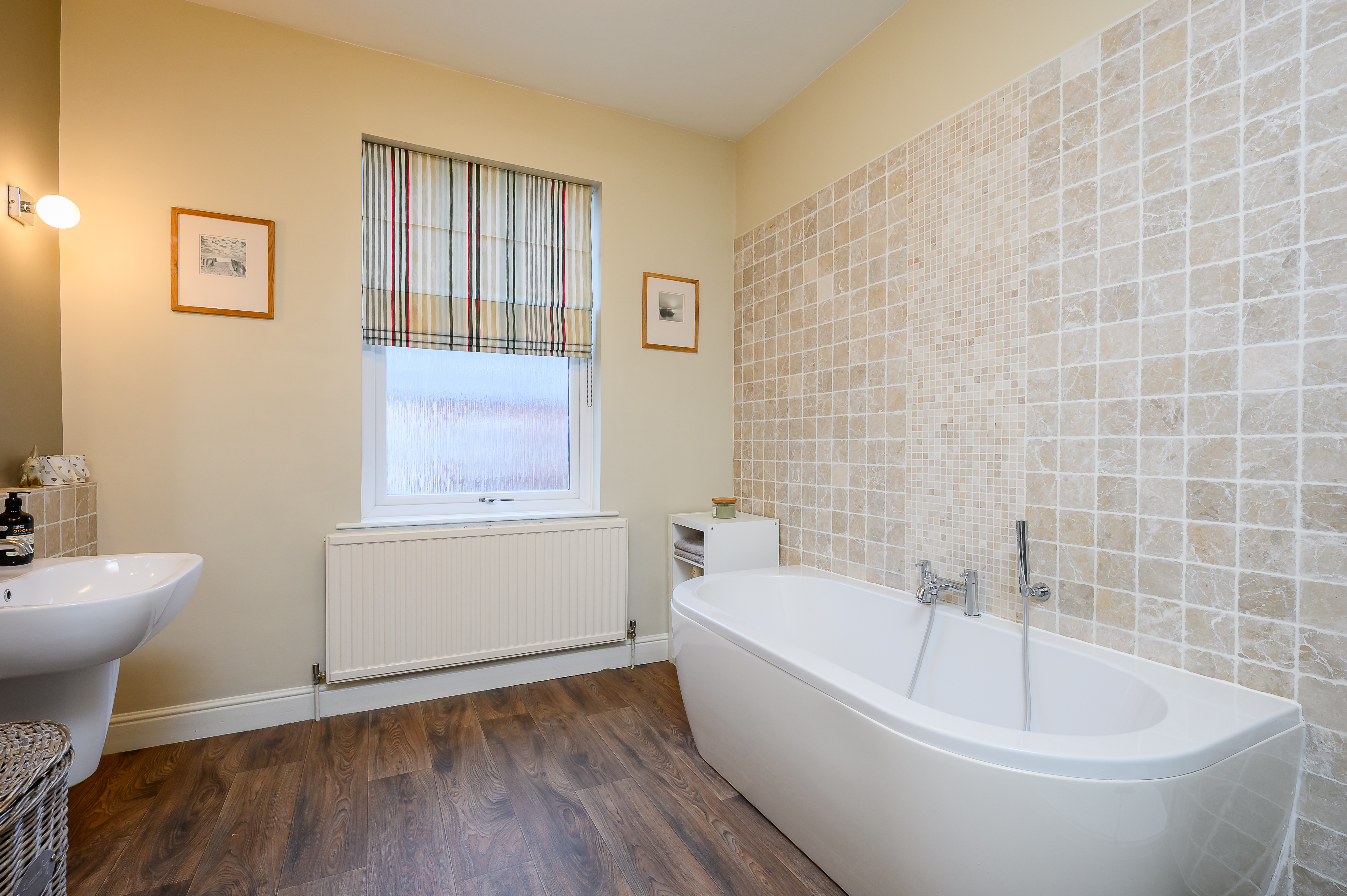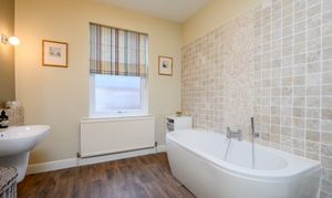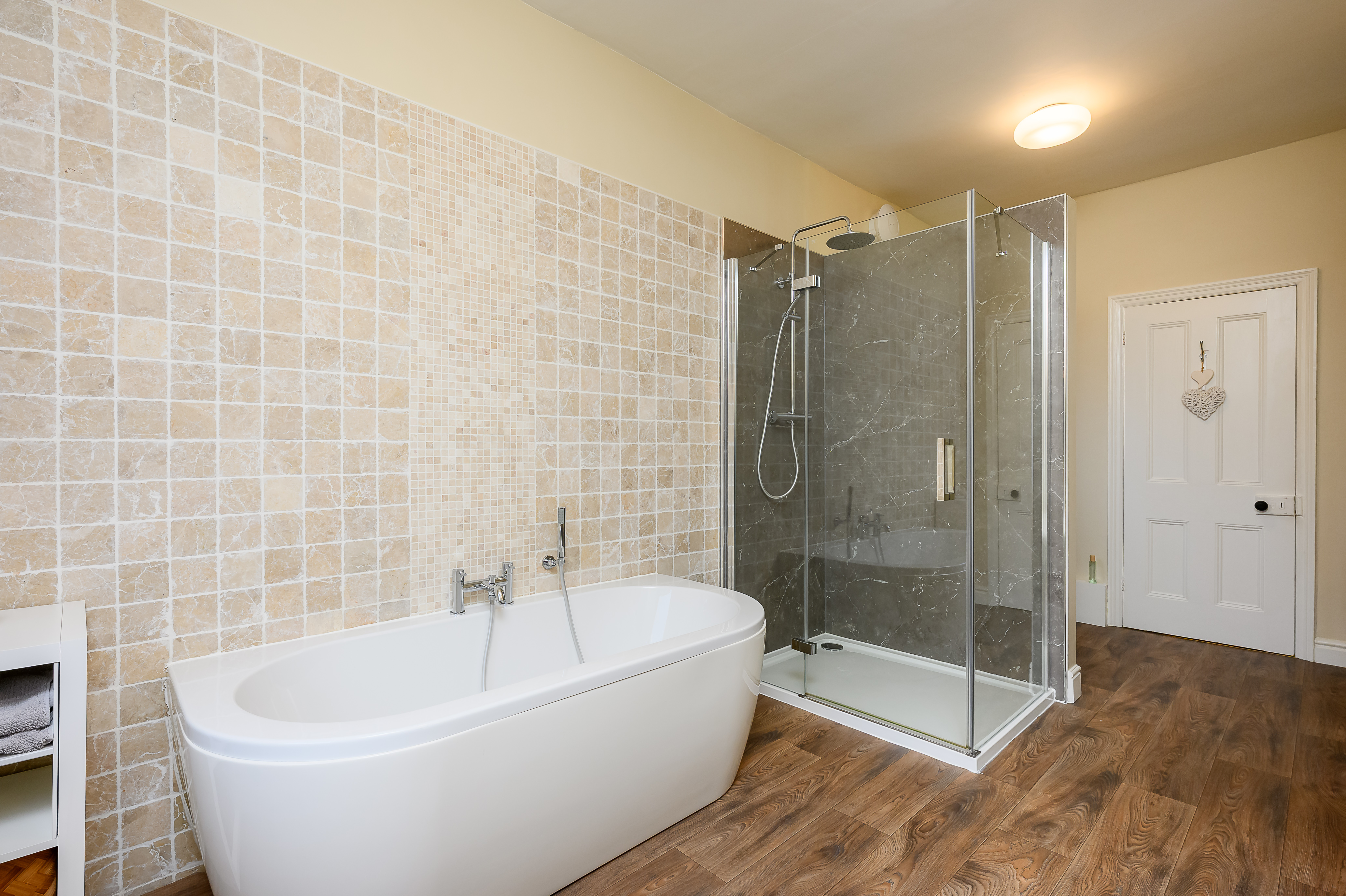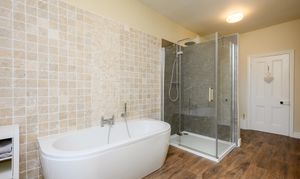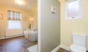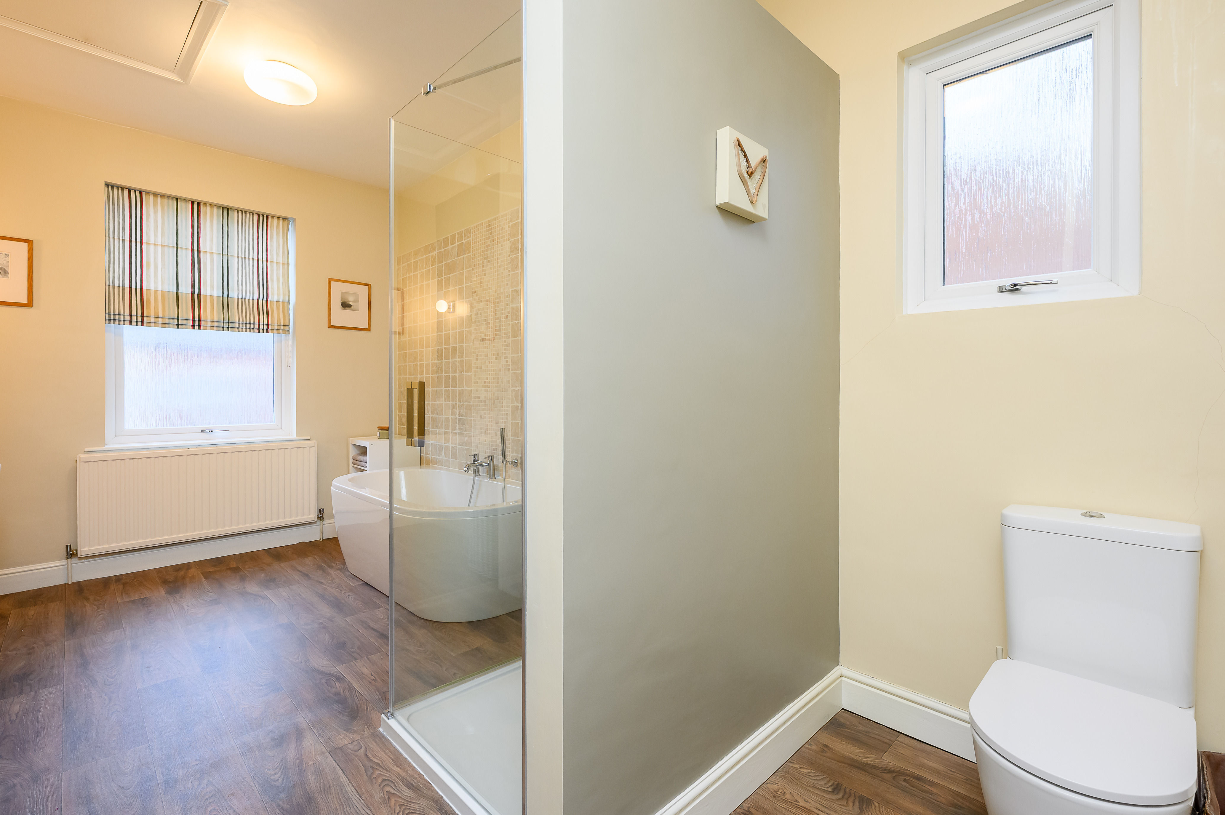 The exceptionally spacious and modern bathroom is accessed via steps up from the lower landing. It features a large walk-in shower with Mermaid board, a double-ended bath with handheld shower attachment, low-level WC, wall-mounted sink with mixer tap, heated towel rail, and part travertine tiled walls. Dual-aspect frosted windows ensure both light and privacy, and there is a useful floor to ceiling linen cupboard and access to the second loft, which is again boarded and comes complete with light.