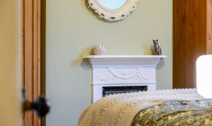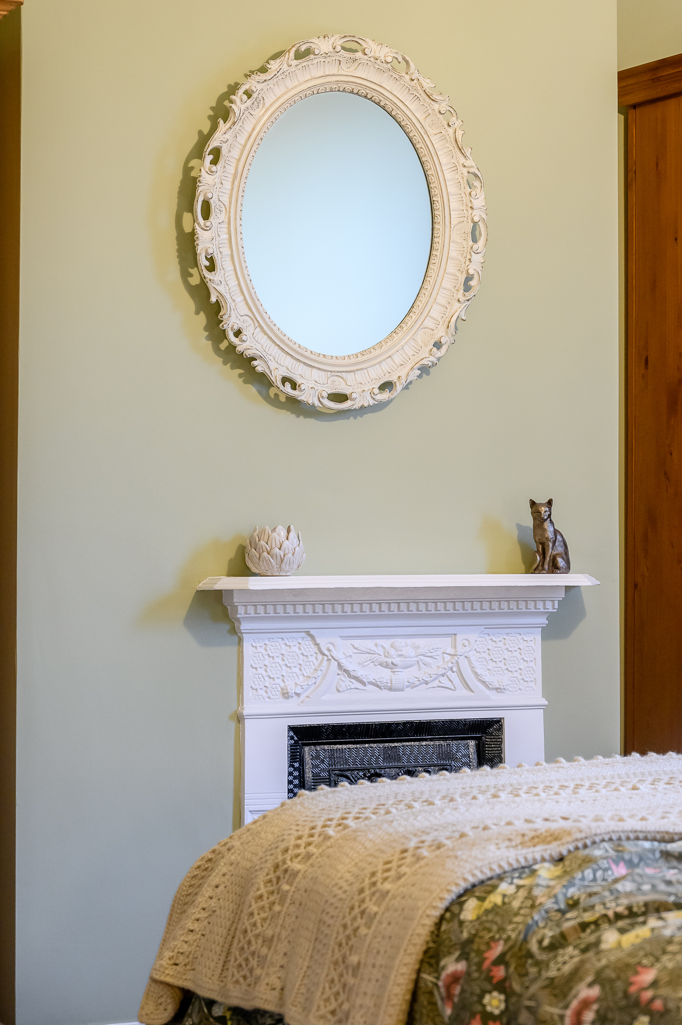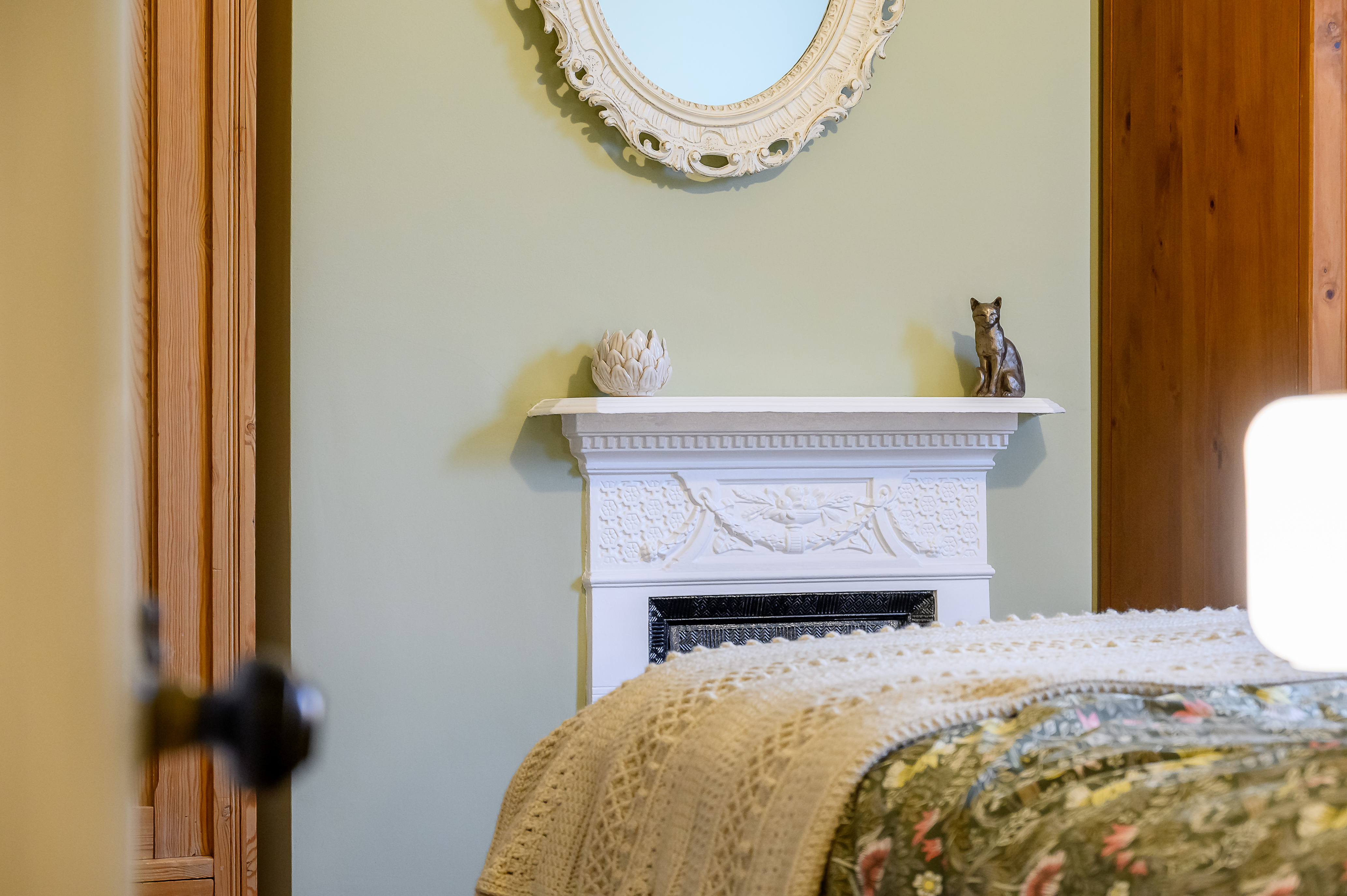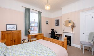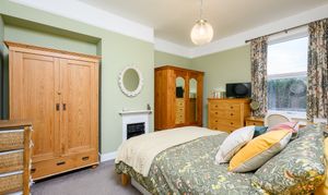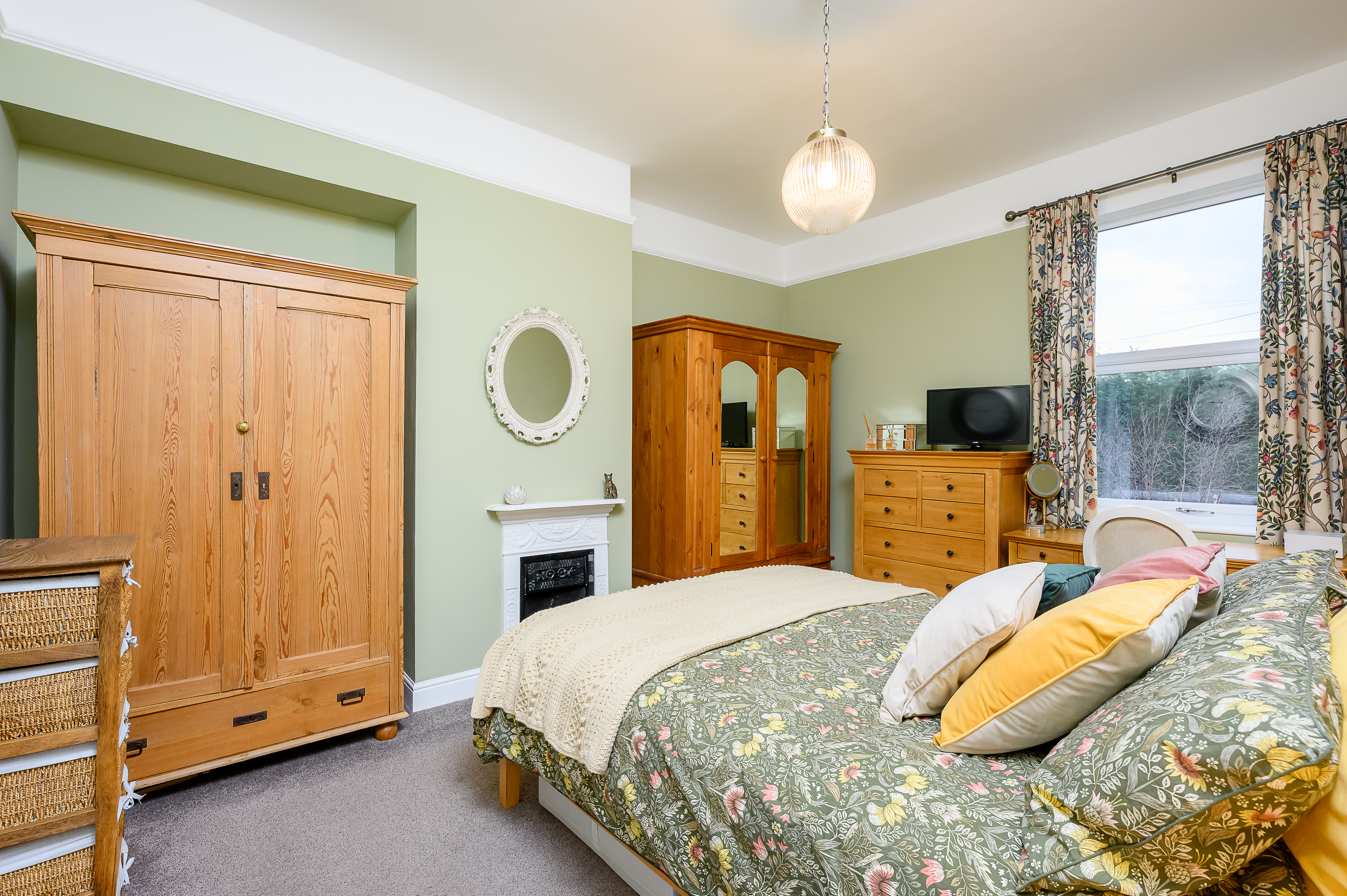 Principal Bedroom: A strikingly generous front-facing double with high ceilings, large window, picture rail, and a decorative cast iron fireplace, finished in soft sage green tones.