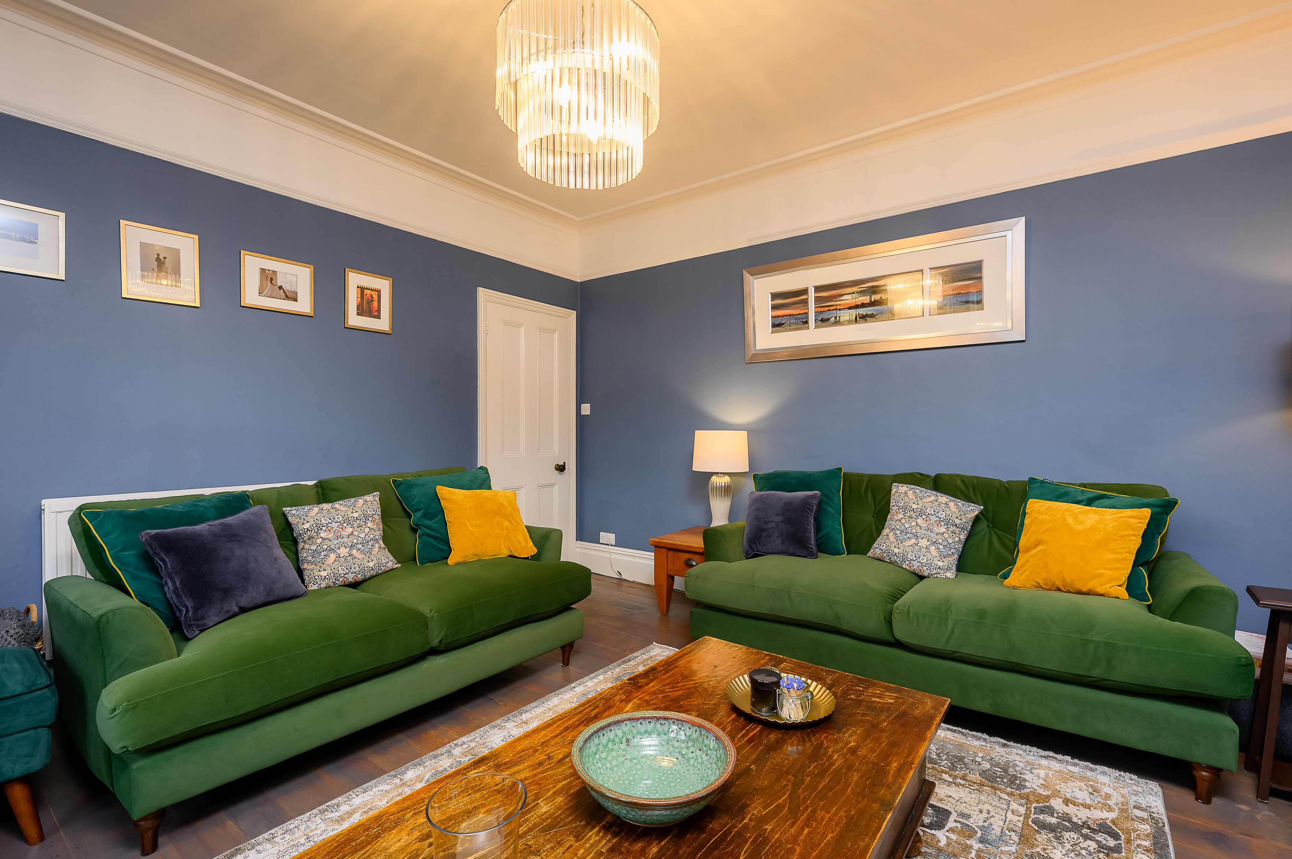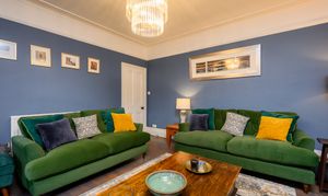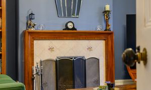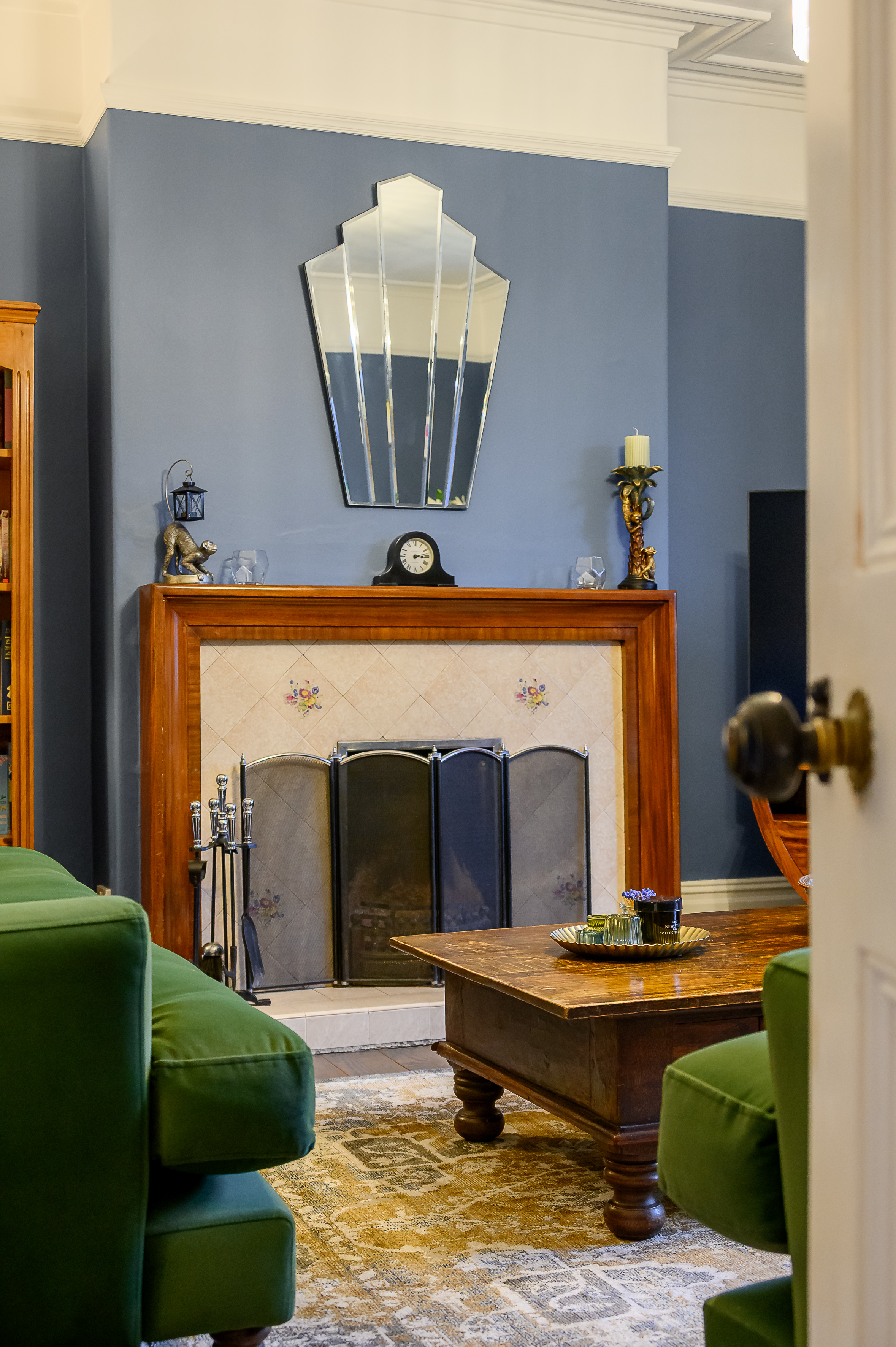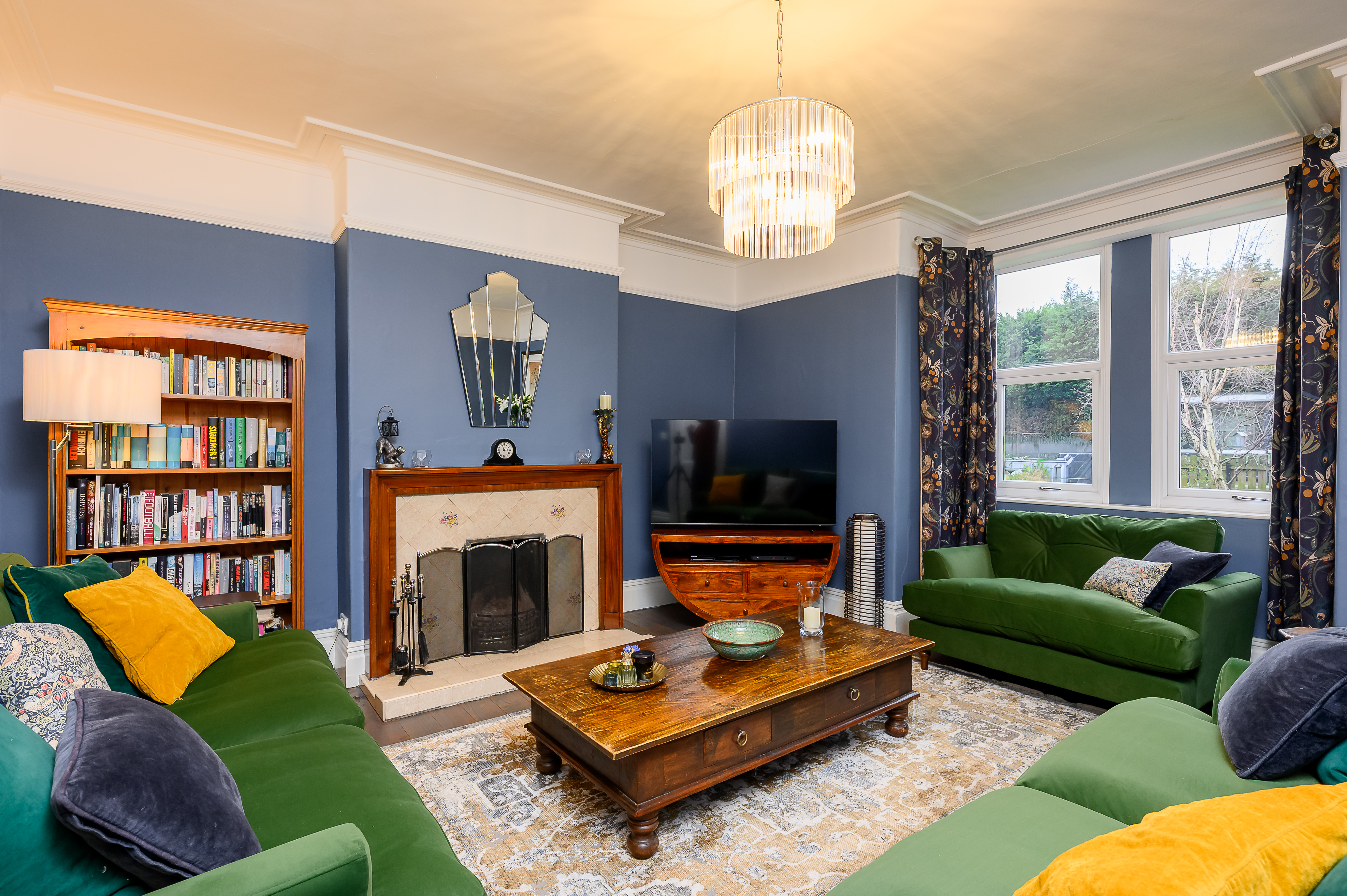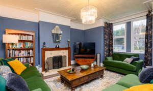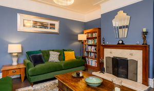 The front-facing lounge features a large box bay window overlooking the lawned frontage, flooding the room with natural light. Original floorboards, a feature open fireplace with tiled surround and wooden mantel, deep skirting boards, and high ceilings add to the room’s elegance. Finished in a rich Farrow & Ball colour-matched dark blue, this is a warm and inviting reception space, with plenty of room for freestanding furniture.