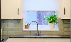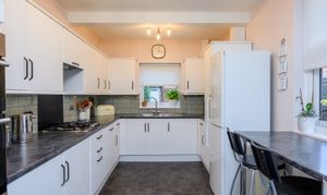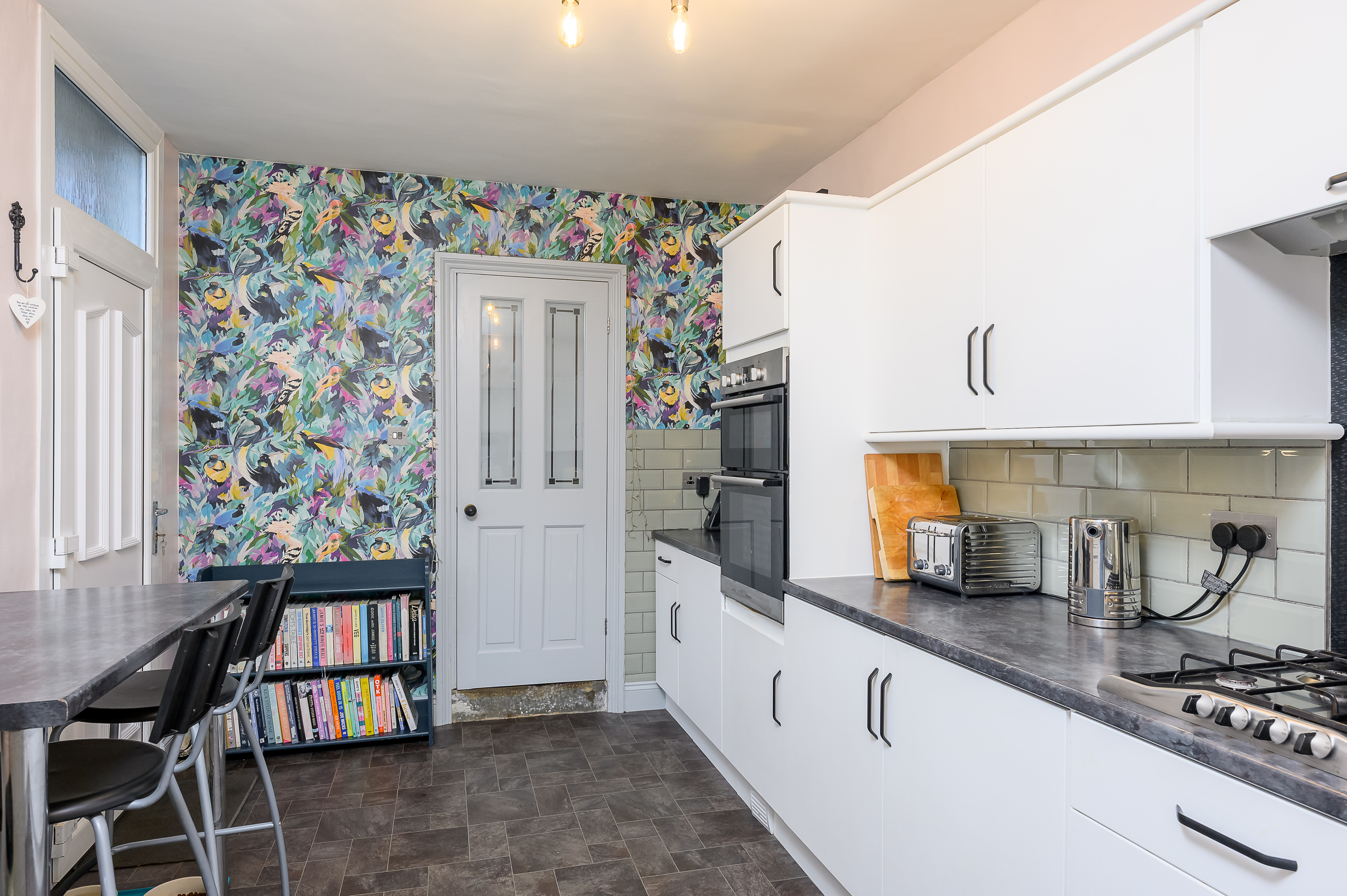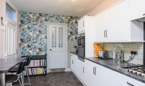Accessed via an original stone step, the kitchen has been thoughtfully designed with white base and wall units with contrasting laminate worktops over, complemented by a breakfast bar. Integrated appliances include a dishwasher, fridge and freezer, with space for a washing machine. The kitchen is equipped with a gas hob with extractor over, electric double oven, and finished with sage green metro-tiled splashbacks and feature wallpaper to one wall. Dual-aspect windows provide excellent natural light, while a UPVC door leads directly to the rear garden. The combi boiler is also located here, and an understairs cupboard provides excellent utility storage.