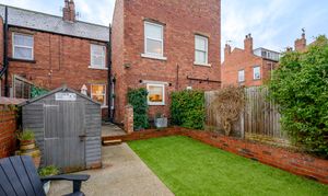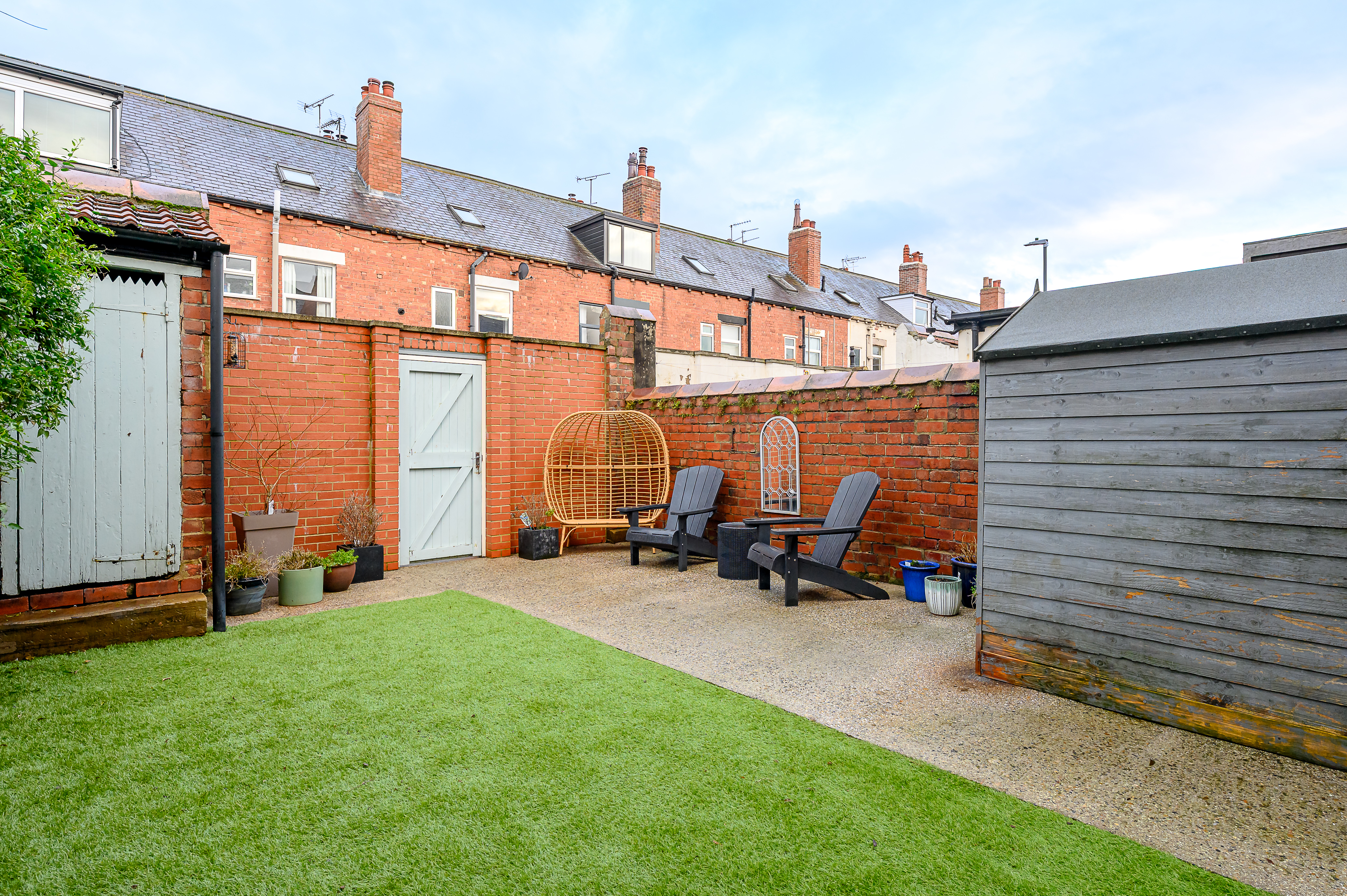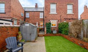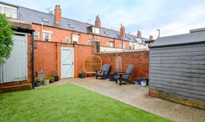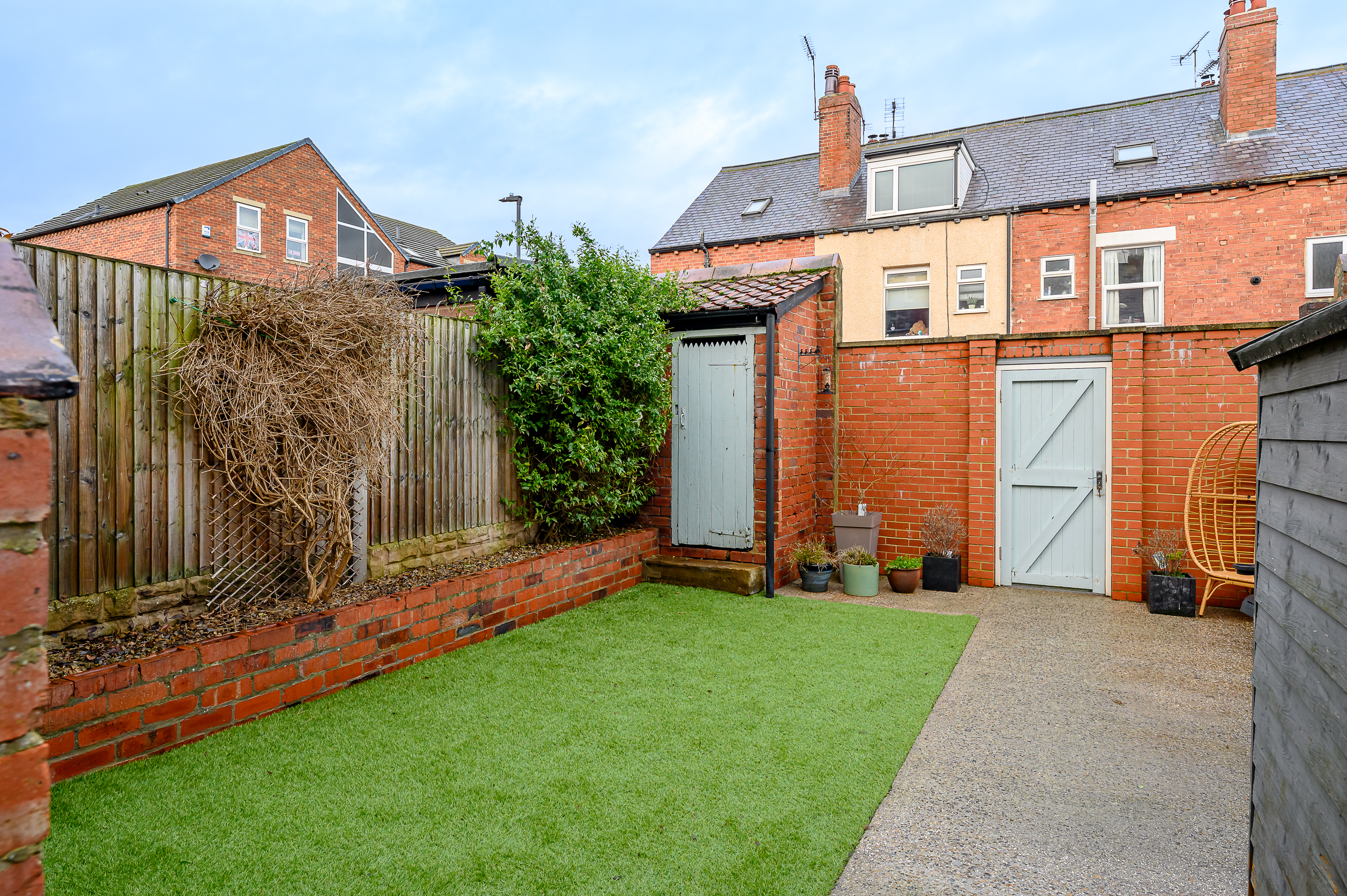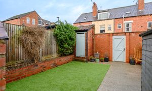 Externally to the rear is a low-maintenance courtyard-style garden with artificial grass and concrete, an external outhouse/shed, and retained original larder slabs, adding further character.