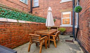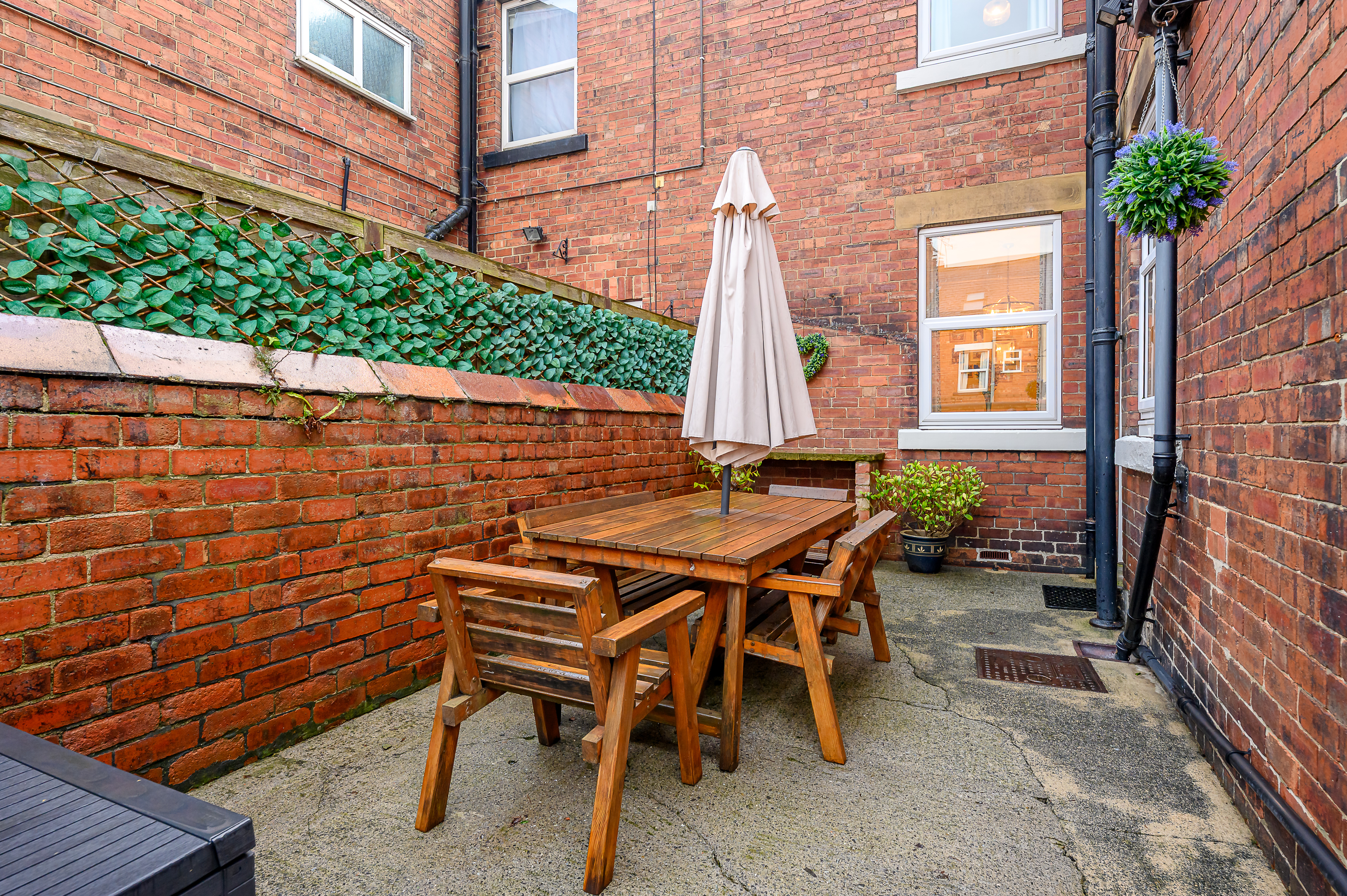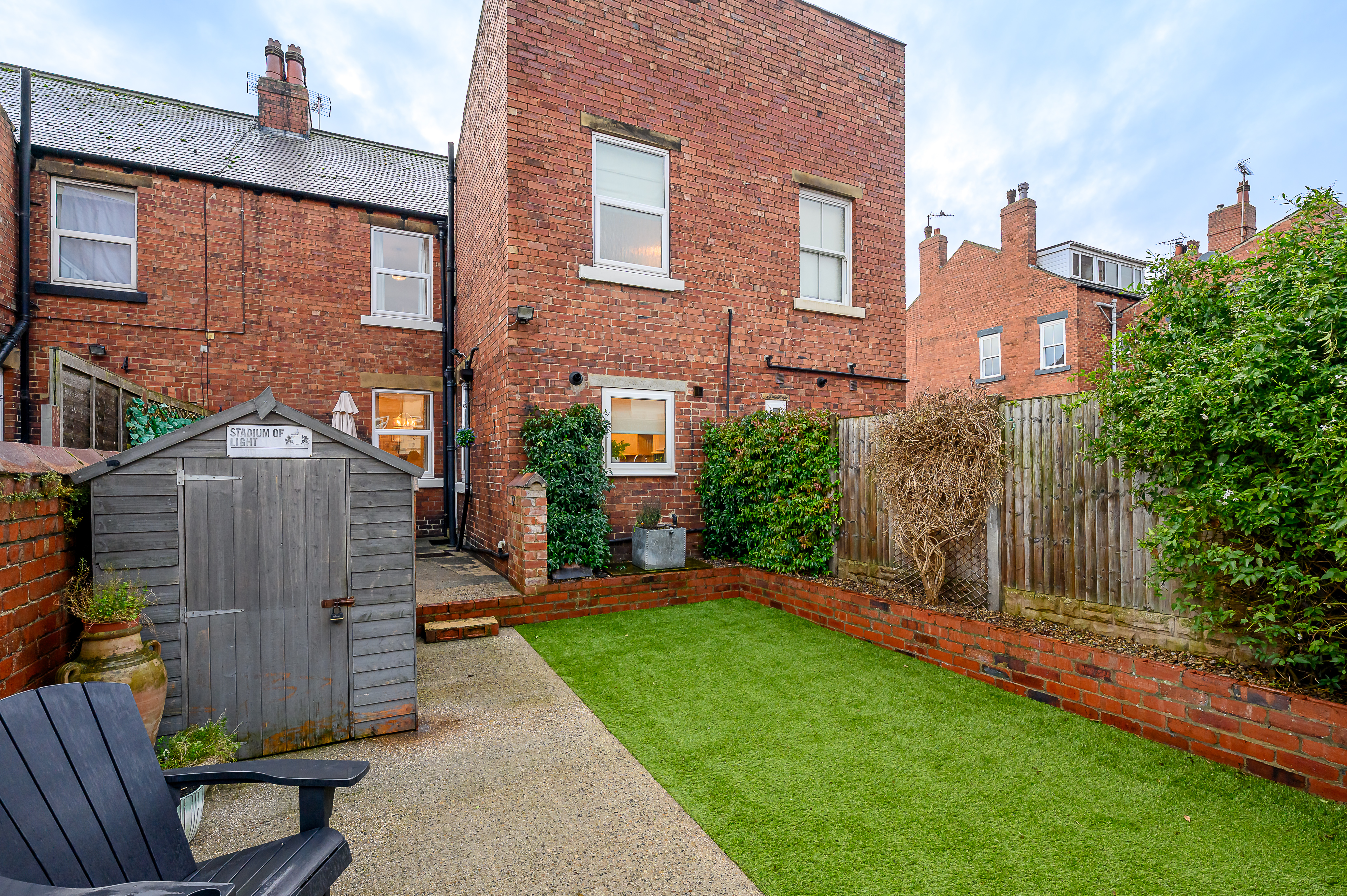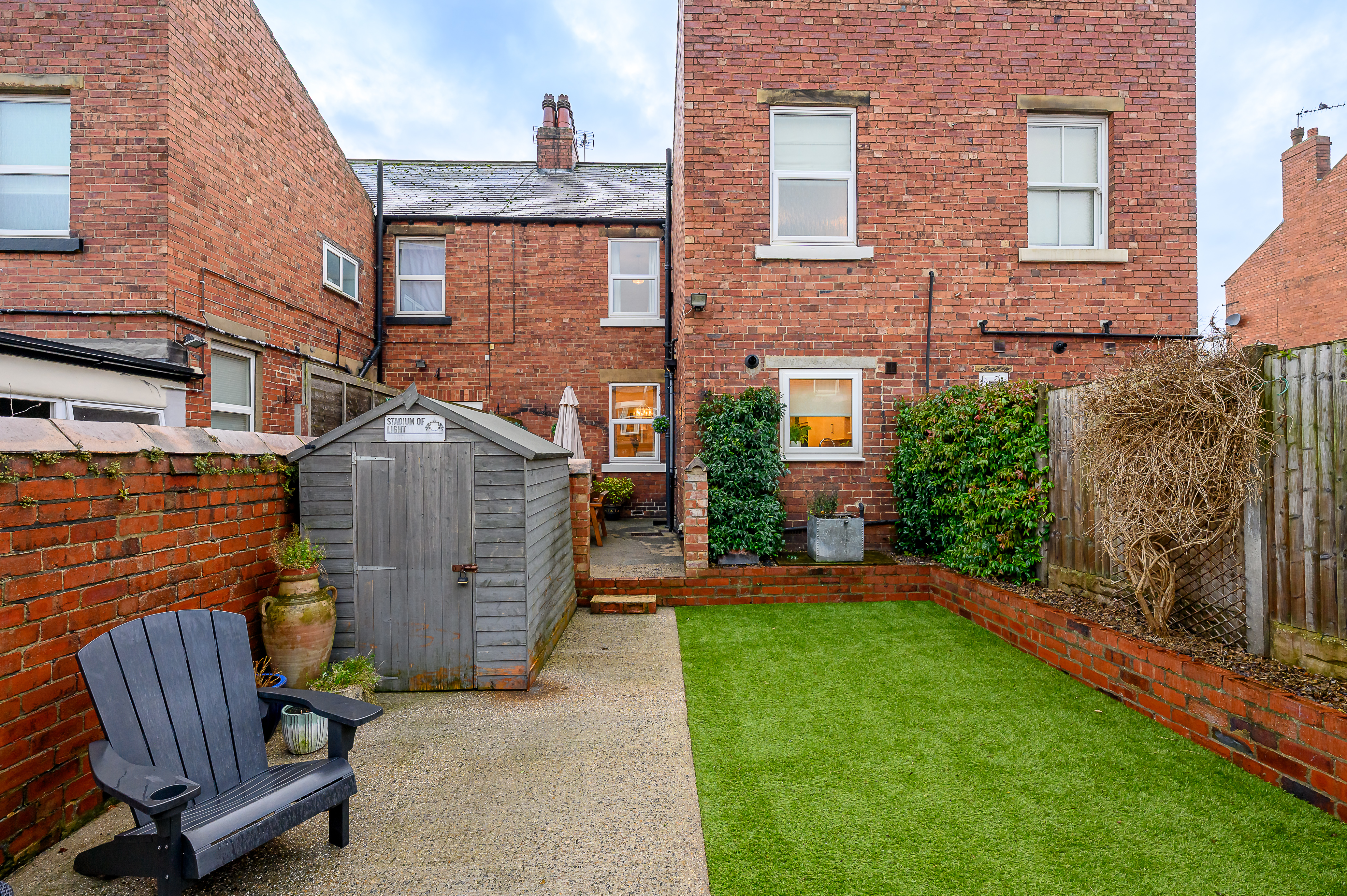 Externally to the rear is a low-maintenance courtyard-style garden with artificial grass and concrete, an external outhouse/shed, and retained original larder slabs, adding further character.