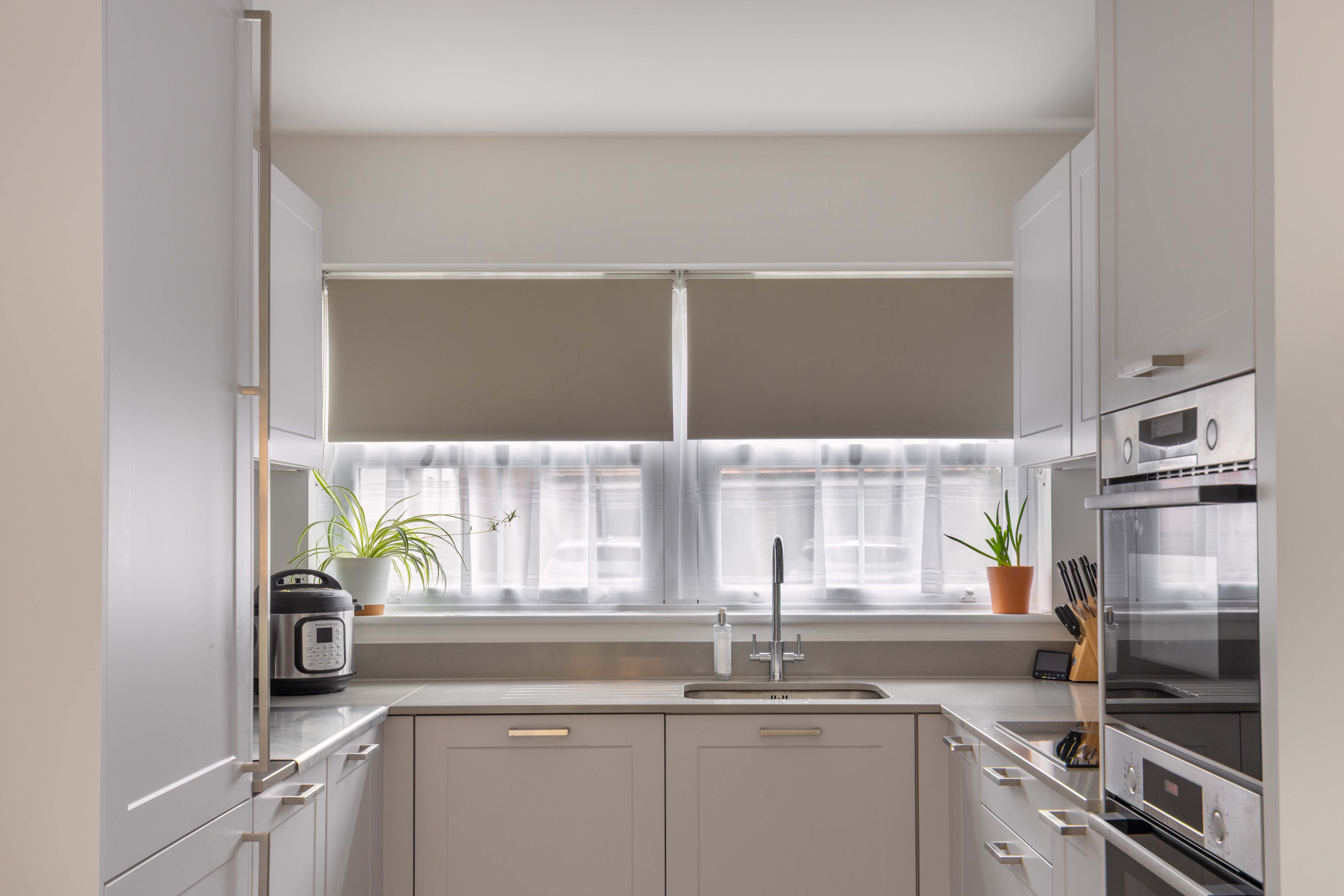 The interior is arranged across two floors, with a wide entrance hall in the centre which gives access to the principal rooms. To one side lies the generous living room, featuring a front bay window, and French doors to the garden. Opposite, the open plan kitchen and dining area is finished with light grey cabinetry, quartz worktops, with a full range of integrated appliances including a double oven, induction hob, fridge/freezer, and dishwasher. The dining space is generously proportioned, with double aspect windows and additional French doors to the rear garden. The ground floor also includes a cloakroom and custom storage beneath the stairs.