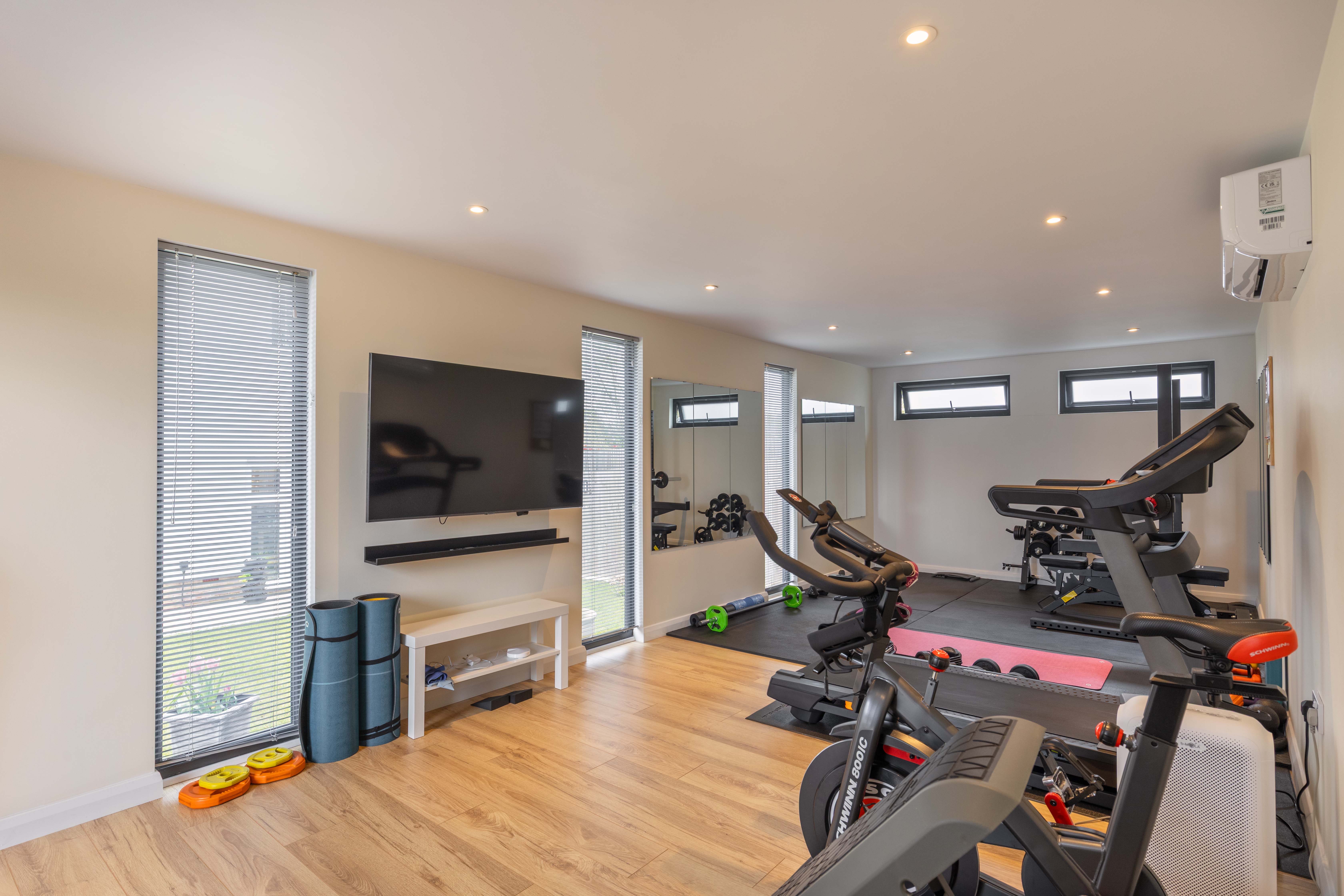 To the rear of the property, the garden is a particular feature, being well-sized, south-facing, and beautifully landscaped by the current owners to include a terrace, a variety of planting, a generous lawn, and a fully equipped garden studio with air conditioning, currently used as a gym and workspace.